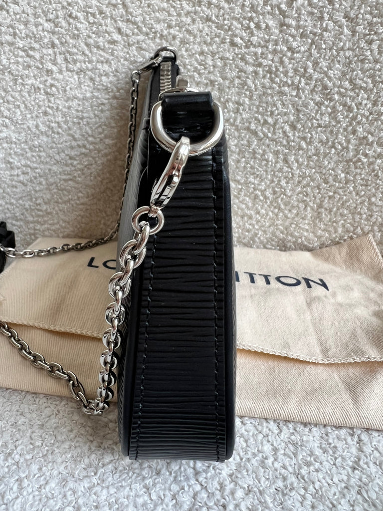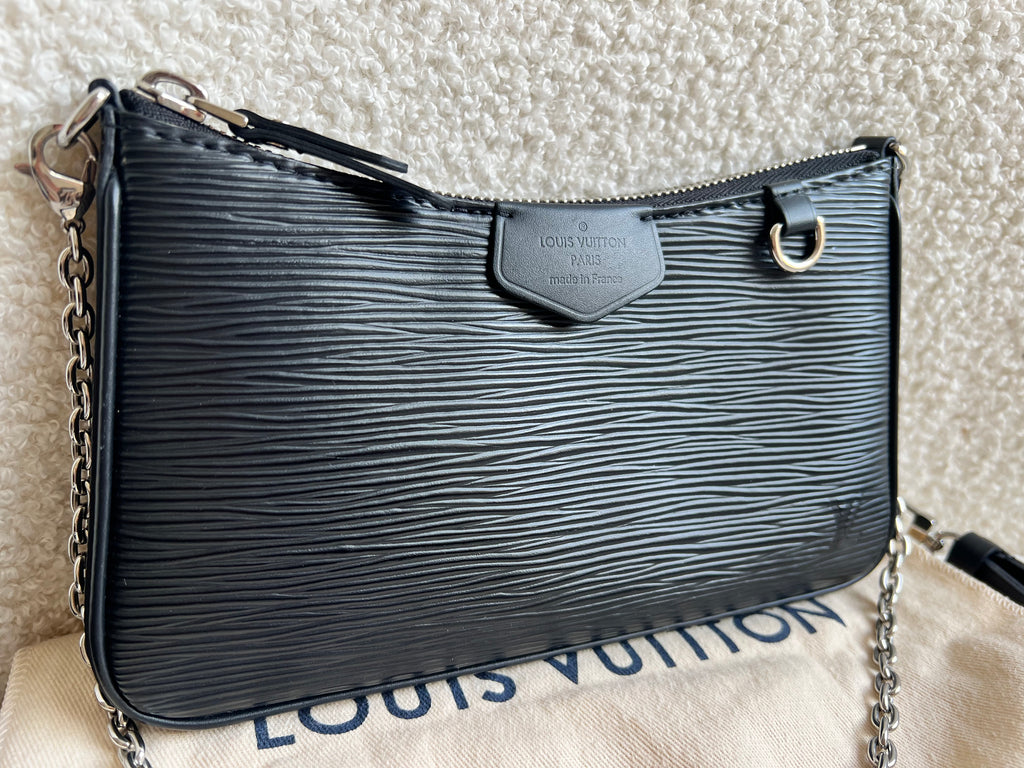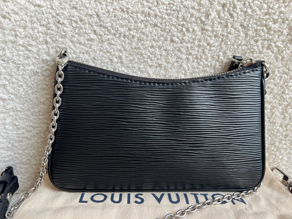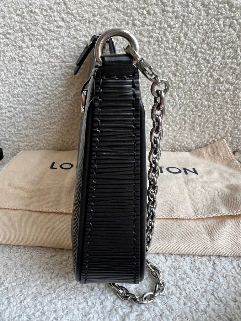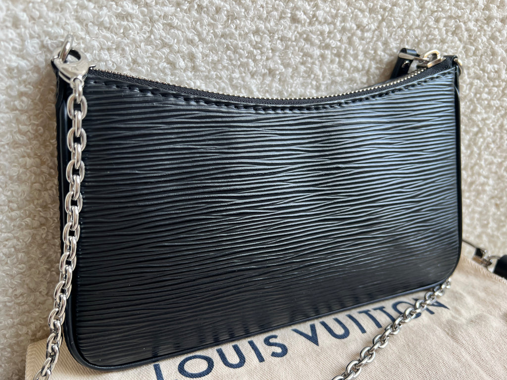 Louis Vuitton Easy Pouch in Black Epi leather with silver hardware. The sleek design lends itself beautifully to the sleek textured Epi leather. It can be worn on the shoulder, with the chain or the strap for a short carry or cross-body as the leather strap is adjustable. Microchip bag. Can be worn over the shoulder or cross body using the leather strap, or in the crook of the arm or by hand using the shorter chain strap.