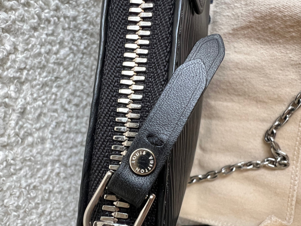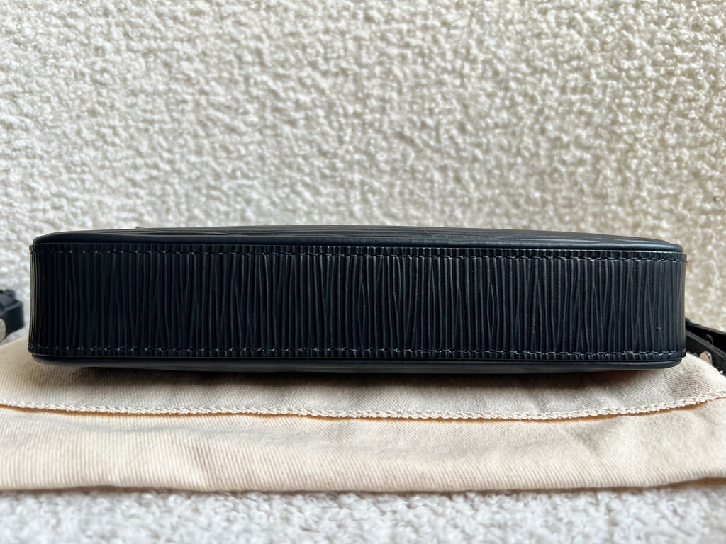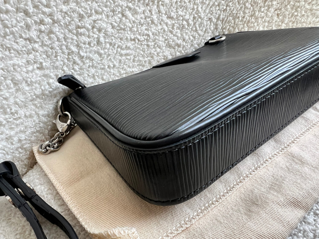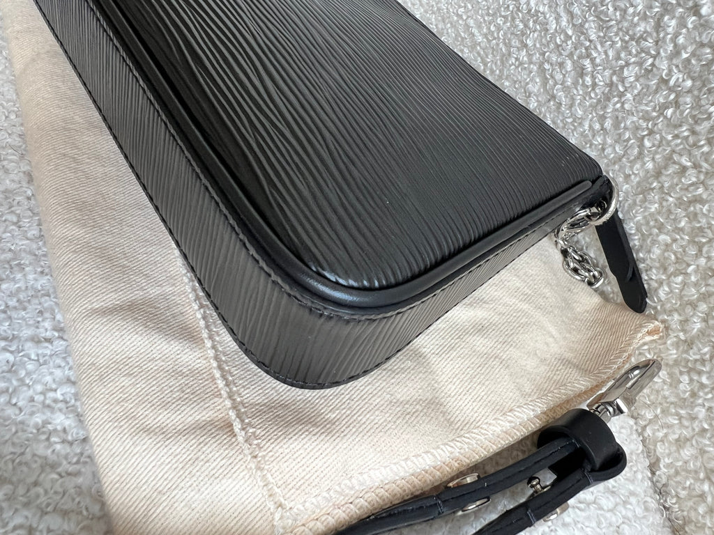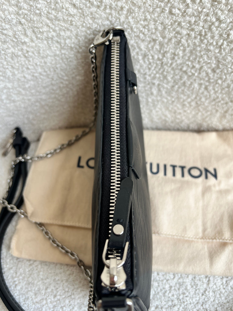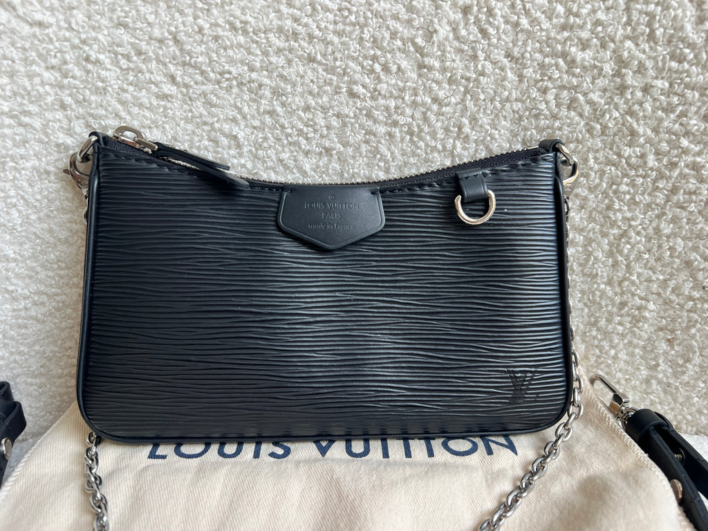 Louis Vuitton Easy Pouch in Black Epi leather with silver hardware. The sleek design lends itself beautifully to the sleek textured Epi leather. It can be worn on the shoulder, with the chain or the strap for a short carry or cross-body as the leather strap is adjustable. Microchip bag. Can be worn over the shoulder or cross body using the leather strap, or in the crook of the arm or by hand using the shorter chain strap.