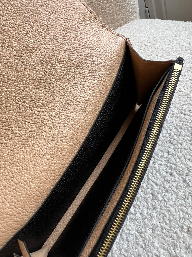 Louis Vuitton Emilie Wallet in Black Empreinte Monogram and beige interior with gold hardware. Its envelope-style flap, which is secured with a color-matched press-stud, lifts to reveal a well-organized interior with a large compartment, zipped coin pocket and card slots.