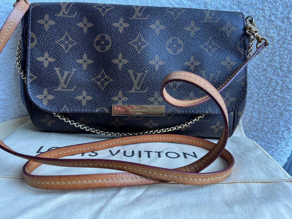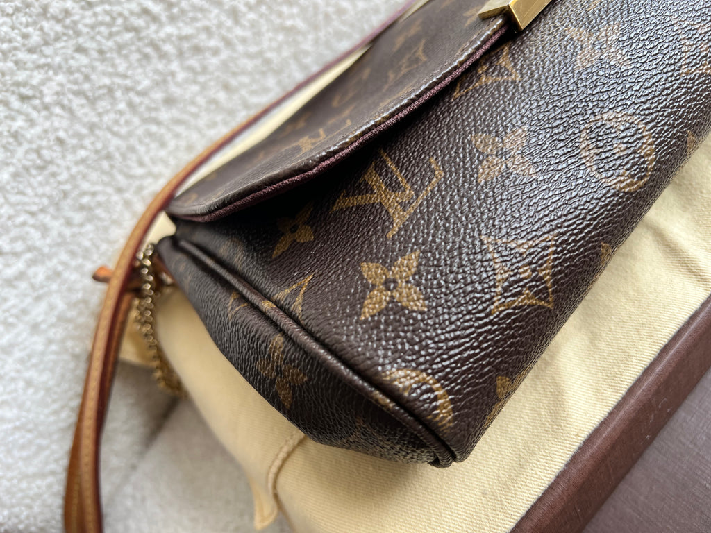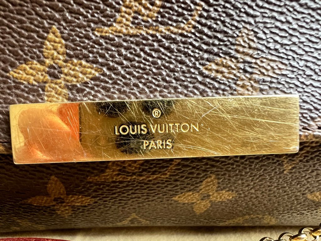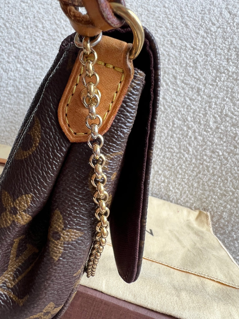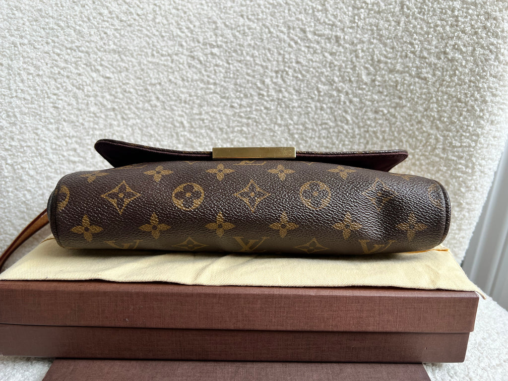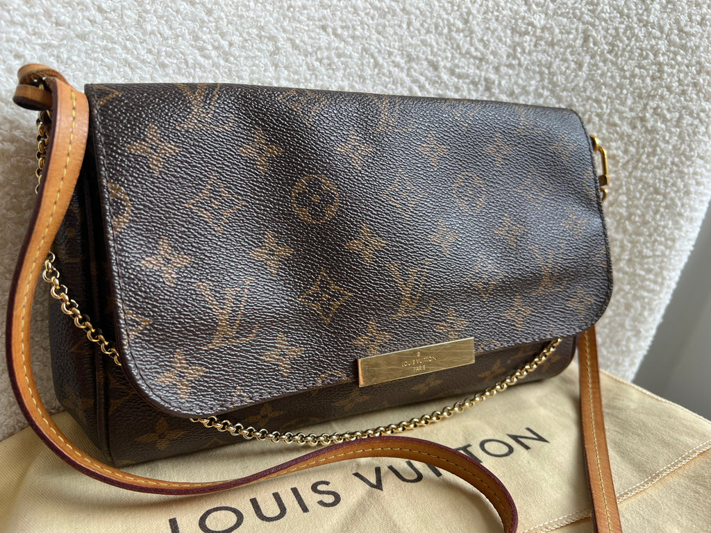 Louis Vuitton Favorite MM in Monogram Canvas with gold hardware. The larger of the two sizes of the Favorite, the MM is perfect for carrying the essentials for day to evening use. Can be carried as a clutch, worn as a short-shoulder bag using the golden chain, or carried casually cross body using the detachable shoulder strap. The engraved front plate conceals a secure magnetic closure. Now discontinued, this popular style is only available on the preloved market.
