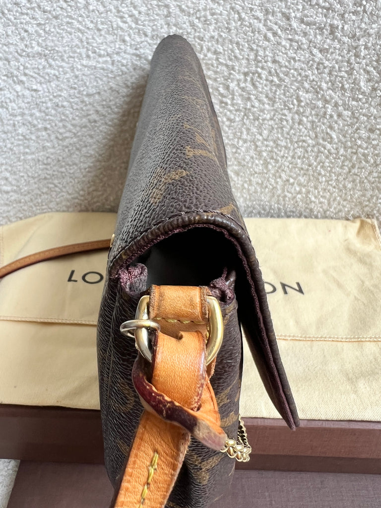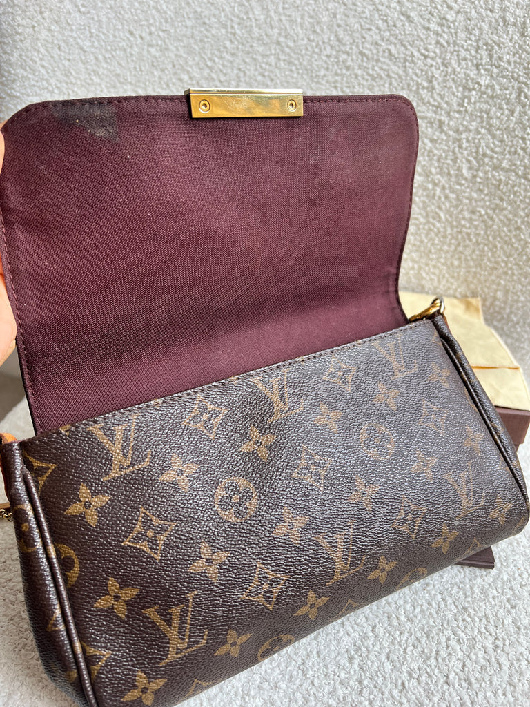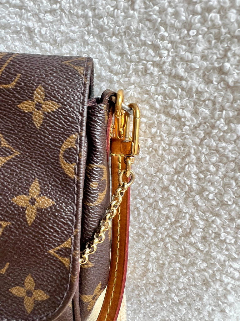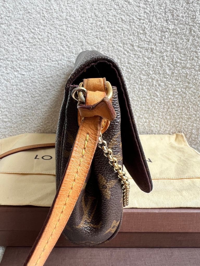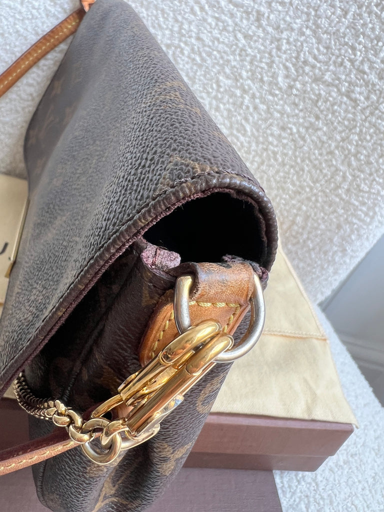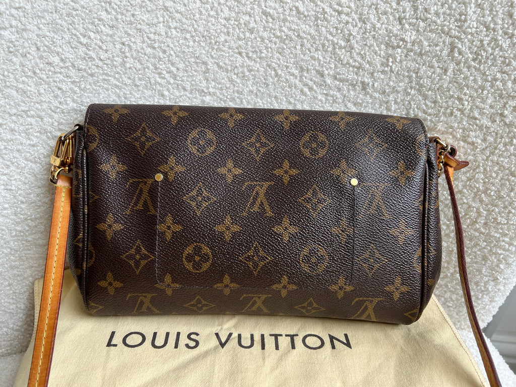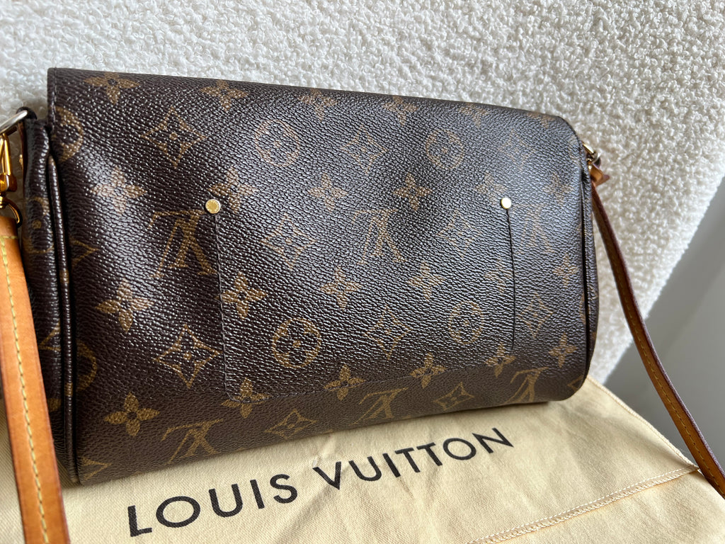 Louis Vuitton Favorite MM in Monogram Canvas with gold hardware. The larger of the two sizes of the Favorite, the MM is perfect for carrying the essentials for day to evening use. Can be carried as a clutch, worn as a short-shoulder bag using the golden chain, or carried casually cross body using the detachable shoulder strap. The engraved front plate conceals a secure magnetic closure. Now discontinued, this popular style is only available on the preloved market.