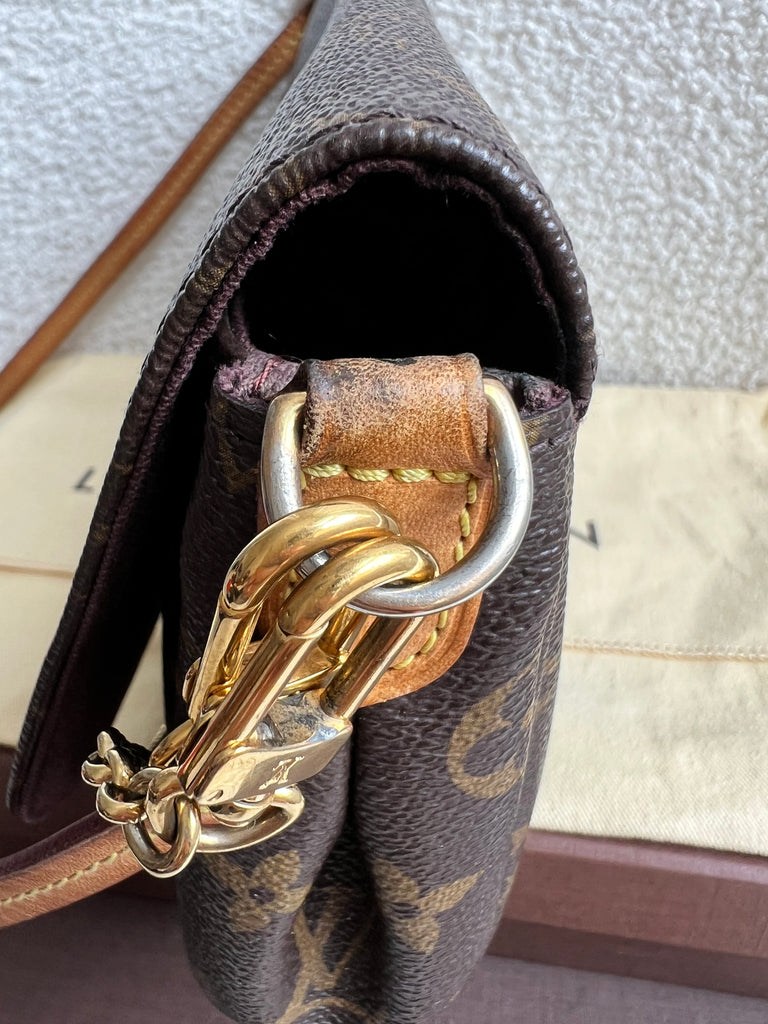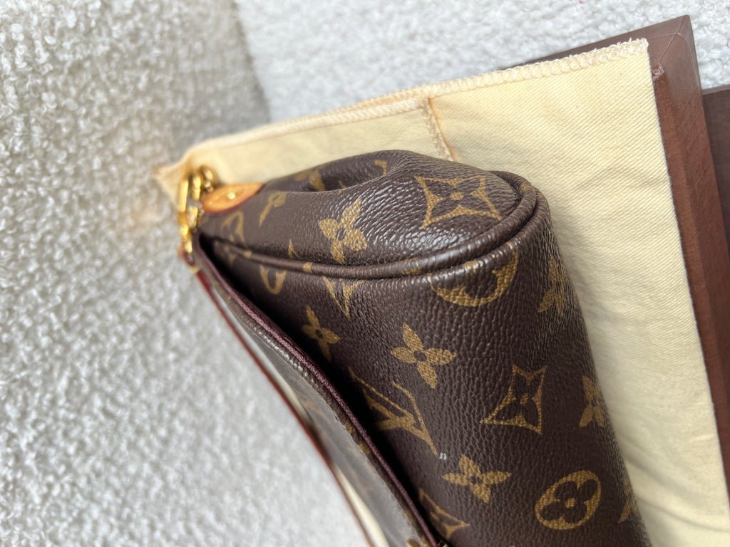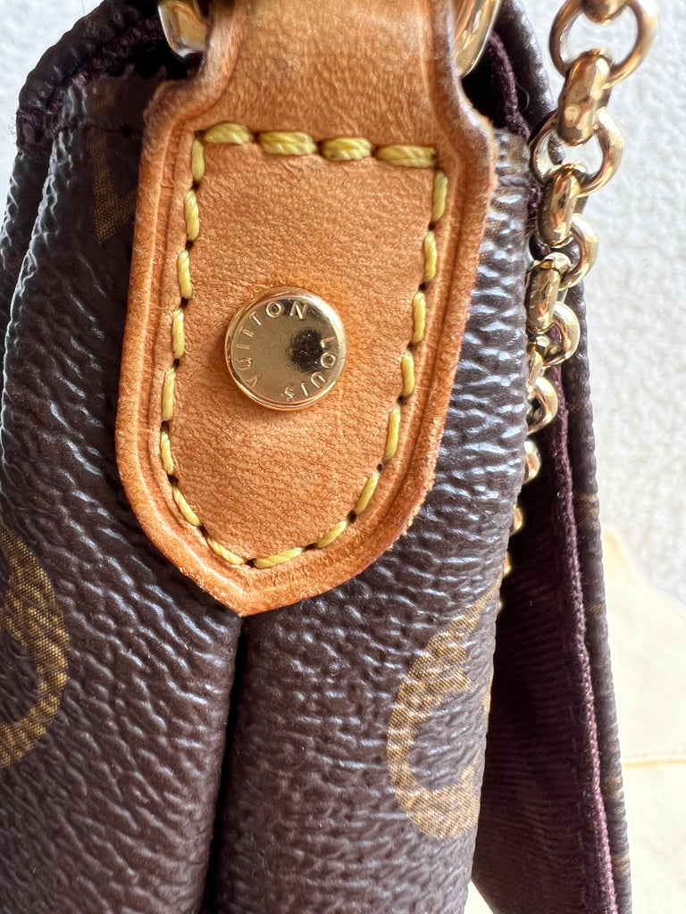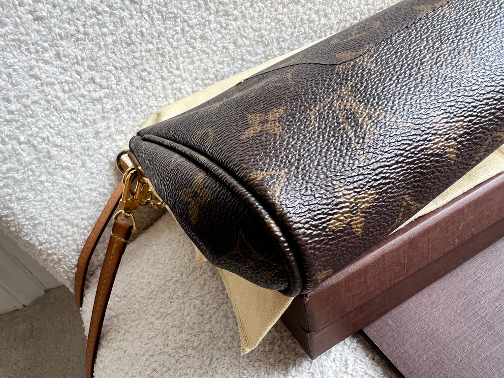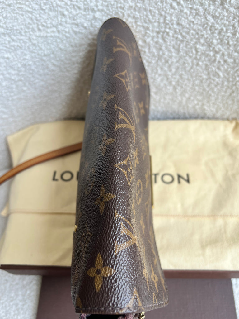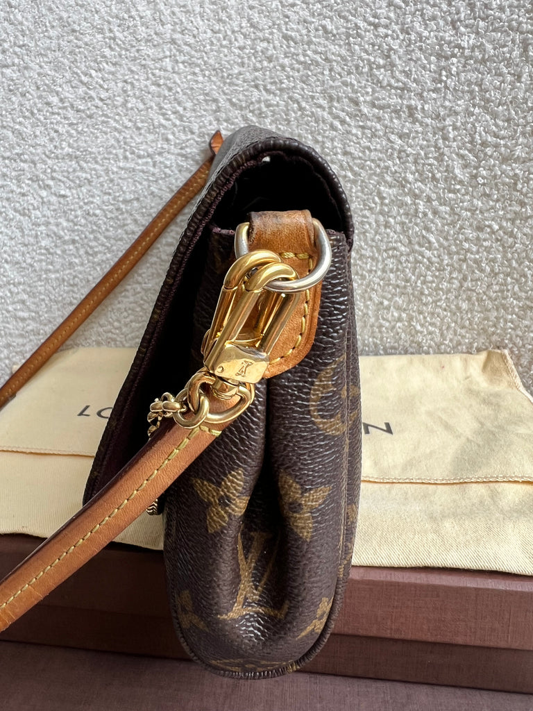 Louis Vuitton Favorite MM in Monogram Canvas with gold hardware. The larger of the two sizes of the Favorite, the MM is perfect for carrying the essentials for day to evening use. Can be carried as a clutch, worn as a short-shoulder bag using the golden chain, or carried casually cross body using the detachable shoulder strap. The engraved front plate conceals a secure magnetic closure. Now discontinued, this popular style is only available on the preloved market.