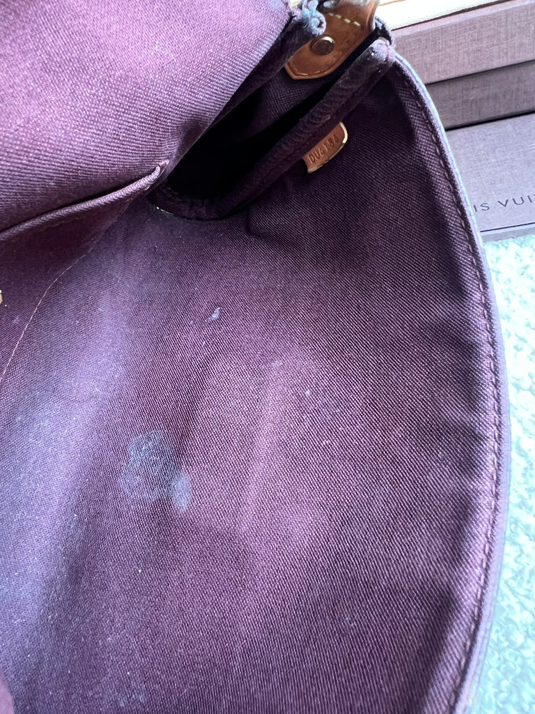 Hardware: Good condition with inevitable scratches to plaque and tarnishing to d rings and chain strap.