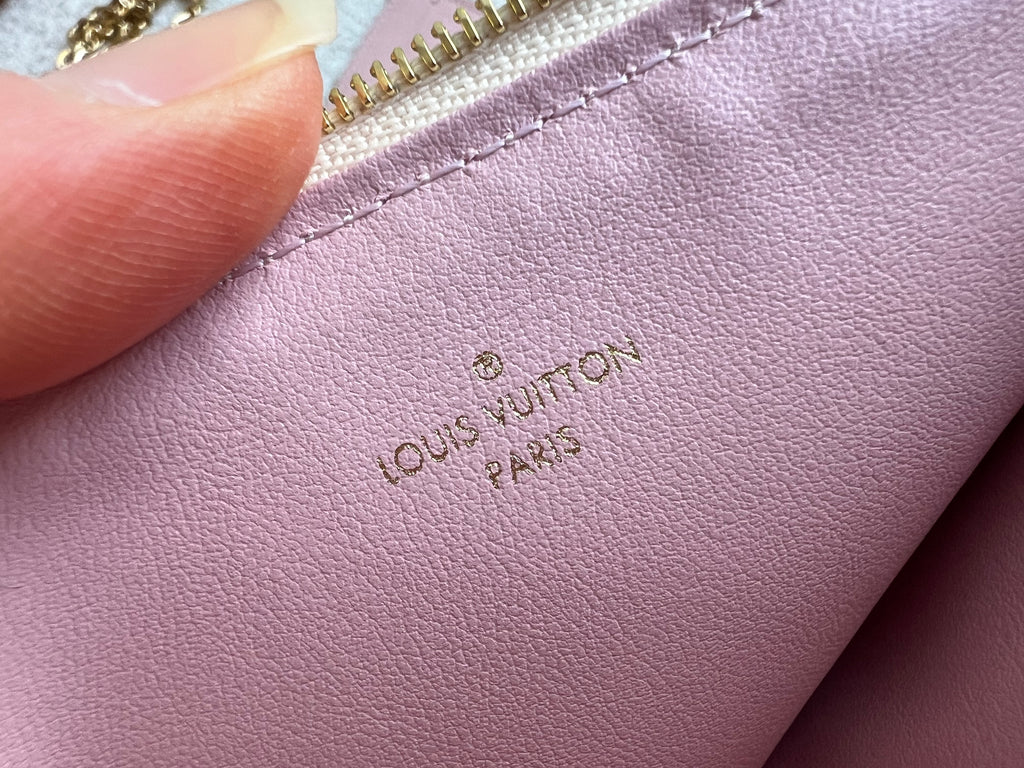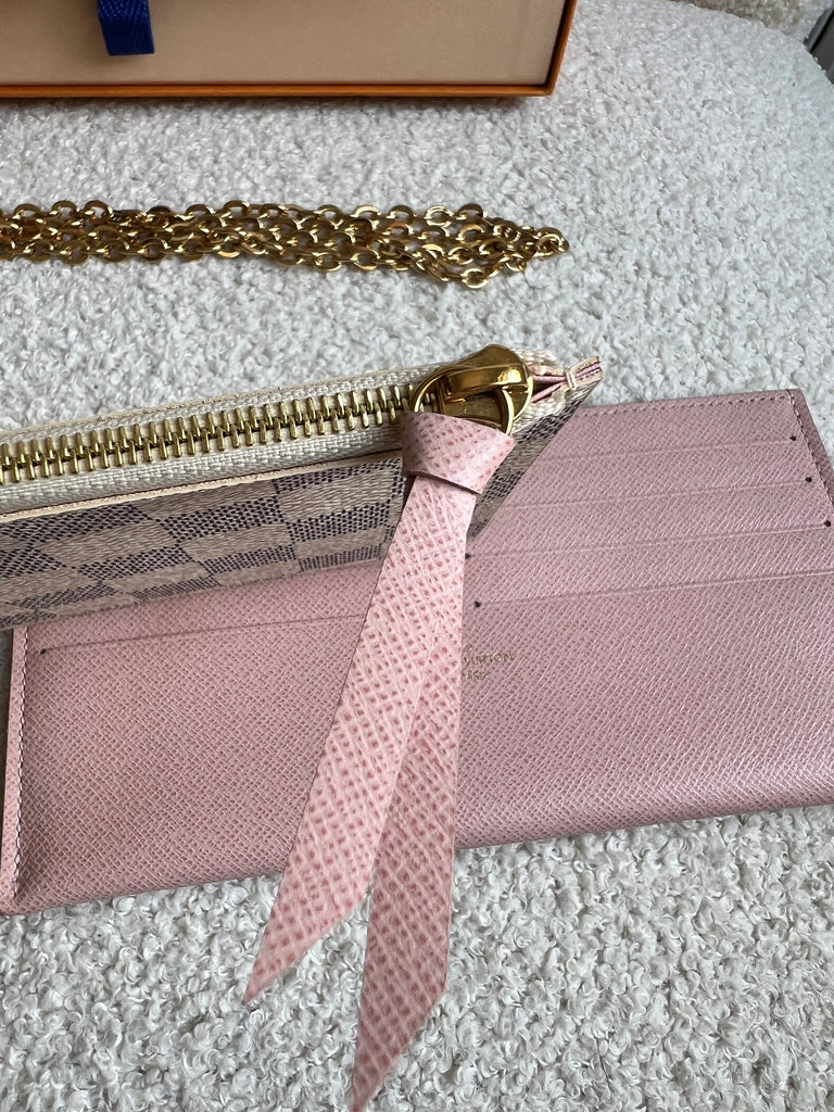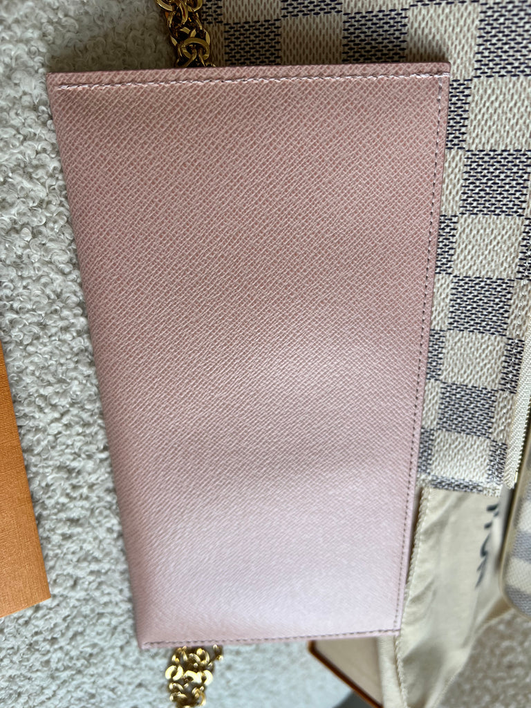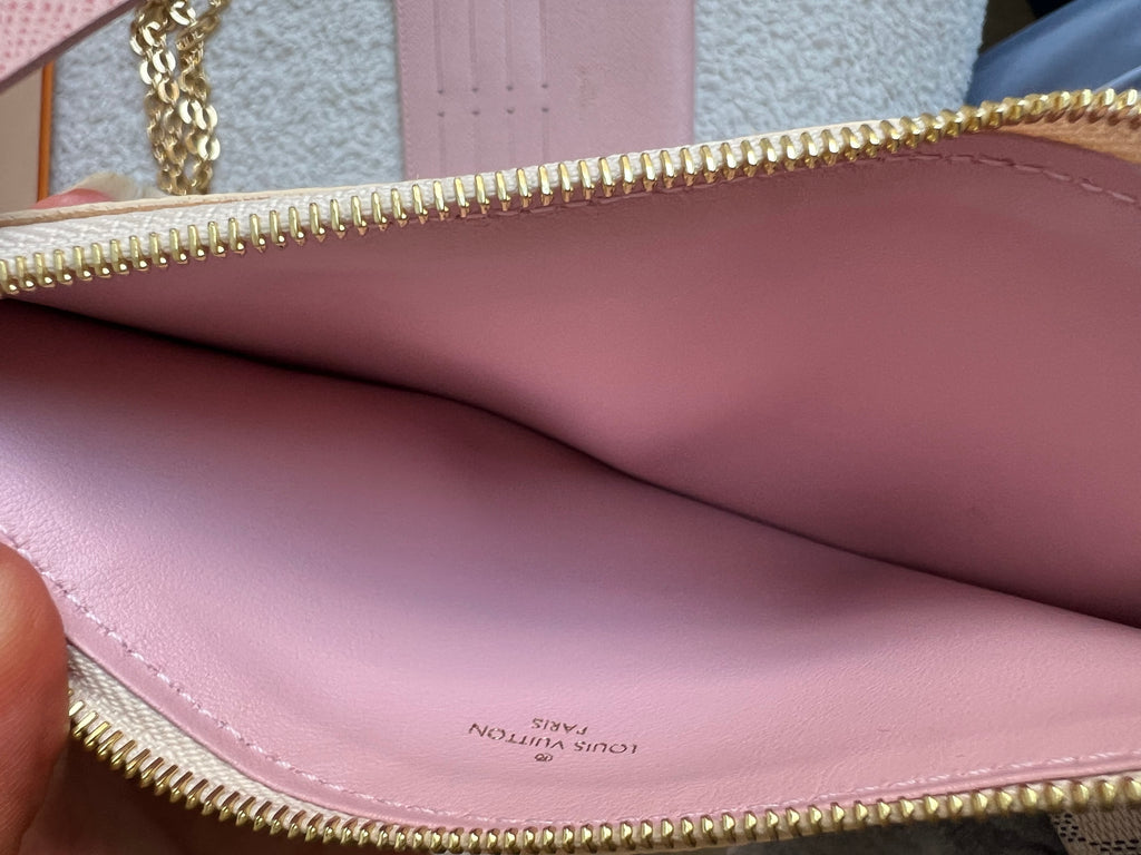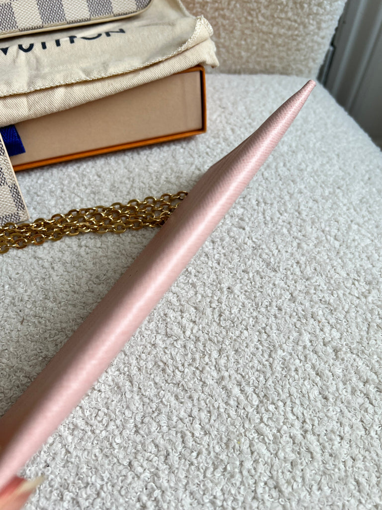 Louis Vuitton Felicie Pochette in Damier Azur canvas with rose ballerine lining. This stylish pochette is perfect to hold the essentials on a night out or evening function. Can be used for day to day wear for those who prefer smaller bags. Can be worn cross body using the removable chain or carried in hand as a clutch, or carried inside a larger bag. This highly sought after style comes with two removable inserts. Microchip item.