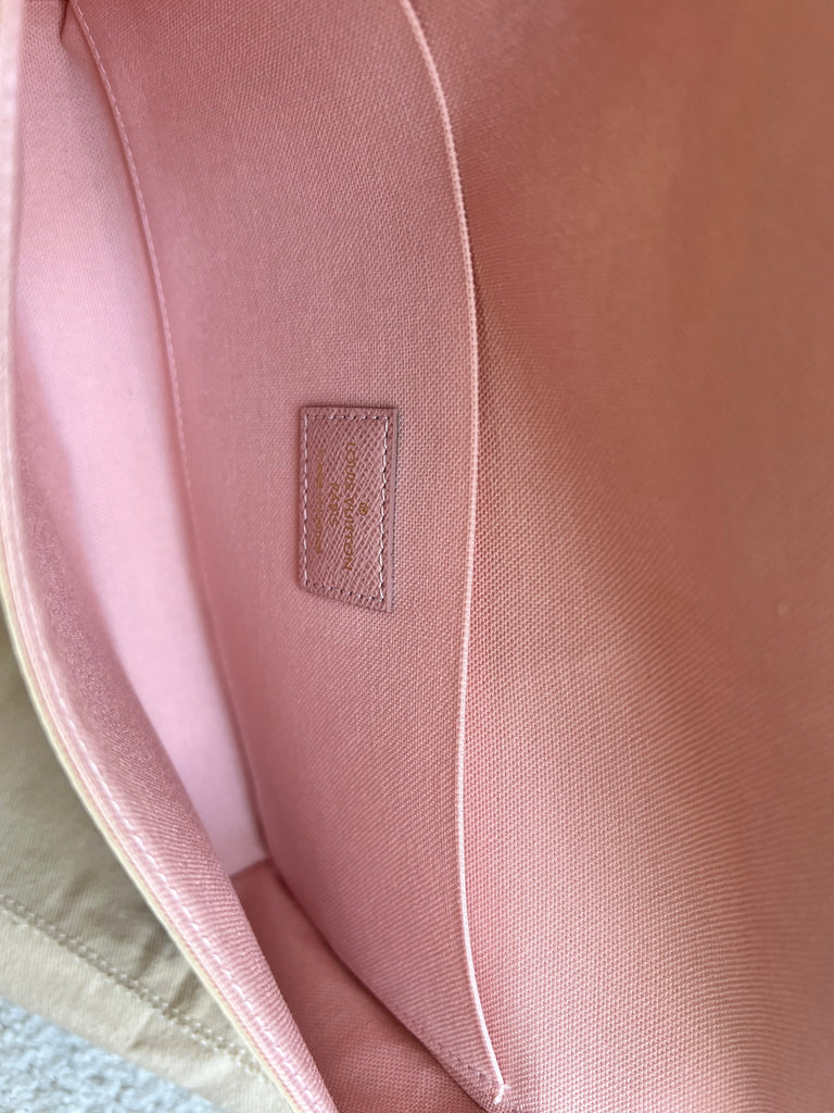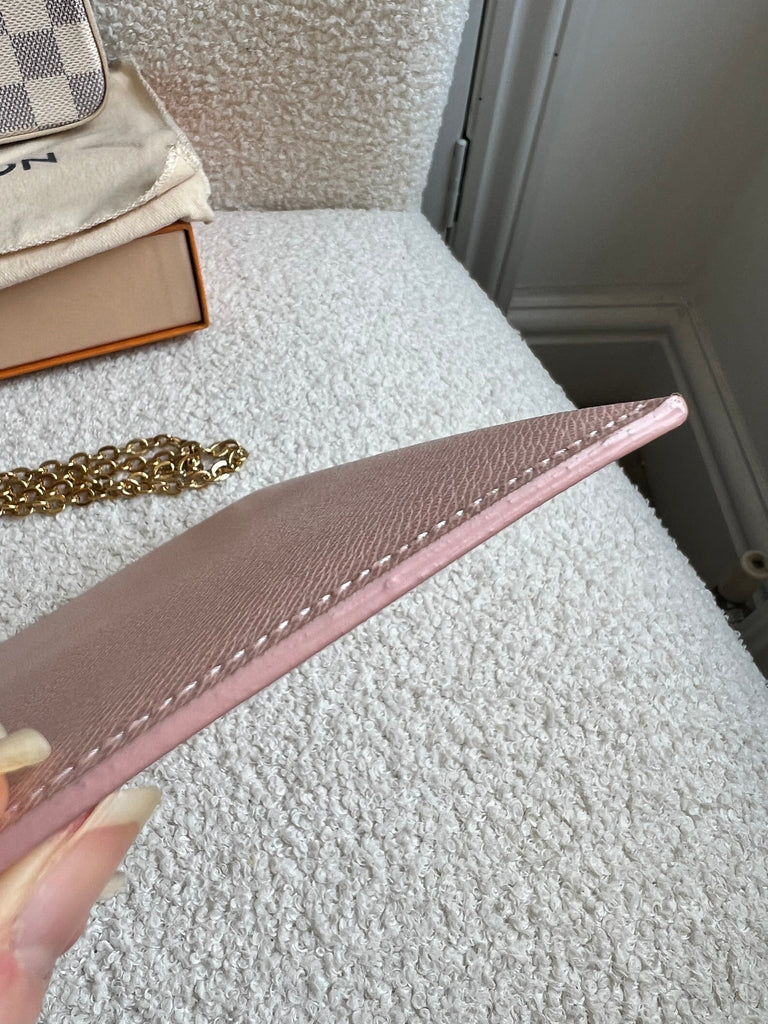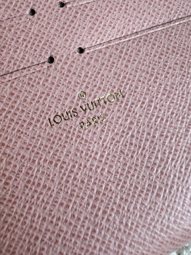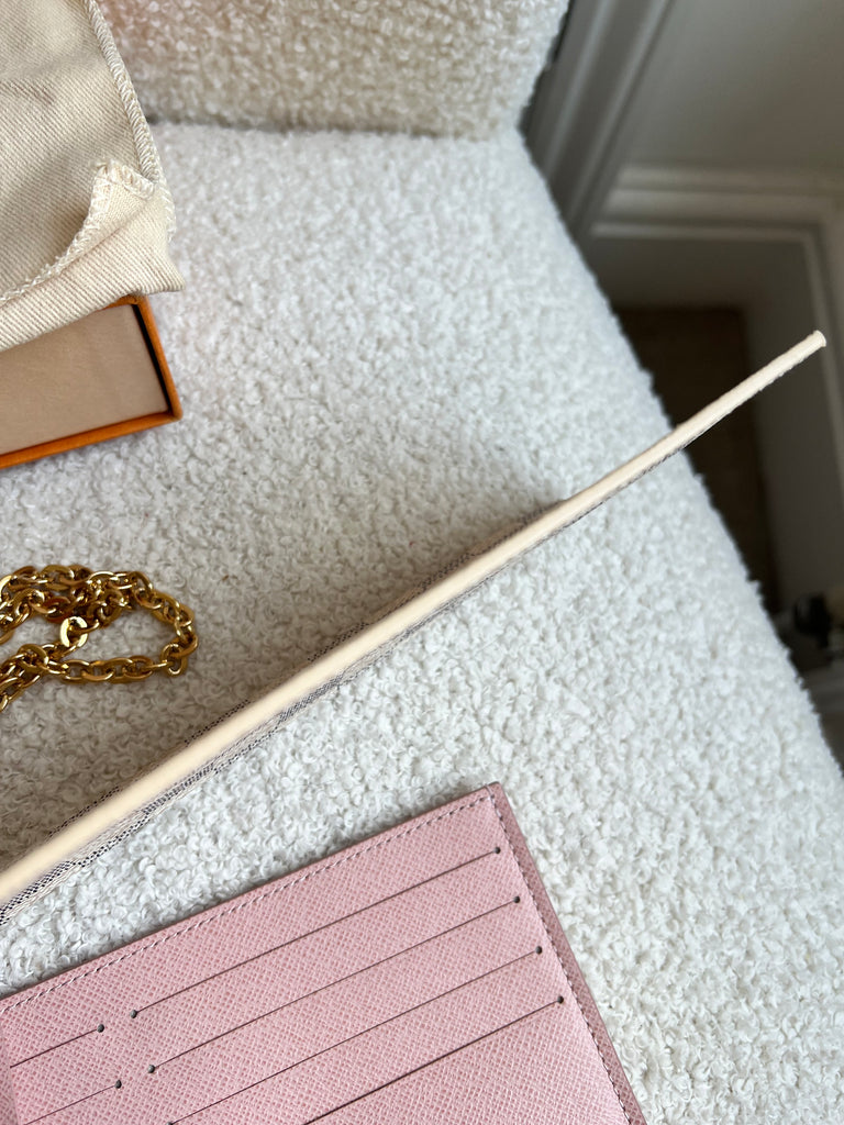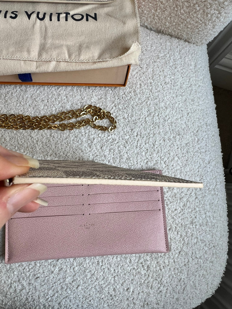 Louis Vuitton Felicie Pochette in Damier Azur canvas with rose ballerine lining. This stylish pochette is perfect to hold the essentials on a night out or evening function. Can be used for day to day wear for those who prefer smaller bags. Can be worn cross body using the removable chain or carried in hand as a clutch, or carried inside a larger bag. This highly sought after style comes with two removable inserts. Microchip item.