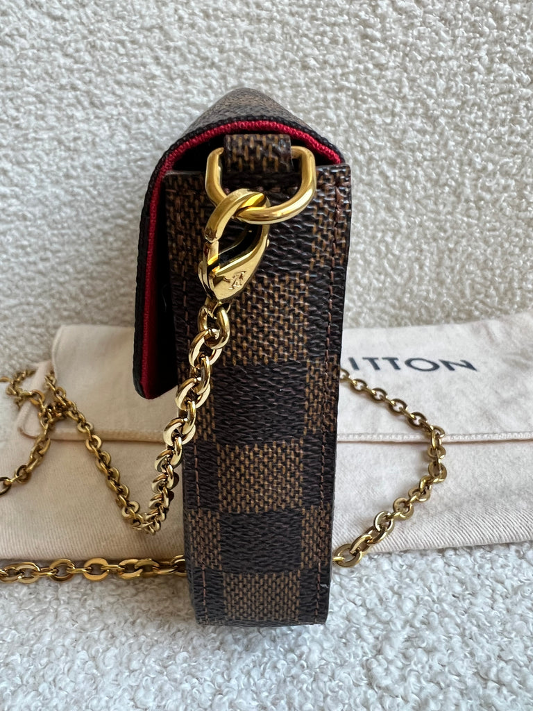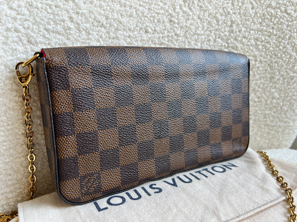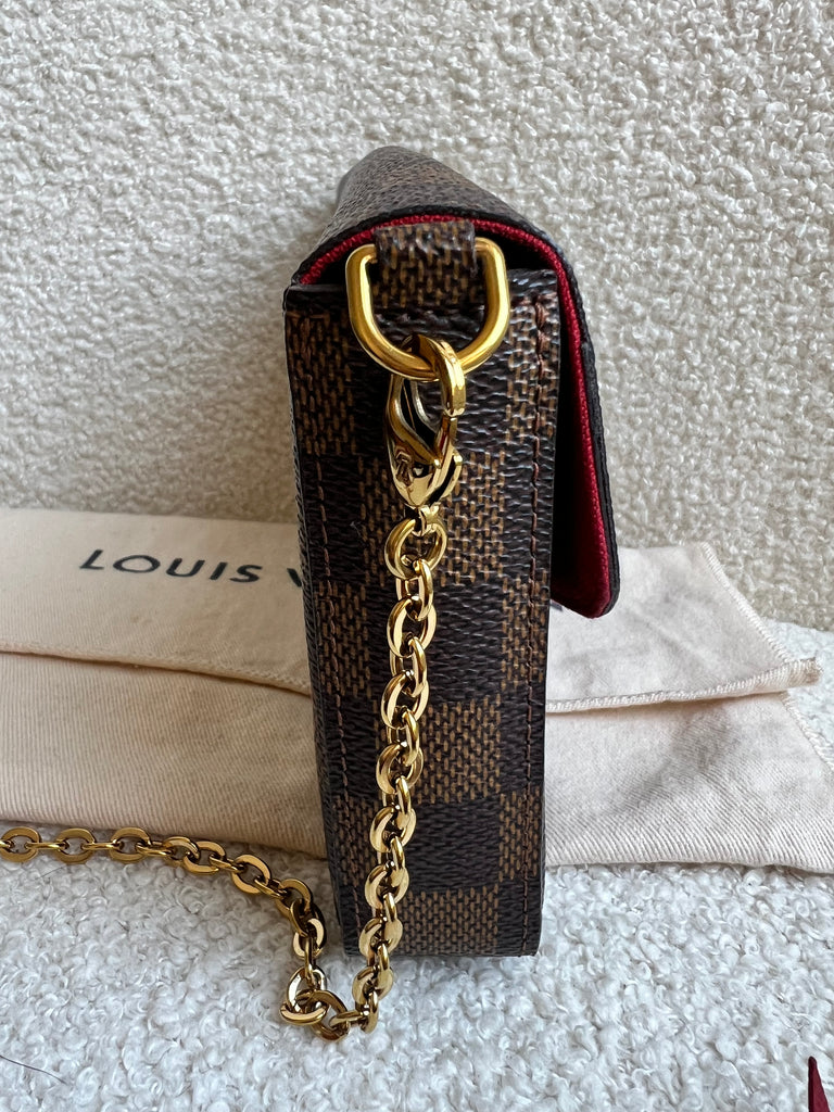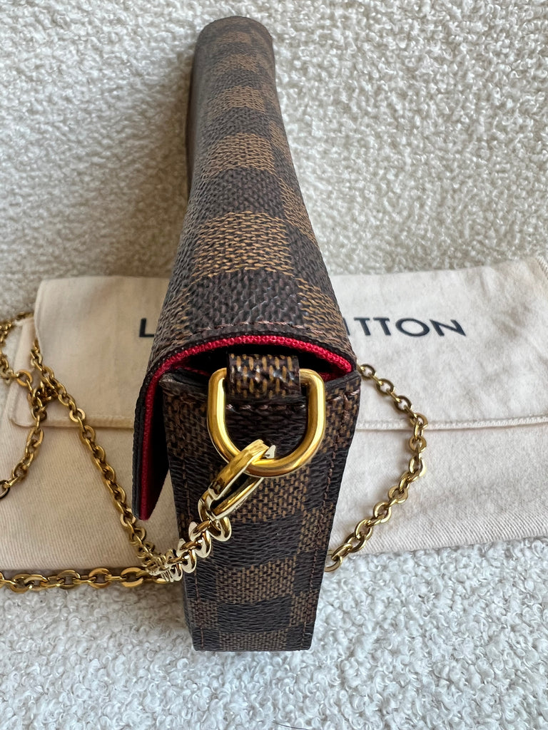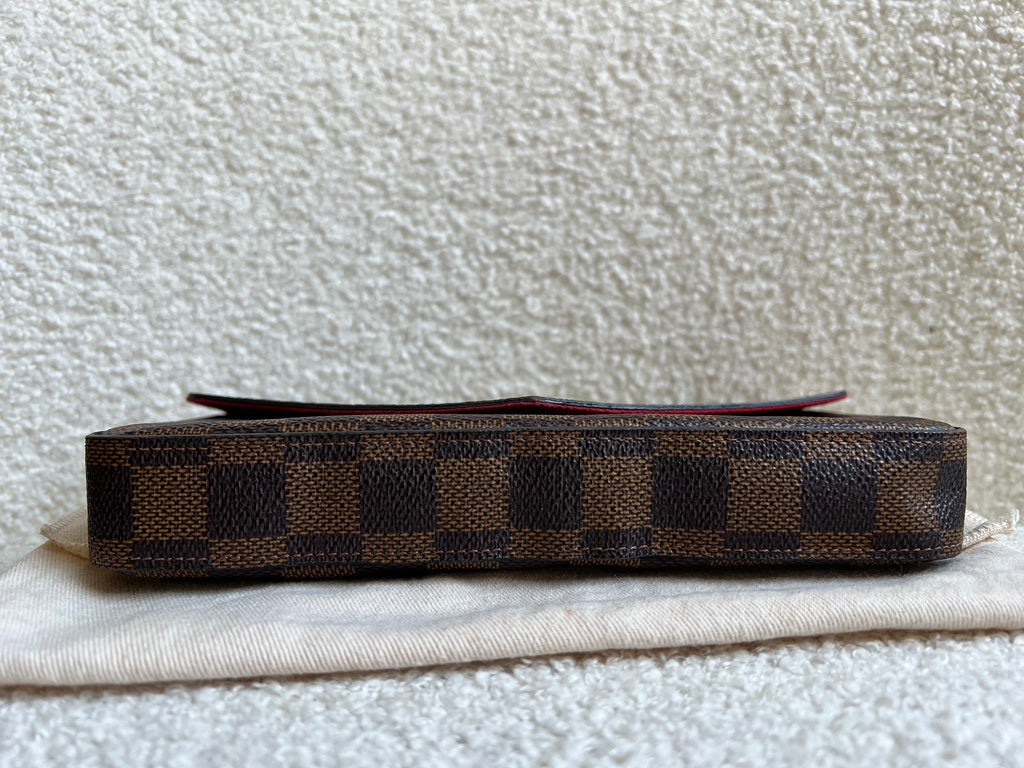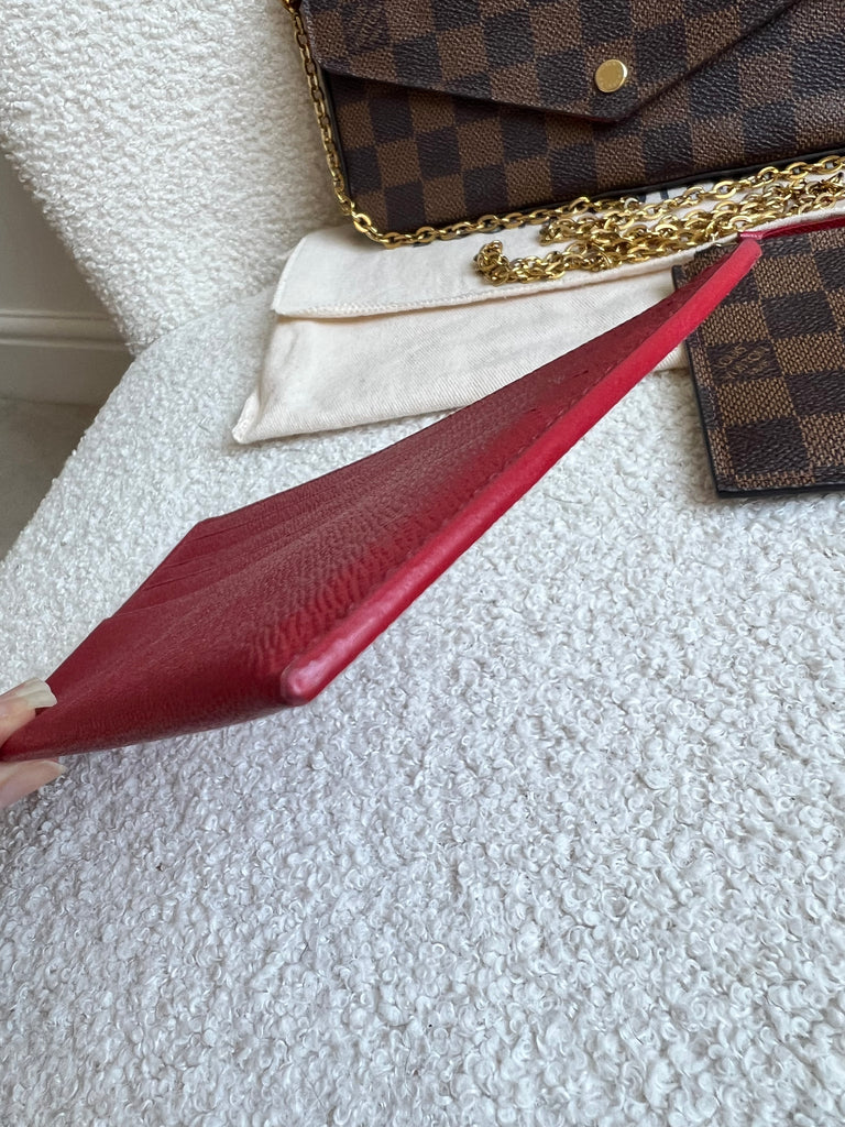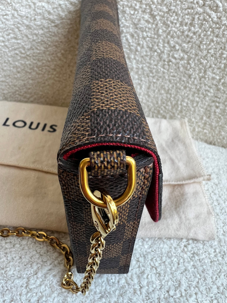 Louis Vuitton Felicie Pochette in Damier Ebene canvas with red lining. This stylish pochette is perfect to hold the essentials on a night out or evening function. Can be used for day to day wear for those who prefer smaller bags. Can be worn cross body using the removable chain or carried in hand as a clutch, or carried inside a larger bag. This highly sought after style comes with two removable inserts.