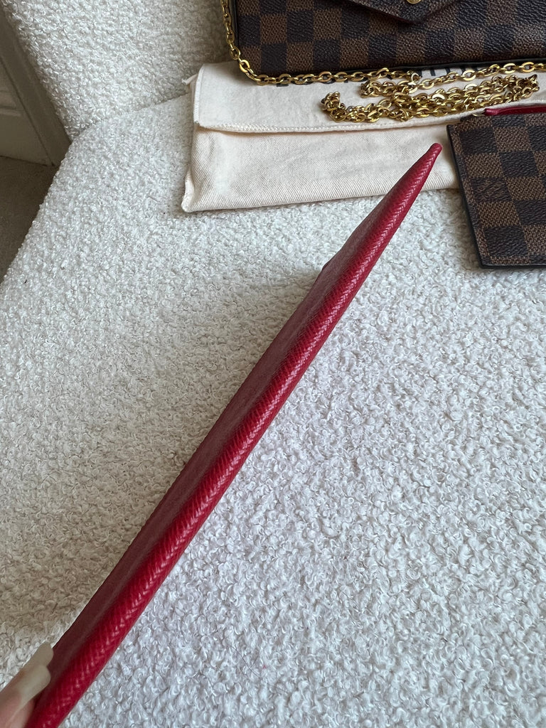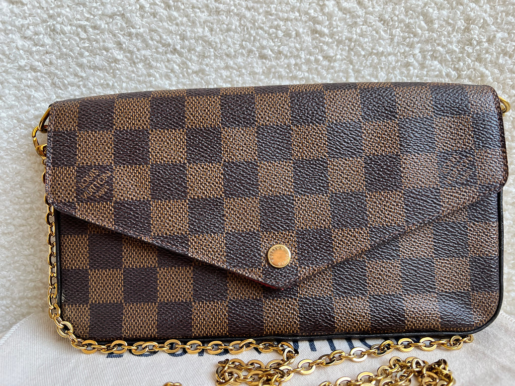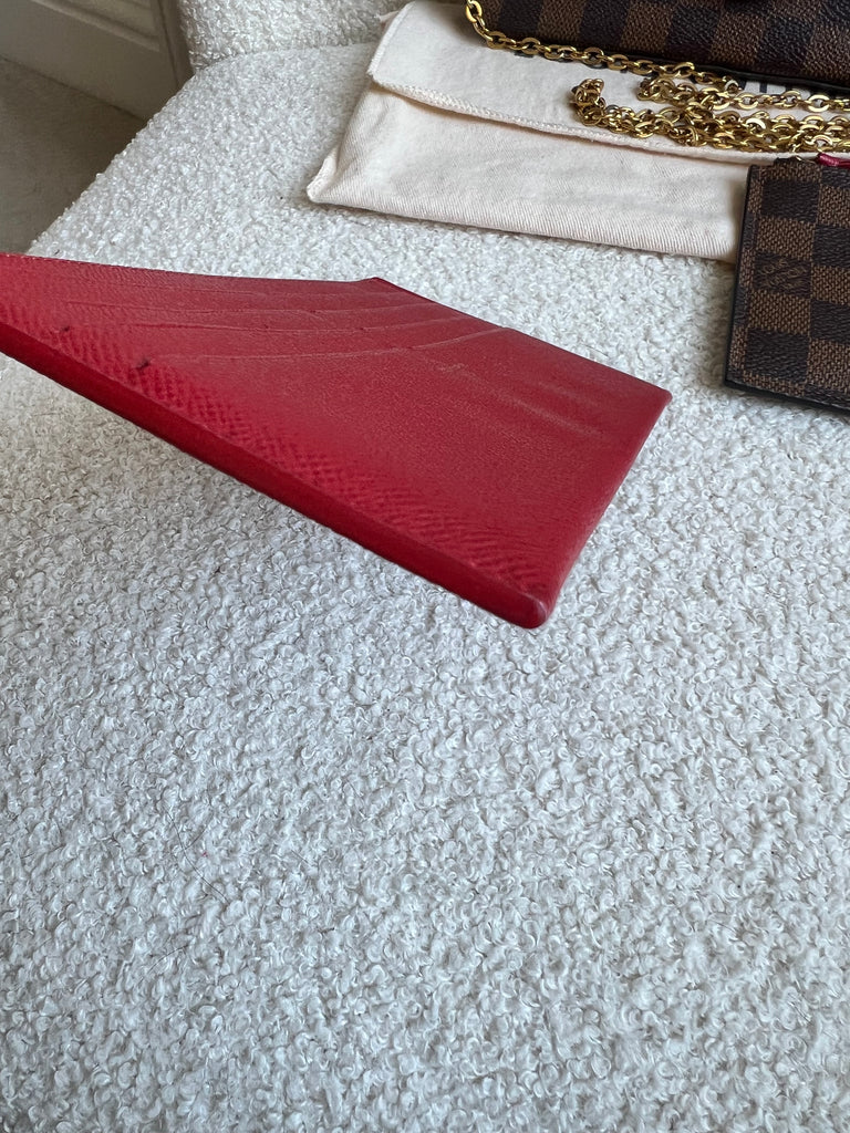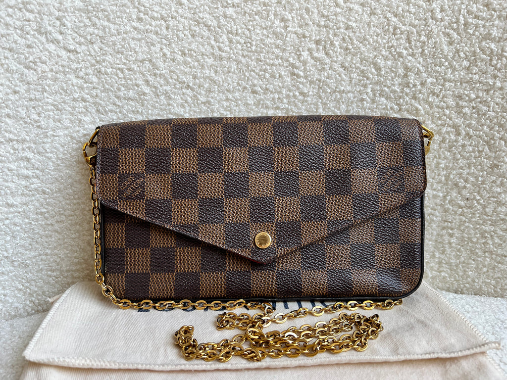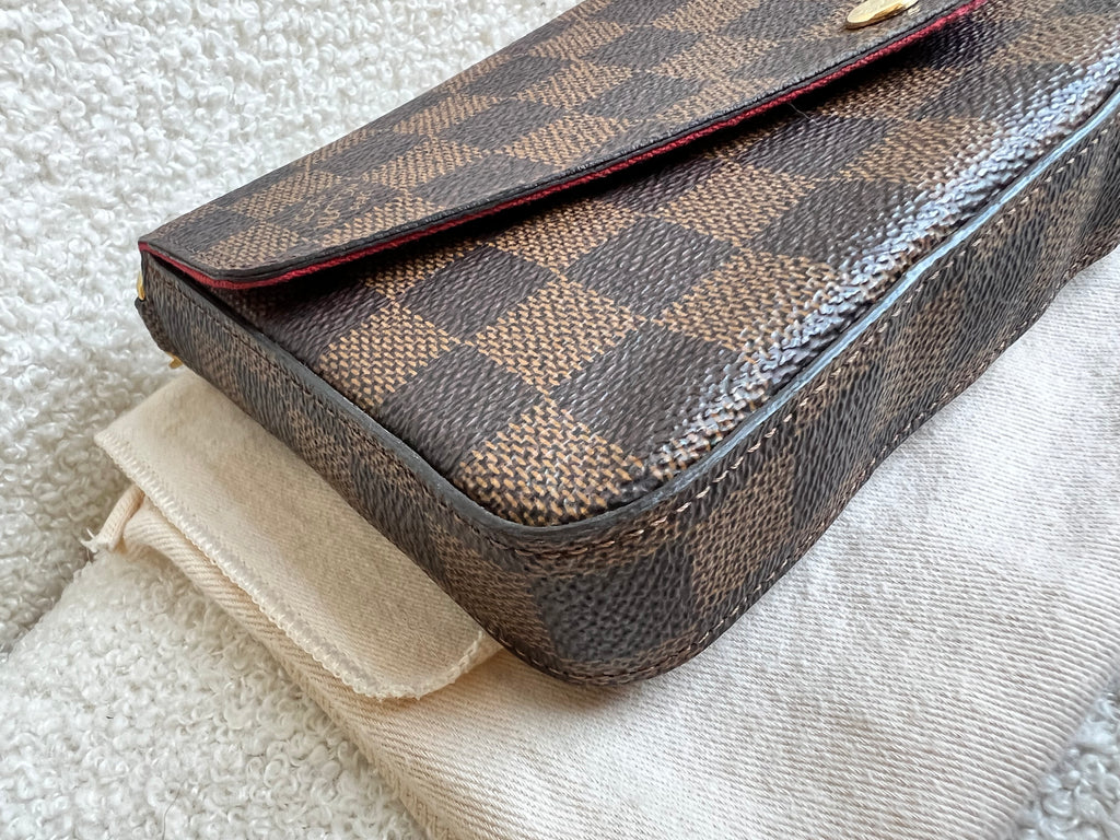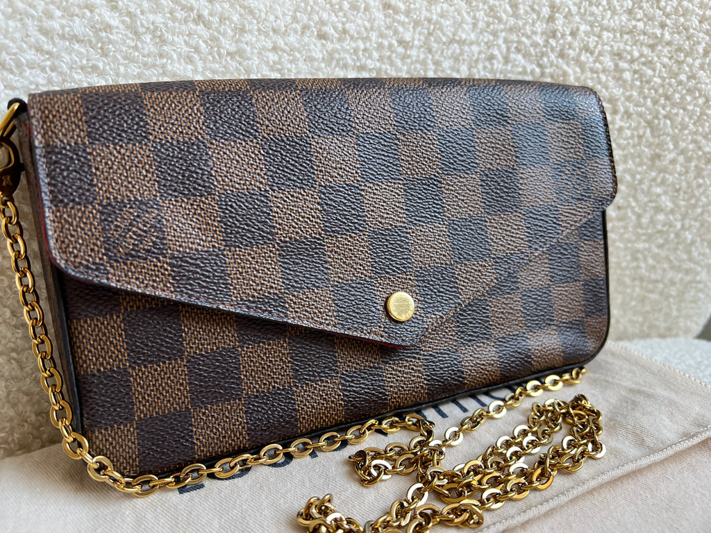 Louis Vuitton Felicie Pochette in Damier Ebene canvas with red lining. This stylish pochette is perfect to hold the essentials on a night out or evening function. Can be used for day to day wear for those who prefer smaller bags. Can be worn cross body using the removable chain or carried in hand as a clutch, or carried inside a larger bag. This highly sought after style comes with two removable inserts.
