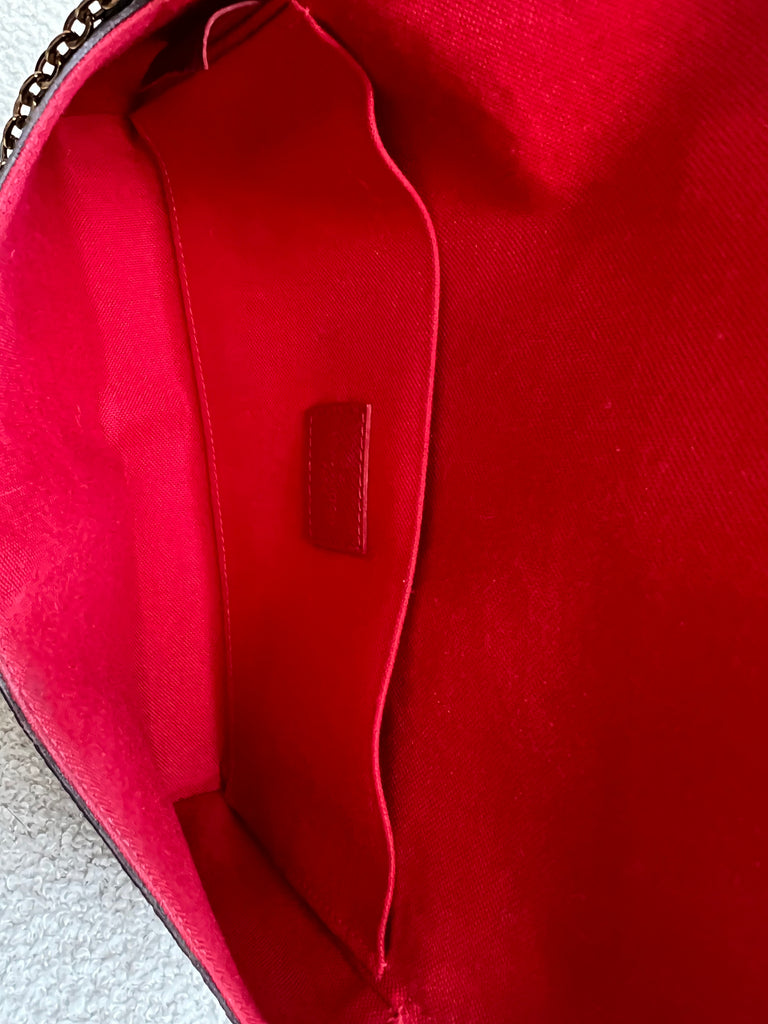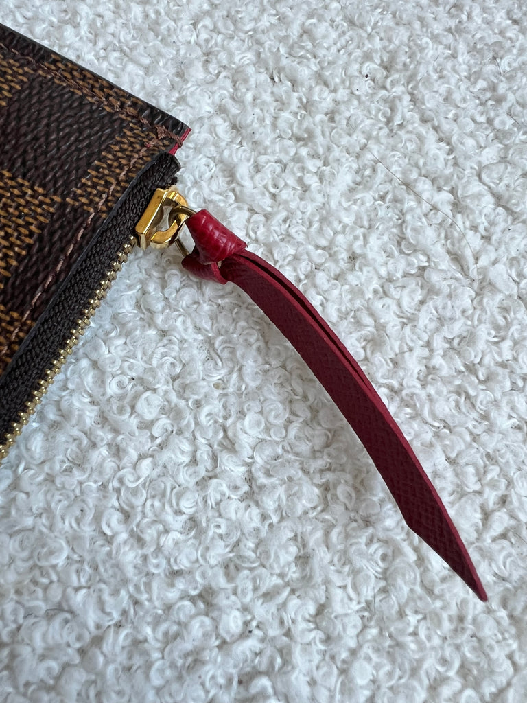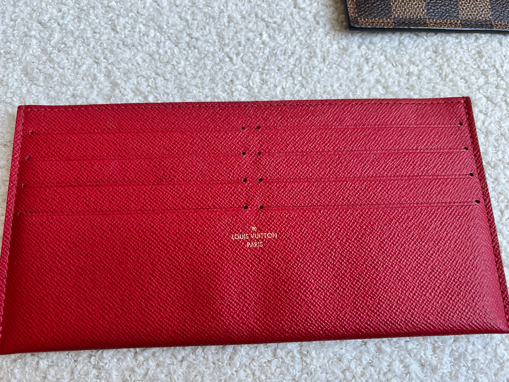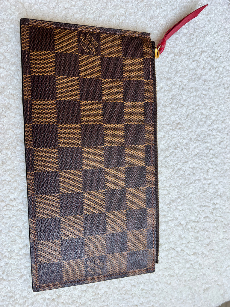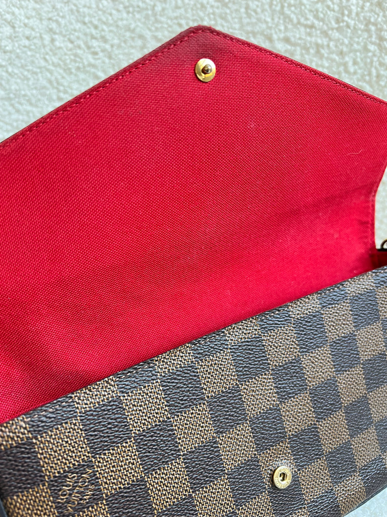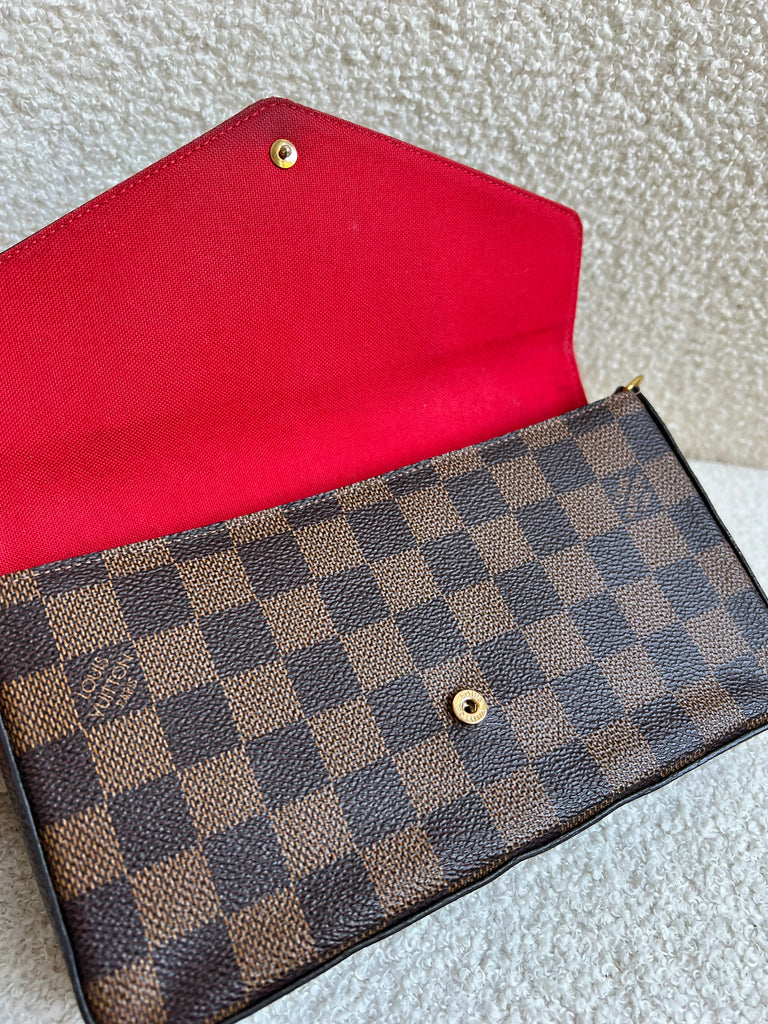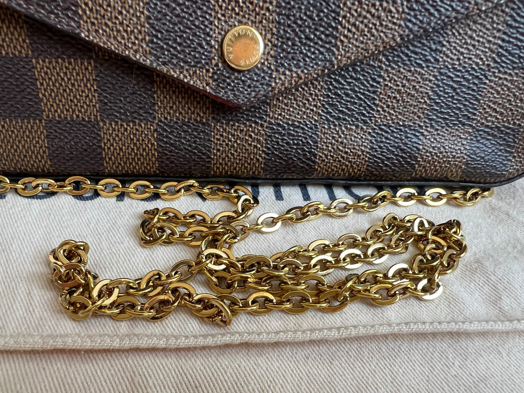 Louis Vuitton Felicie Pochette in Damier Ebene canvas with red lining. This stylish pochette is perfect to hold the essentials on a night out or evening function. Can be used for day to day wear for those who prefer smaller bags. Can be worn cross body using the removable chain or carried in hand as a clutch, or carried inside a larger bag. This highly sought after style comes with two removable inserts.