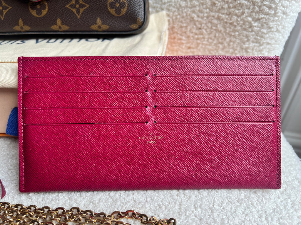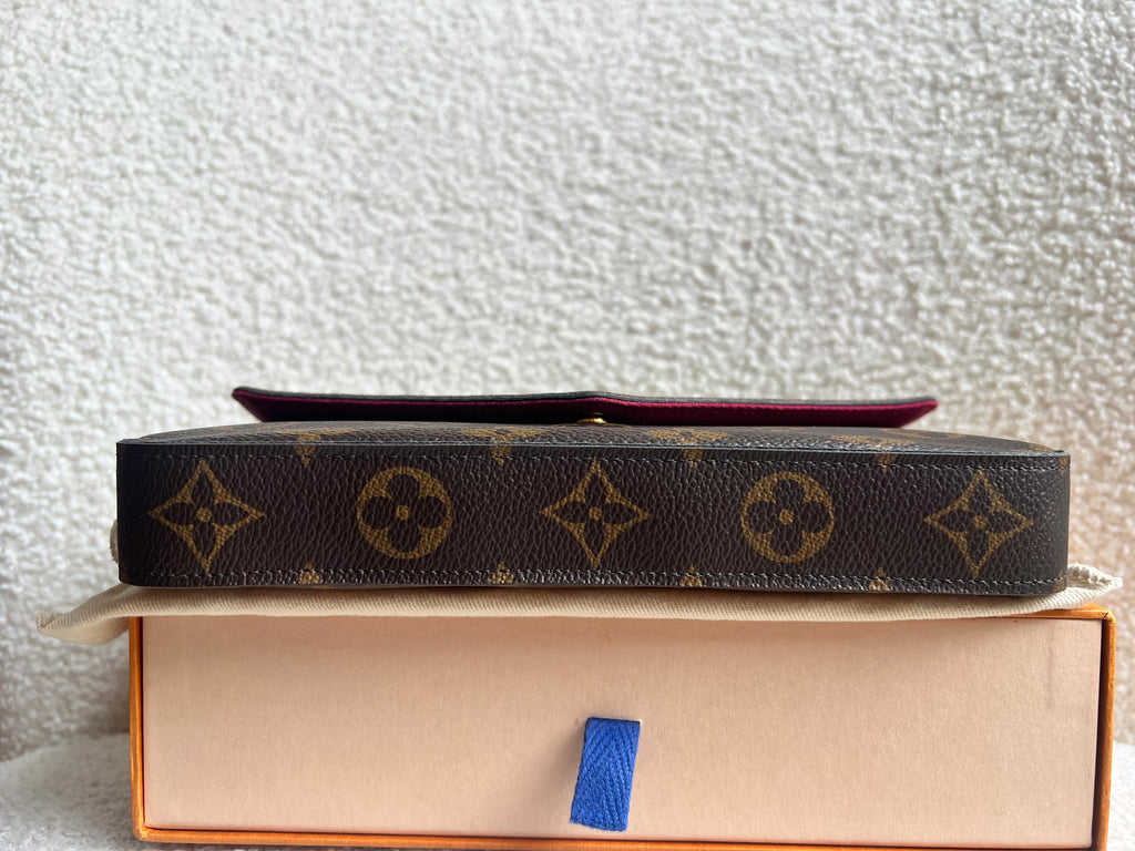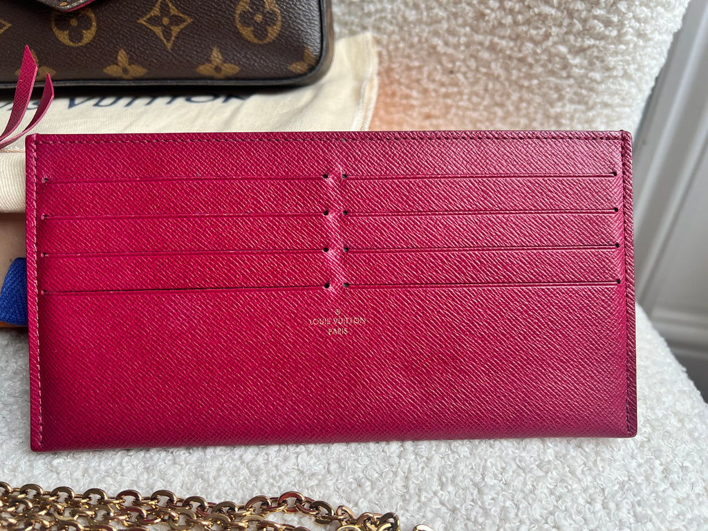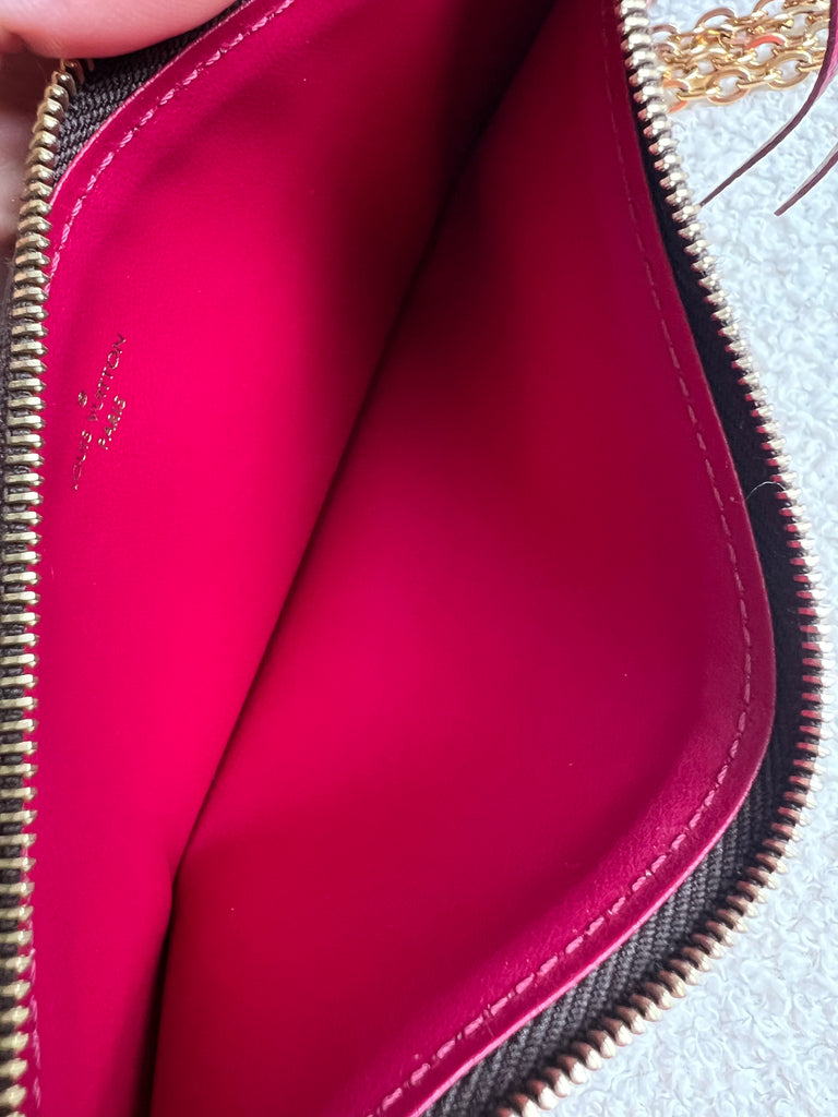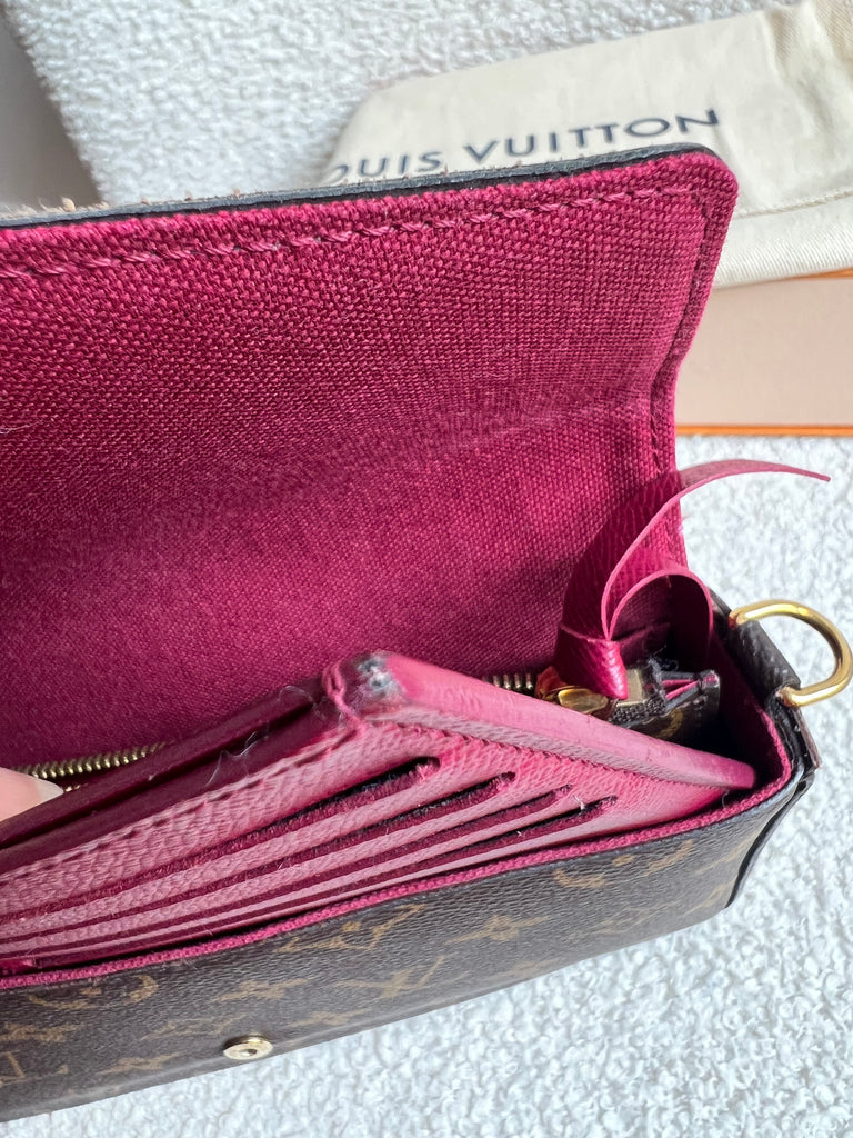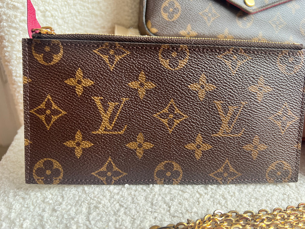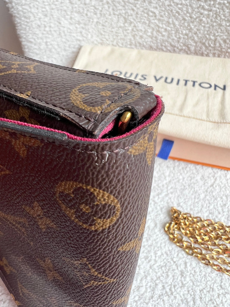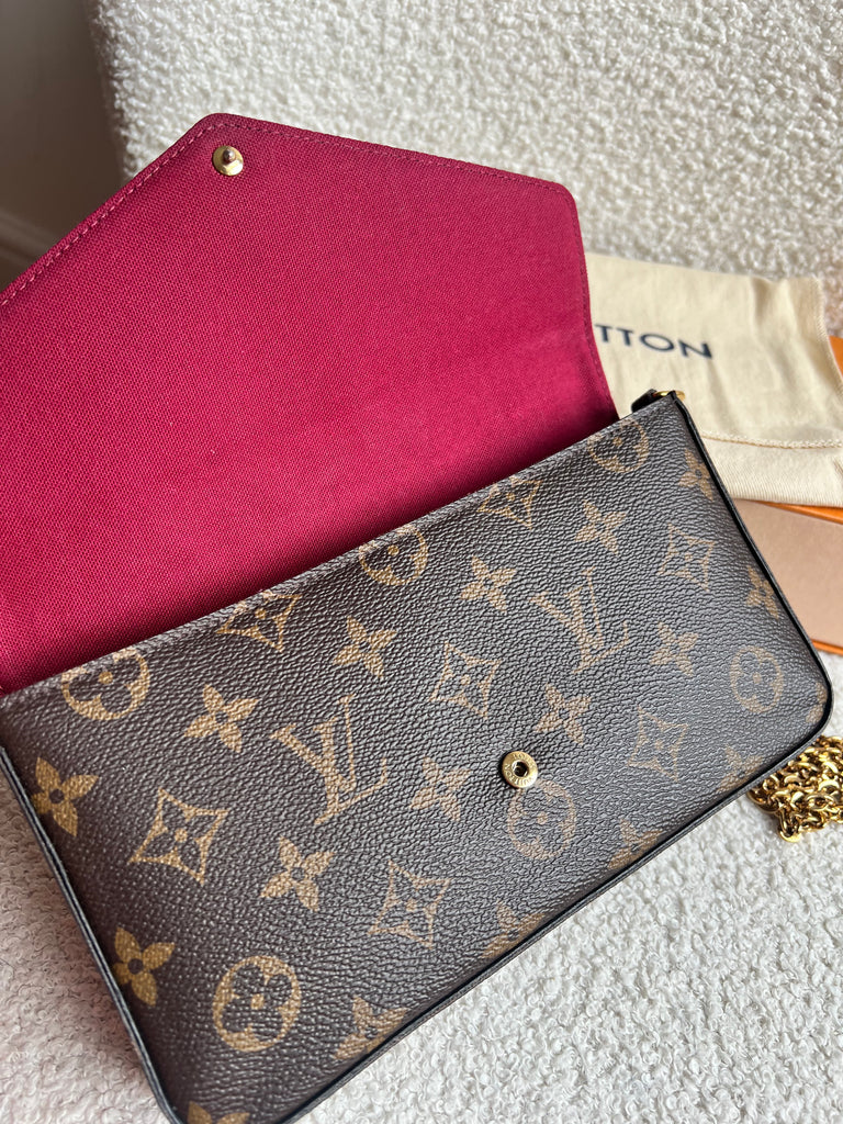 Louis Vuitton Felicie Pochette in Monogram canvas with fuschia pink lining. This stylish pochette is perfect to hold the essentials on a night out or evening function. Can be used for day to day wear for those who prefer smaller bags. Can be worn cross body using the removable chain or carried in hand as a clutch, or carried inside a larger bag. This highly sought after style comes with two removable inserts.