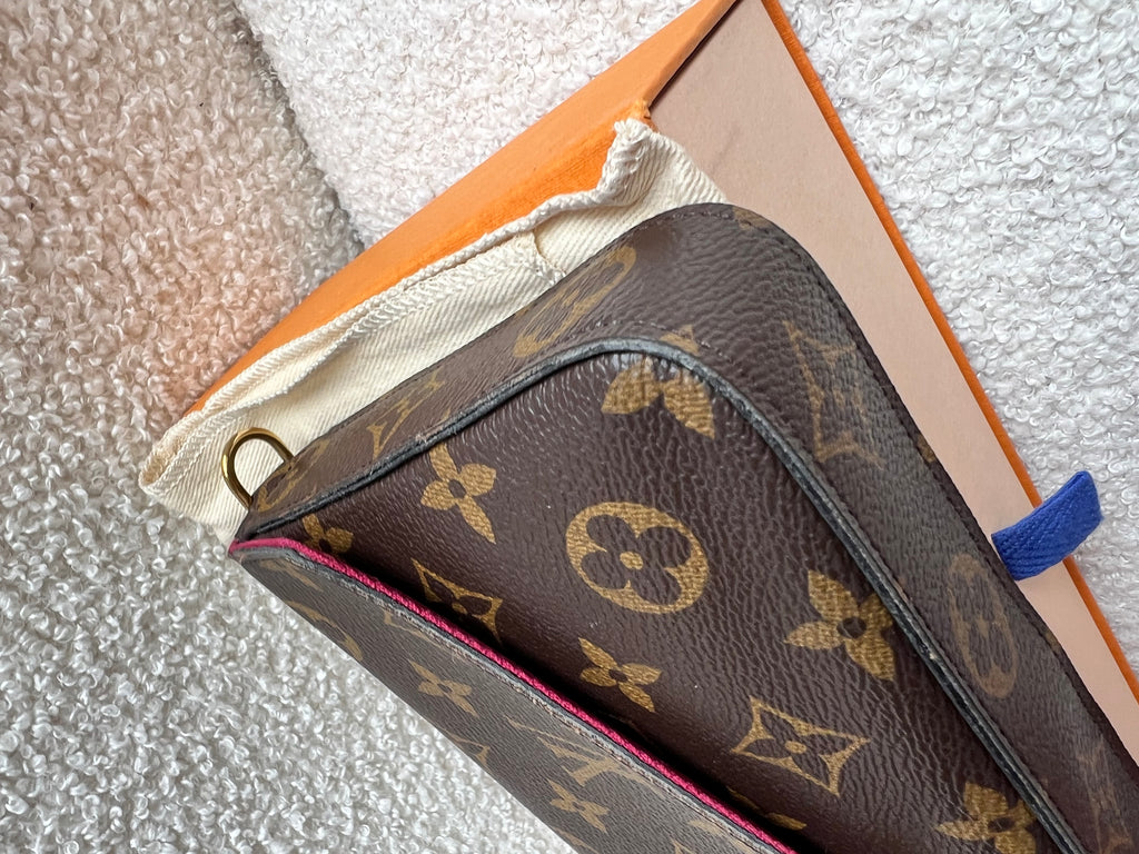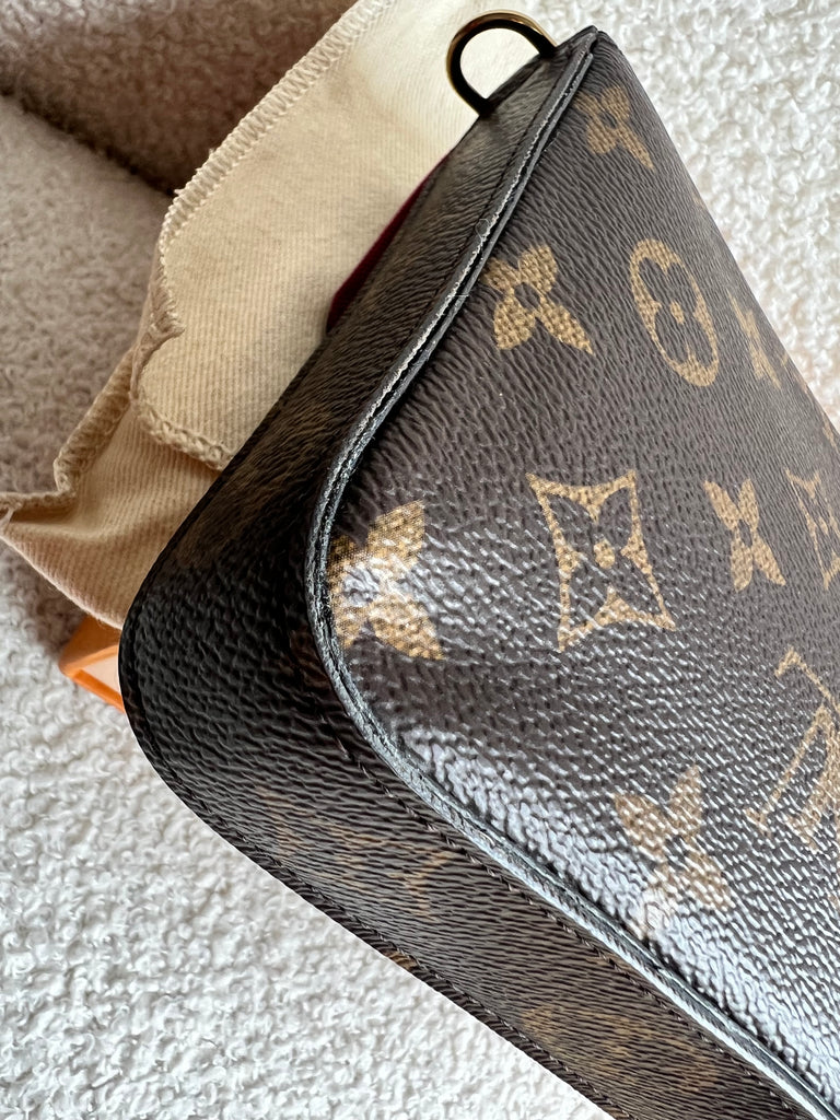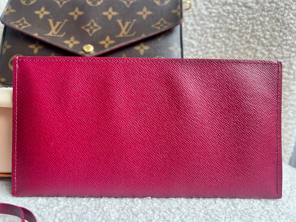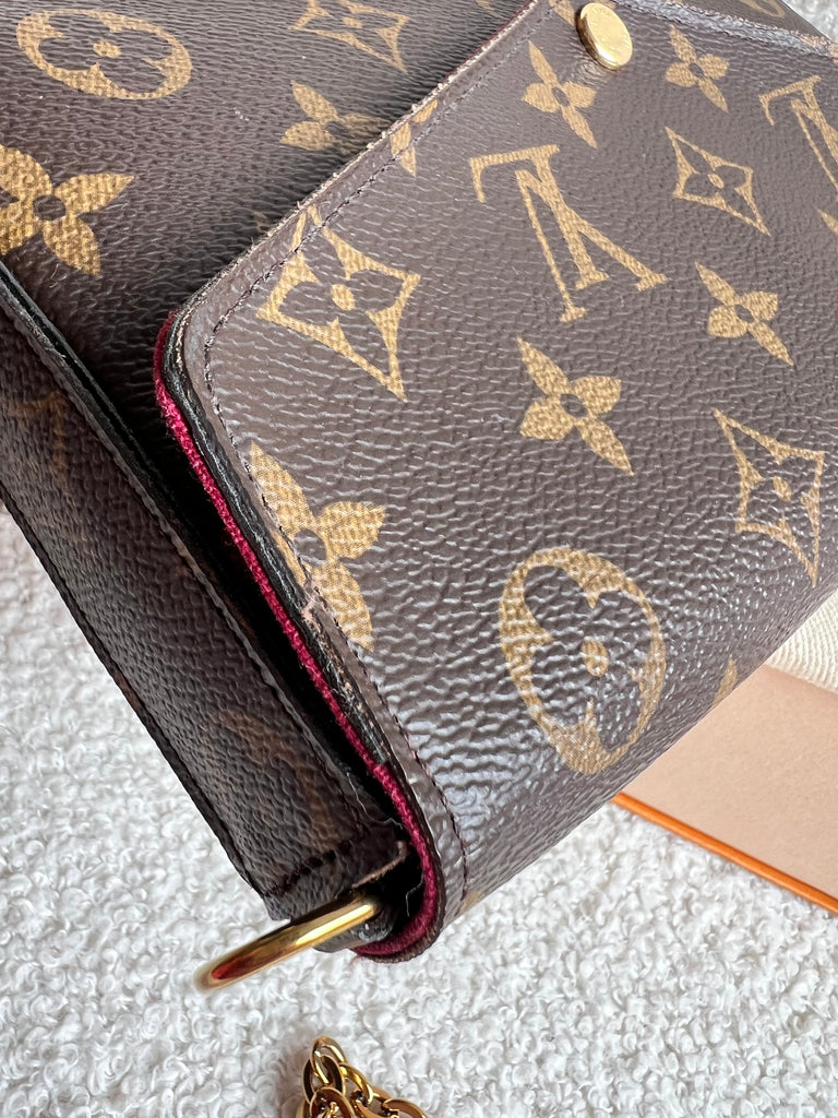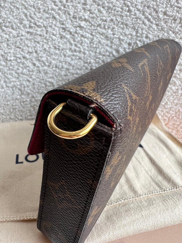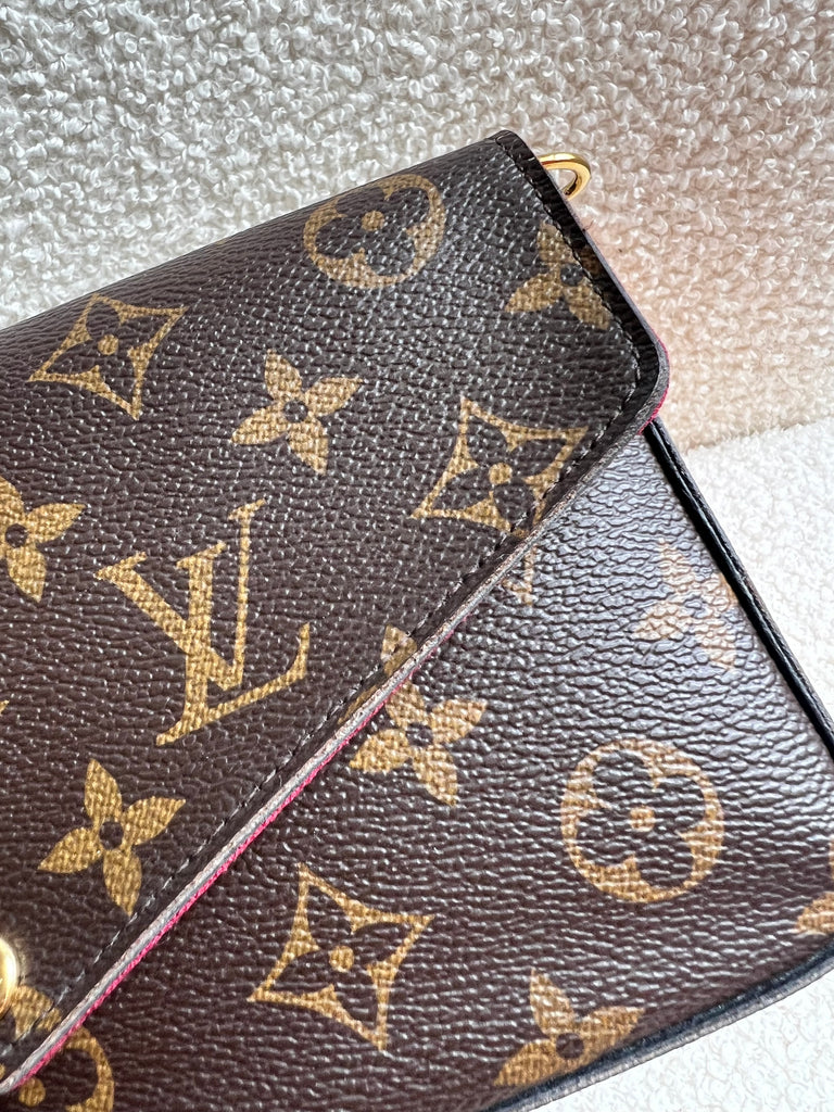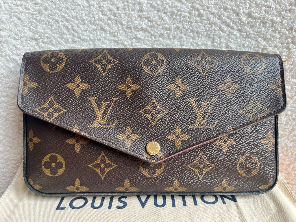 Louis Vuitton Felicie Pochette in Monogram canvas with fuschia pink lining. This stylish pochette is perfect to hold the essentials on a night out or evening function. Can be used for day to day wear for those who prefer smaller bags. Can be worn cross body using the removable chain or carried in hand as a clutch, or carried inside a larger bag. This highly sought after style comes with two removable inserts.
