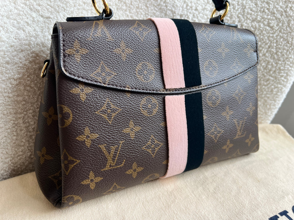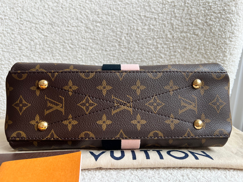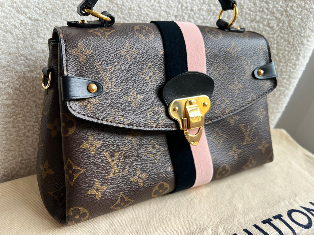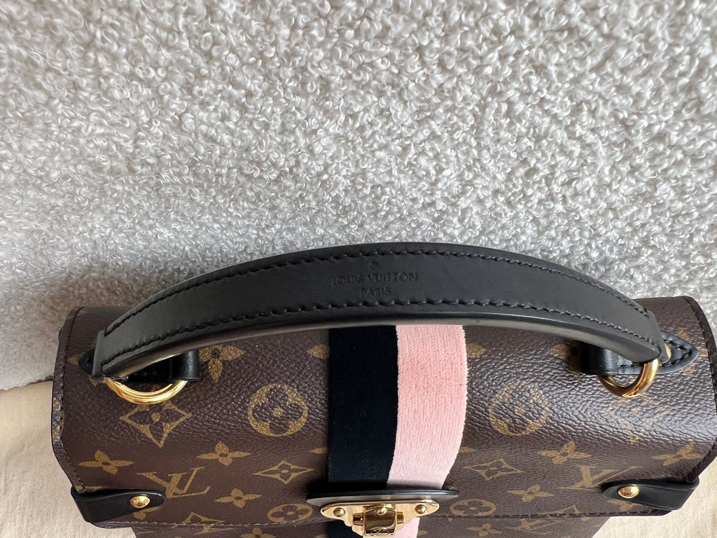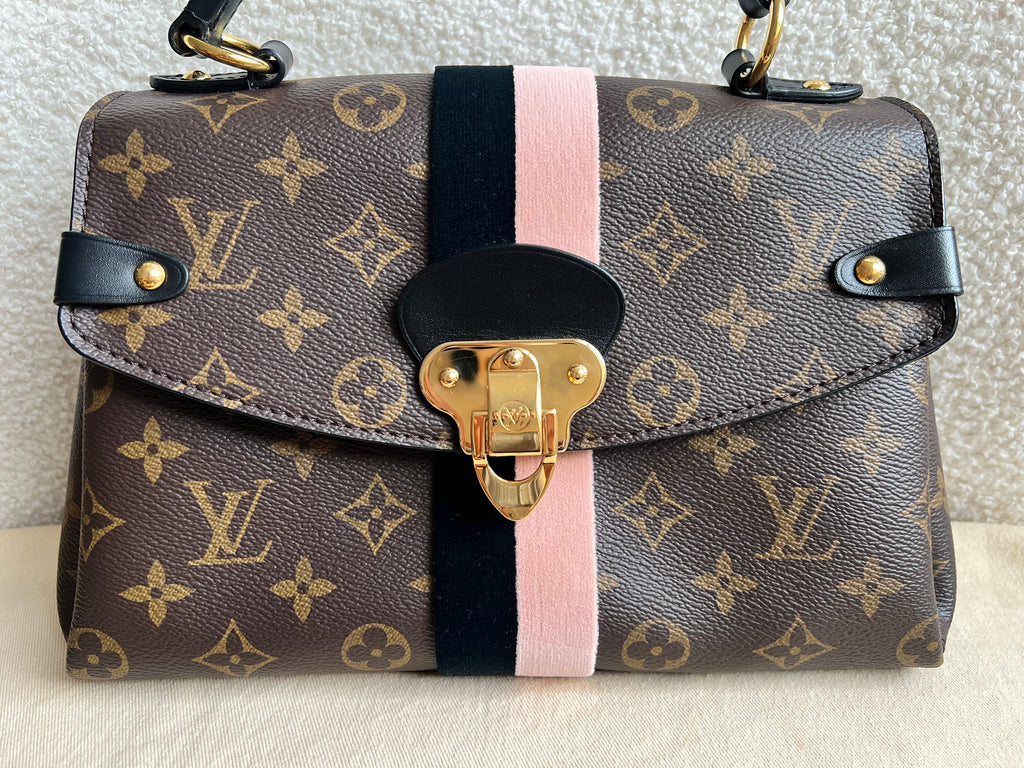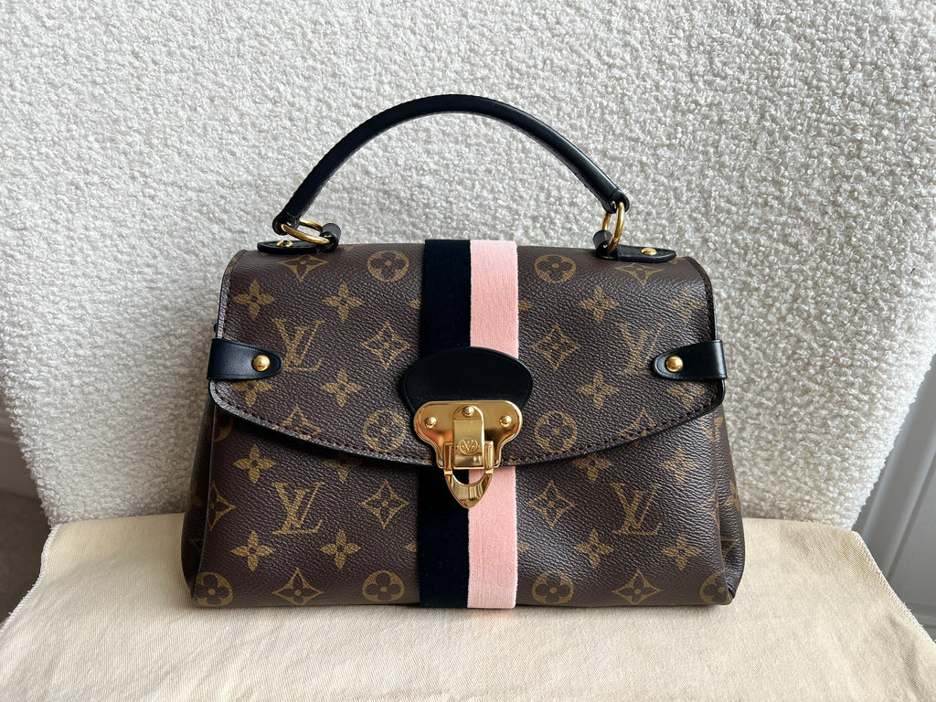 Louis Vuitton Georges BB bag in Monogram and black and pink stripe. Named after Georges Vuitton, this style was released in 2018 and is no longer available at LV. This top handled bag offers multiple carry options - by hand, on the crook of the arm, or over the shoulder using the removable leather strap. Compact and structured, but reasonably roomy in this BB size. Ideal day to day bag which holds a reasonable amount inside. 2019 year.