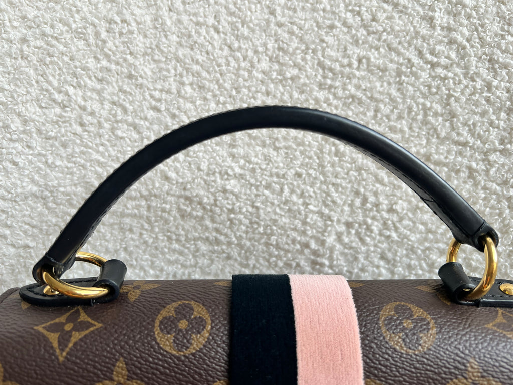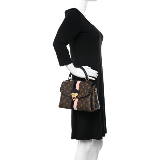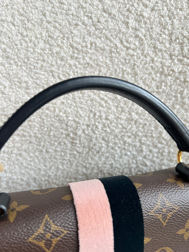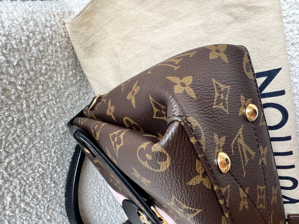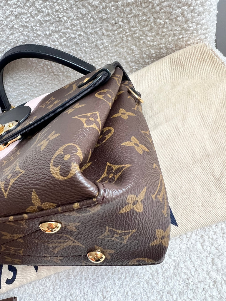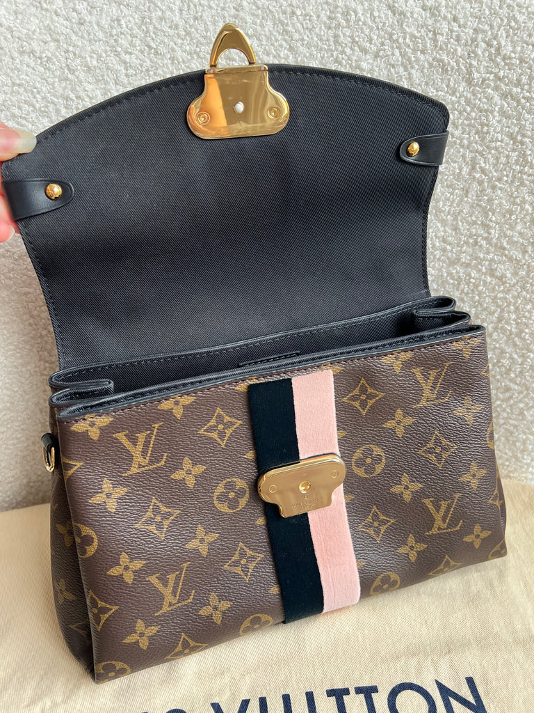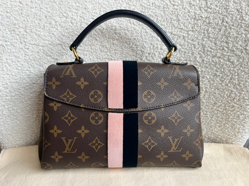 Louis Vuitton Georges BB bag in Monogram and black and pink stripe. Named after Georges Vuitton, this style was released in 2018 and is no longer available at LV. This top handled bag offers multiple carry options - by hand, on the crook of the arm, or over the shoulder using the removable leather strap. Compact and structured, but reasonably roomy in this BB size. Ideal day to day bag which holds a reasonable amount inside. 2019 year.