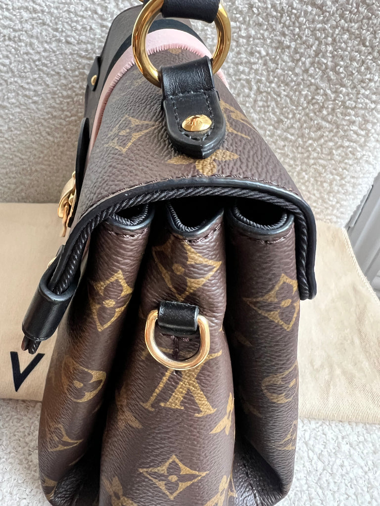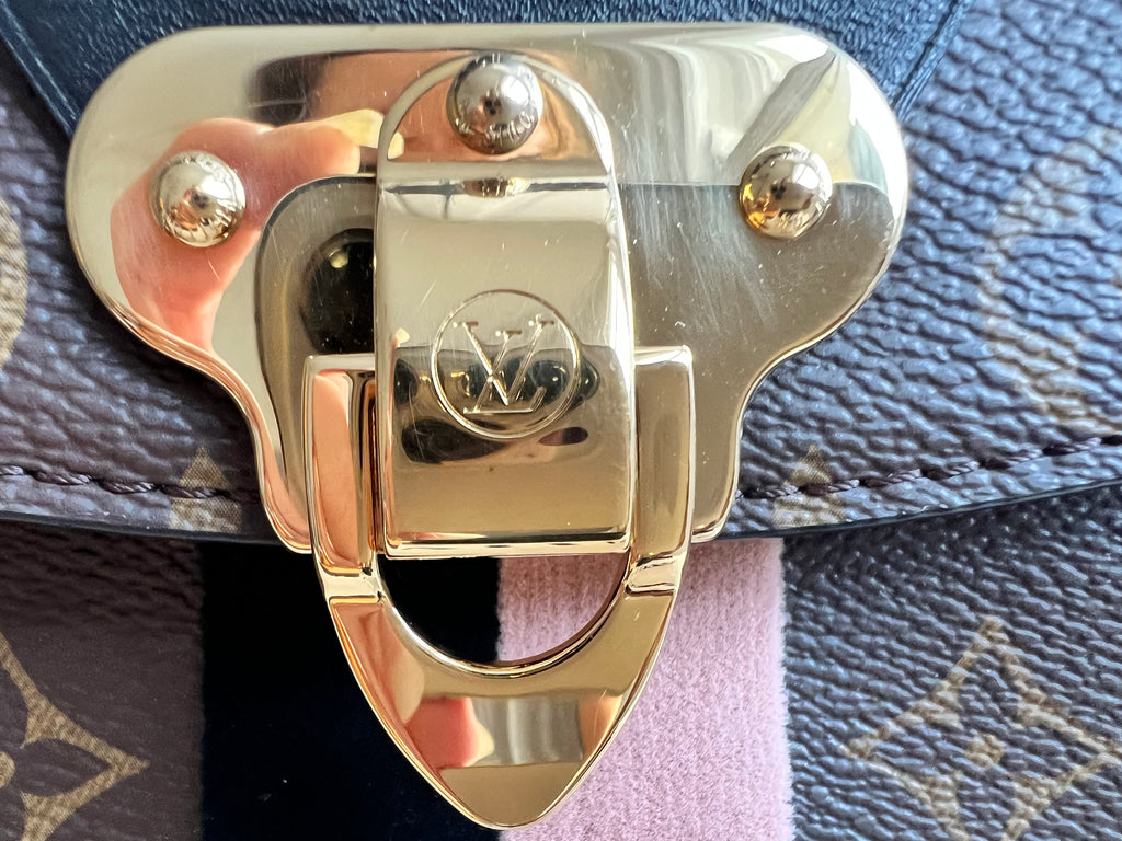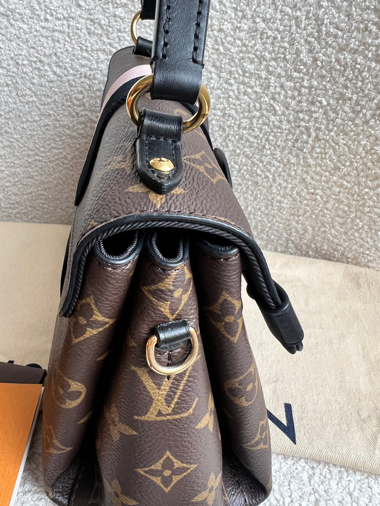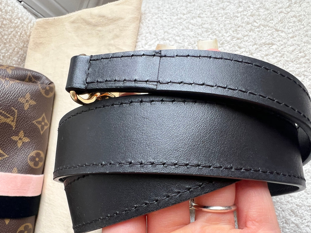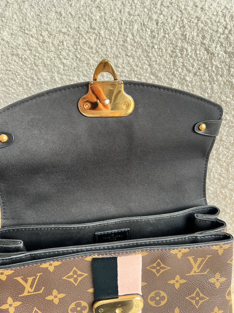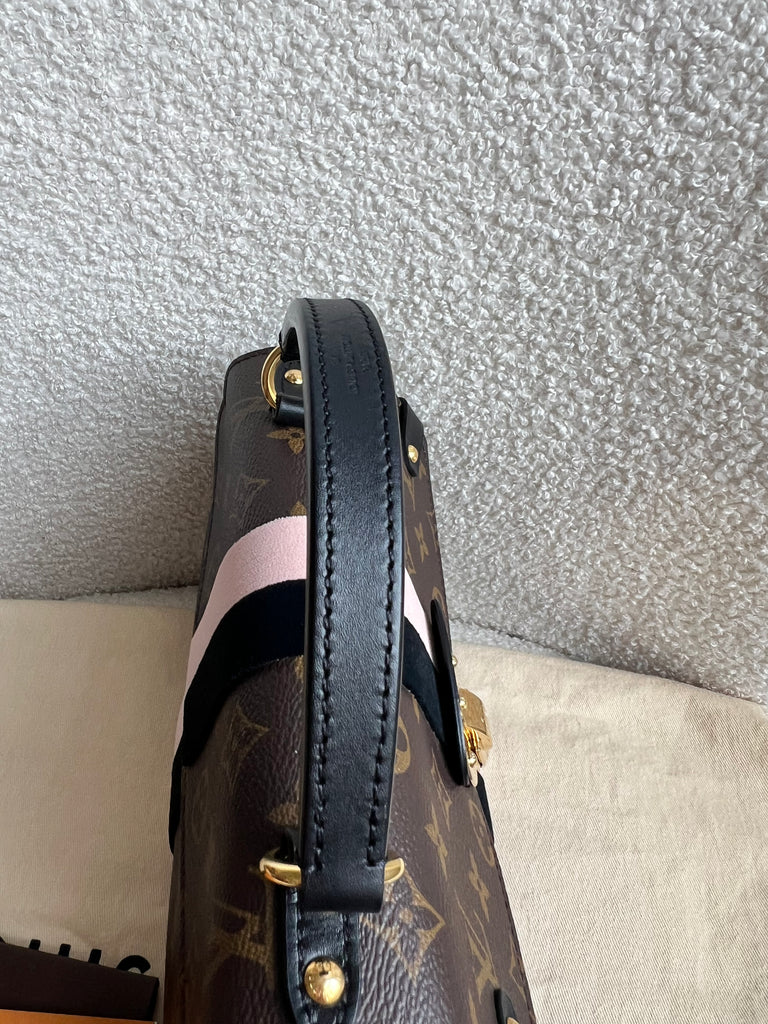 Louis Vuitton Georges BB bag in Monogram and black and pink stripe. Named after Georges Vuitton, this style was released in 2018 and is no longer available at LV. This top handled bag offers multiple carry options - by hand, on the crook of the arm, or over the shoulder using the removable leather strap. Compact and structured, but reasonably roomy in this BB size. Ideal day to day bag which holds a reasonable amount inside. 2019 year.