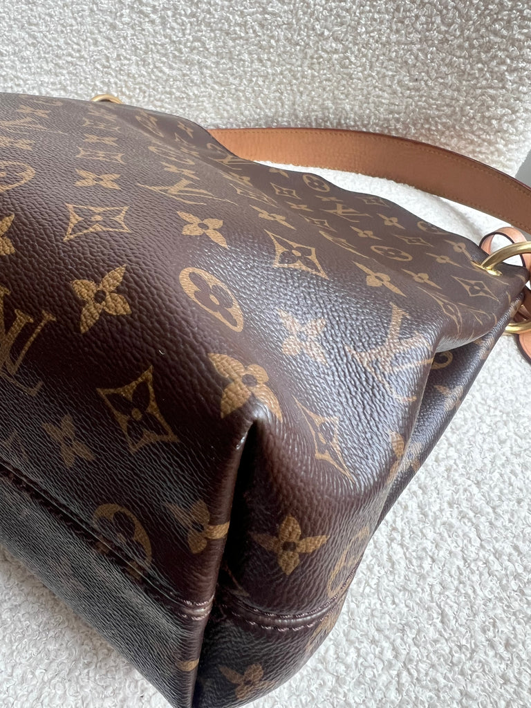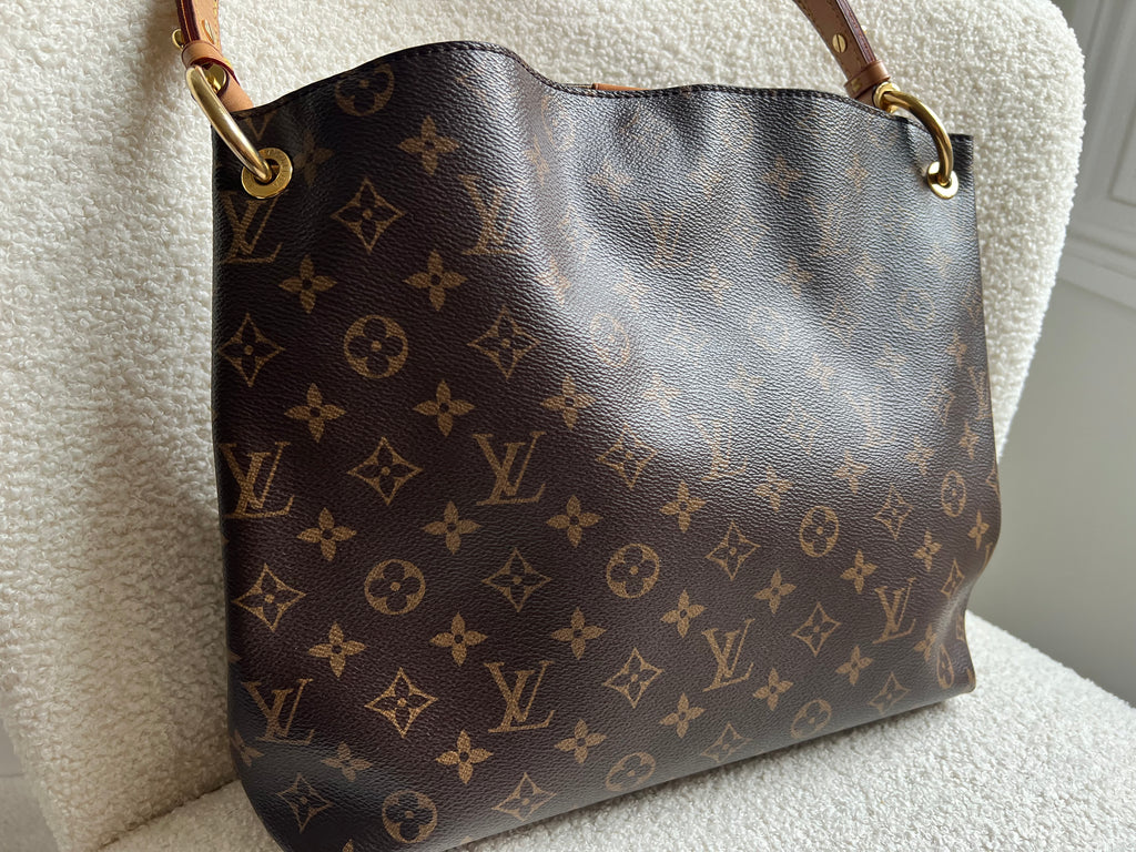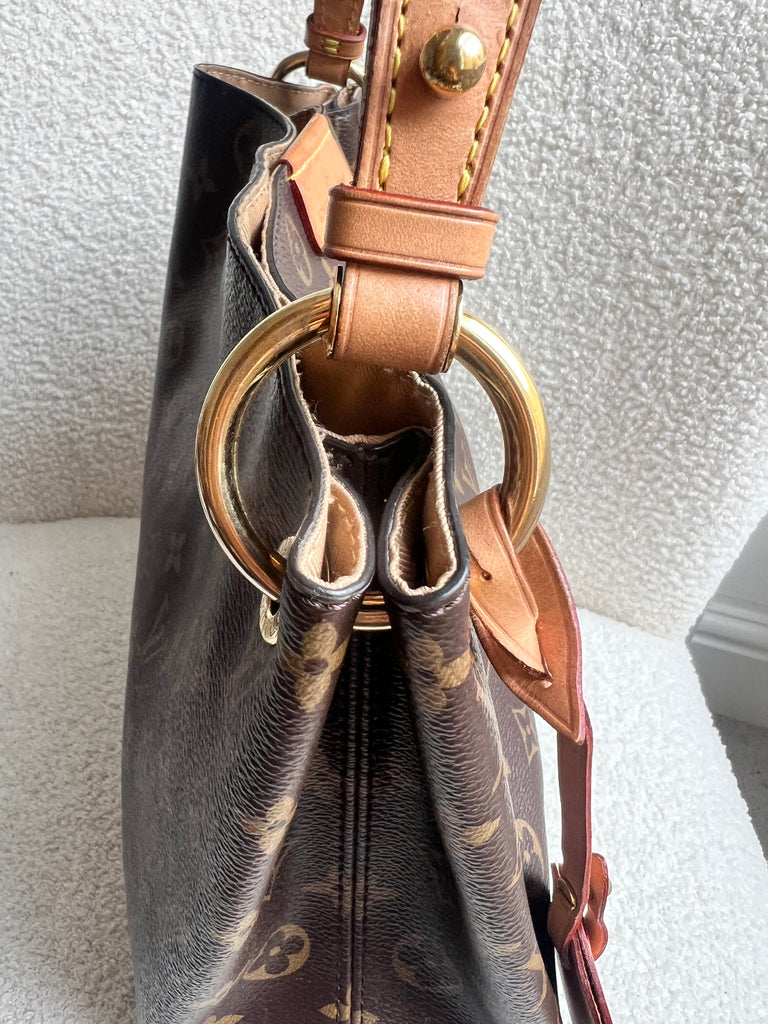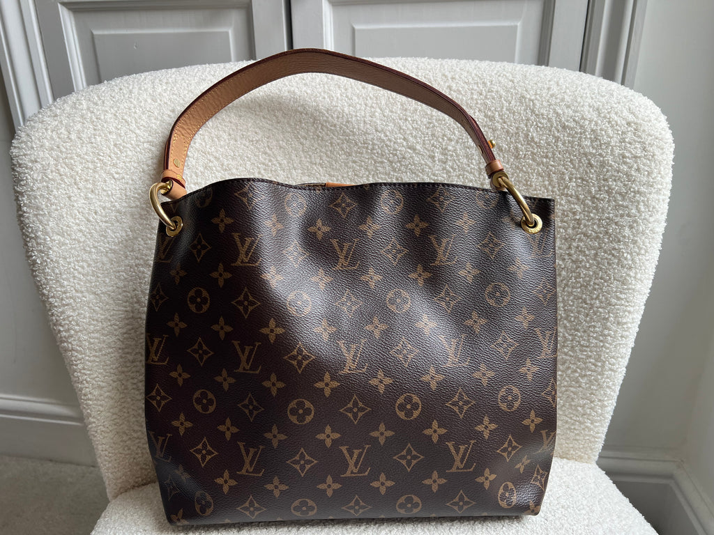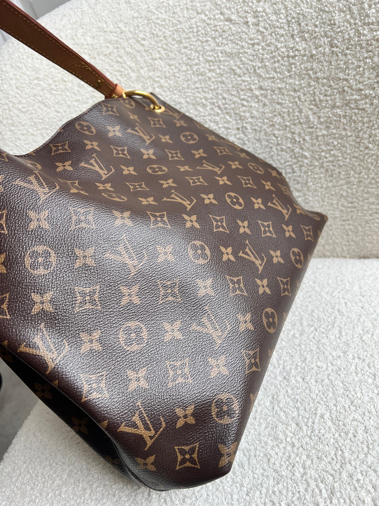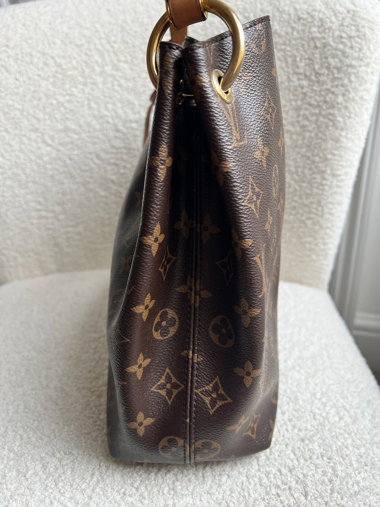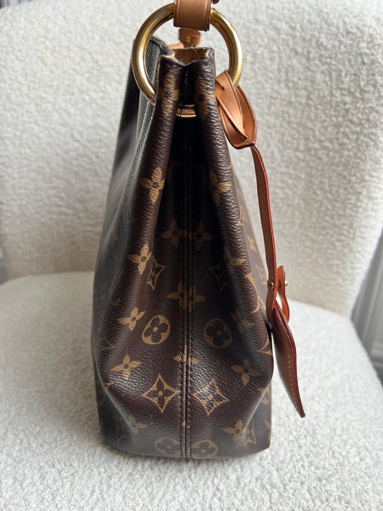 Louis Vuitton Gracefull PM in Monogram canvas with gold hardware. This classic Monogram hobo style shoulder bag has a slouchy slightly shape and is reasonable in size. Perfect for day to day use as it is also very lightweight for its size. This highly sought after style is often sold out online and in store. Can be worn in the crook of the arm or over the shoulder comfortably using the flat handle. Closure by magnetic tab at the opening.