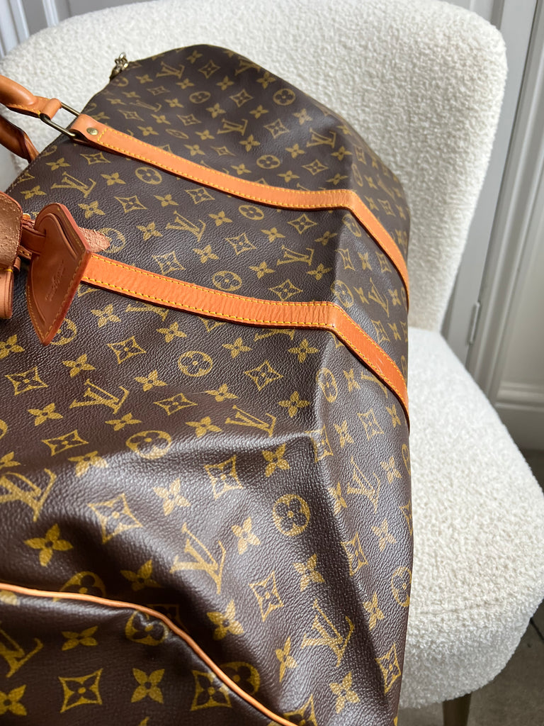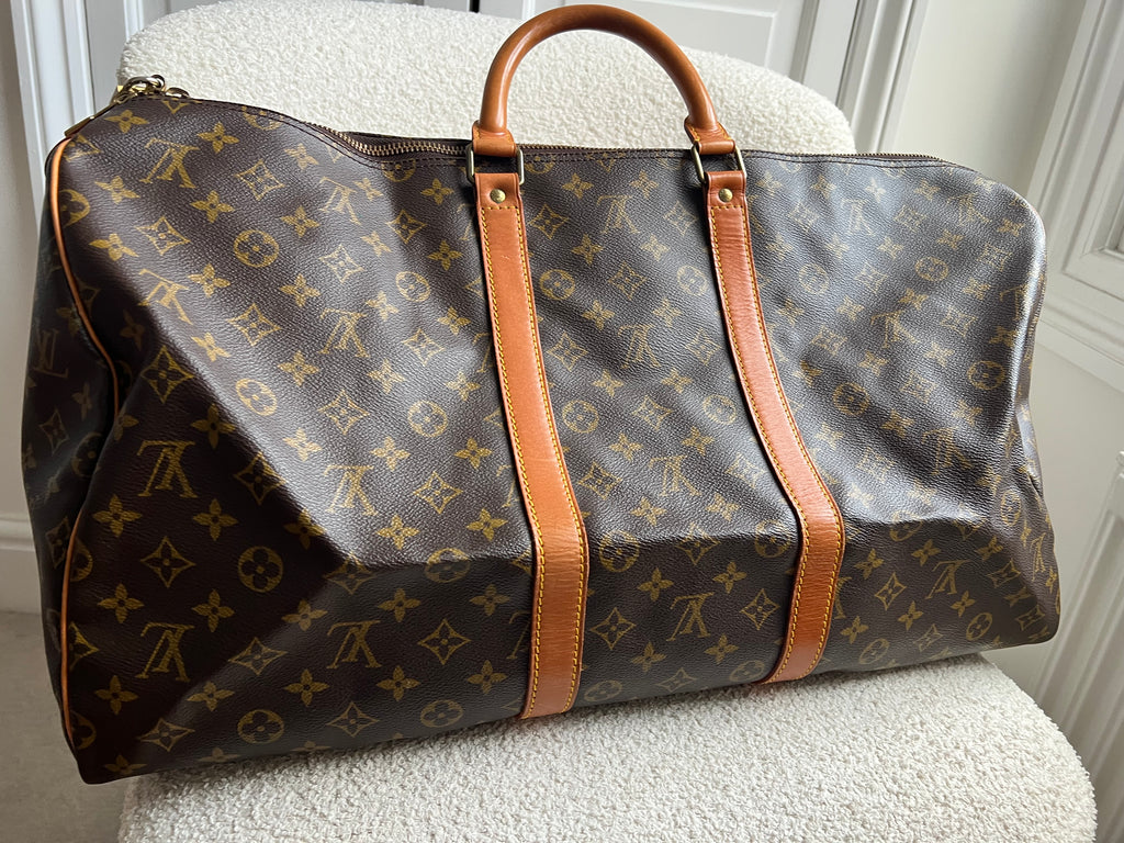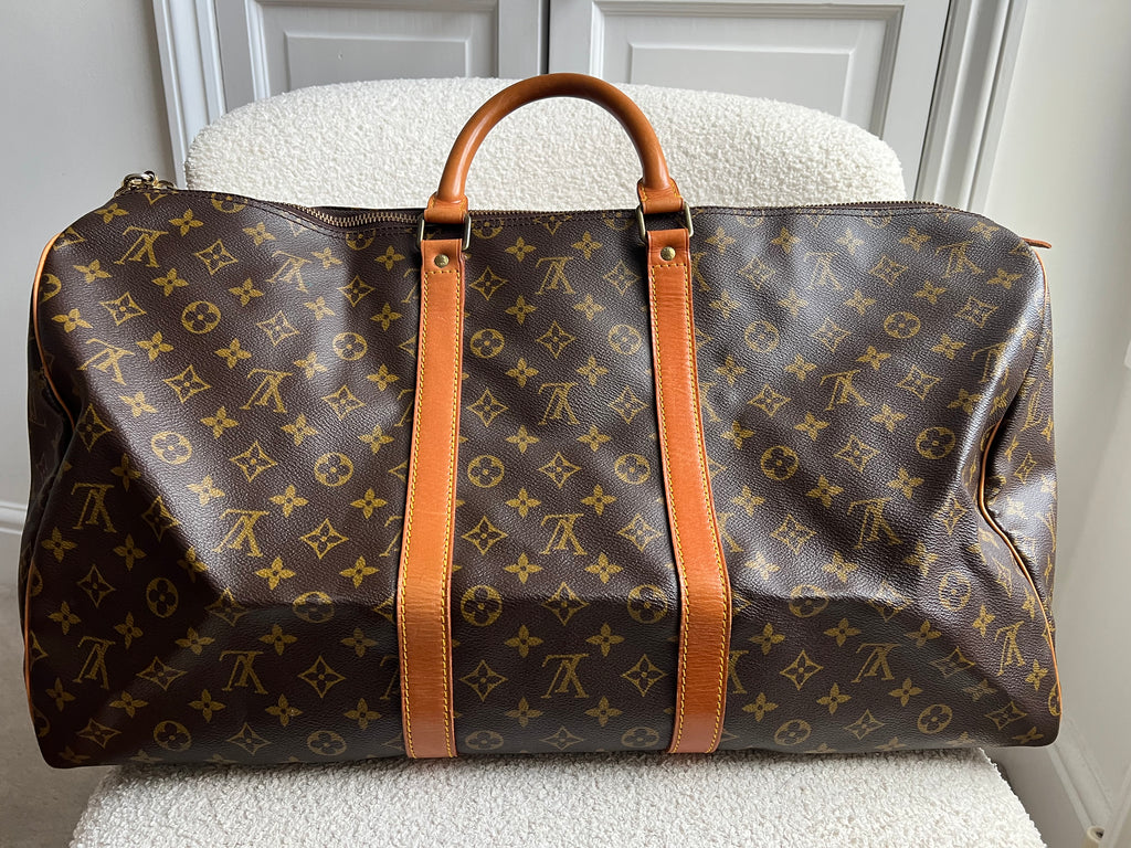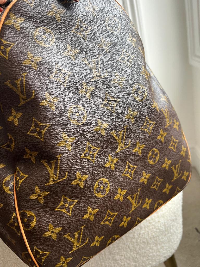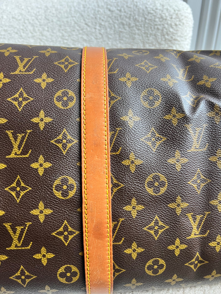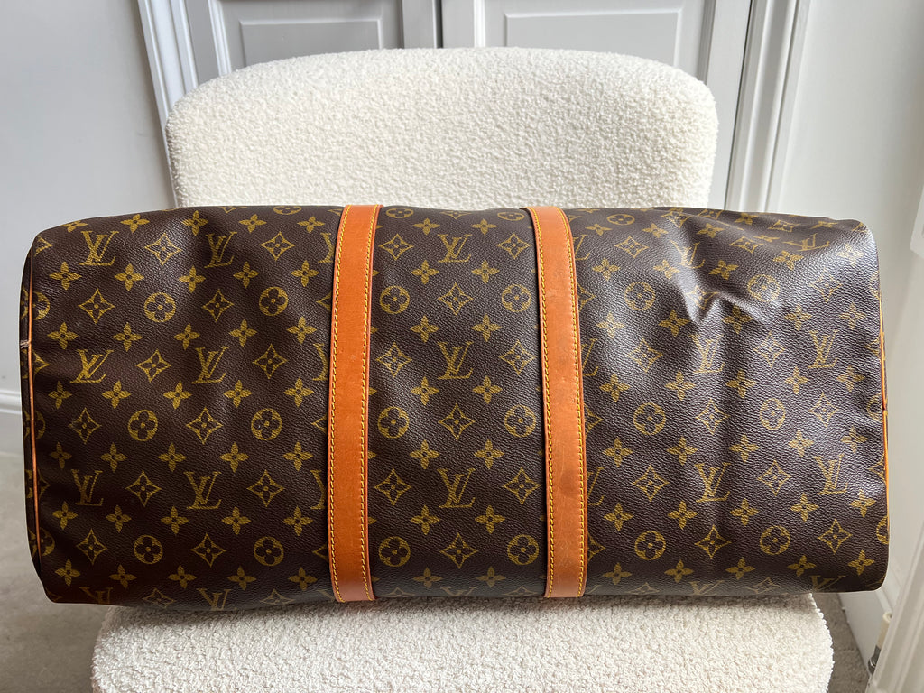 Louis Vuitton Vintage Keepall 55 in Monogram canvas with gold hardware. The classic keepall holdall style is one of Louis Vuitton's most popular styles and is often sold out online and in store. This style is timeless and elegant and is perfect gym use or weekend trips. Slightly slouchy in shape, the Keepall features rolled leather handles and can be carried by hand or in the crook of the arm. 1990s. Note this Keepall style does not come with a long strap and there is no D rings to attach a strap.