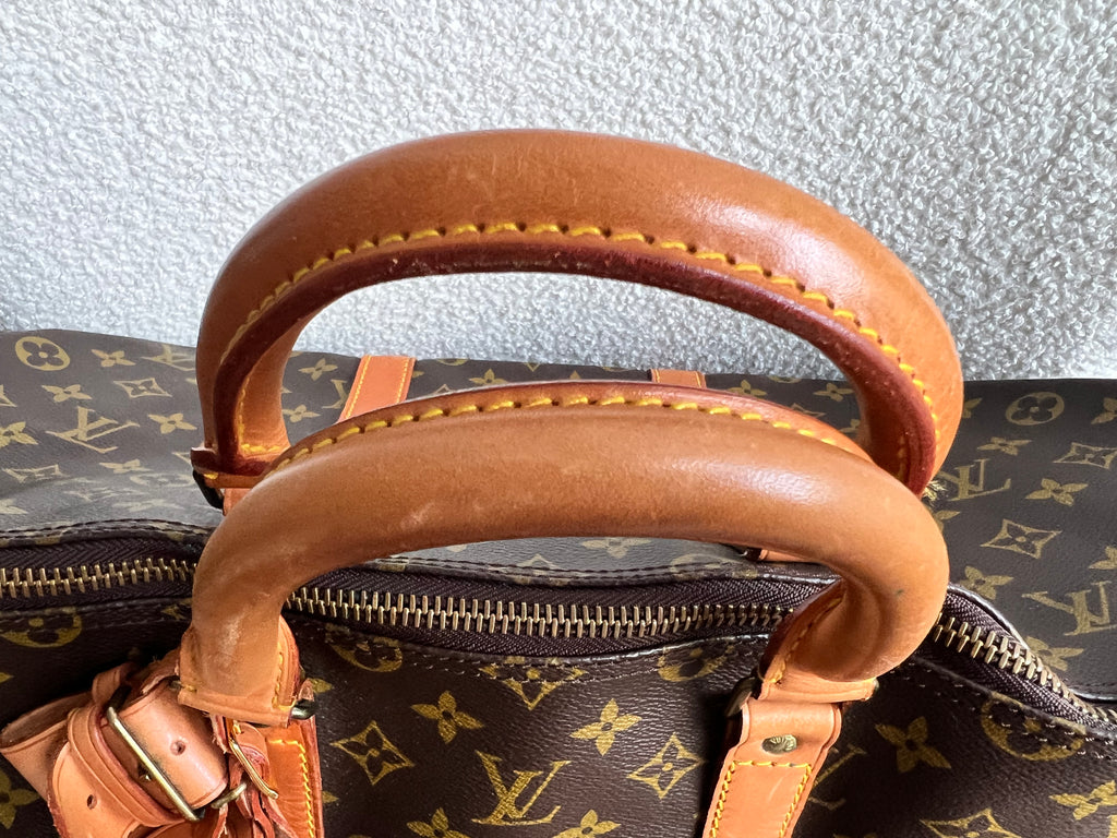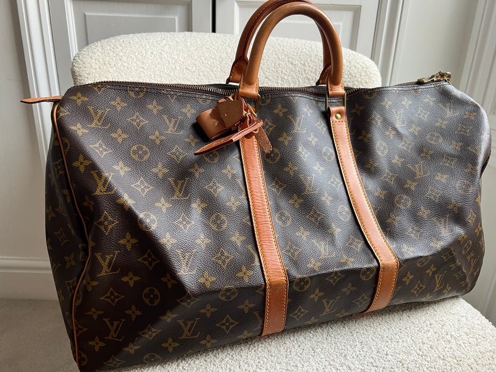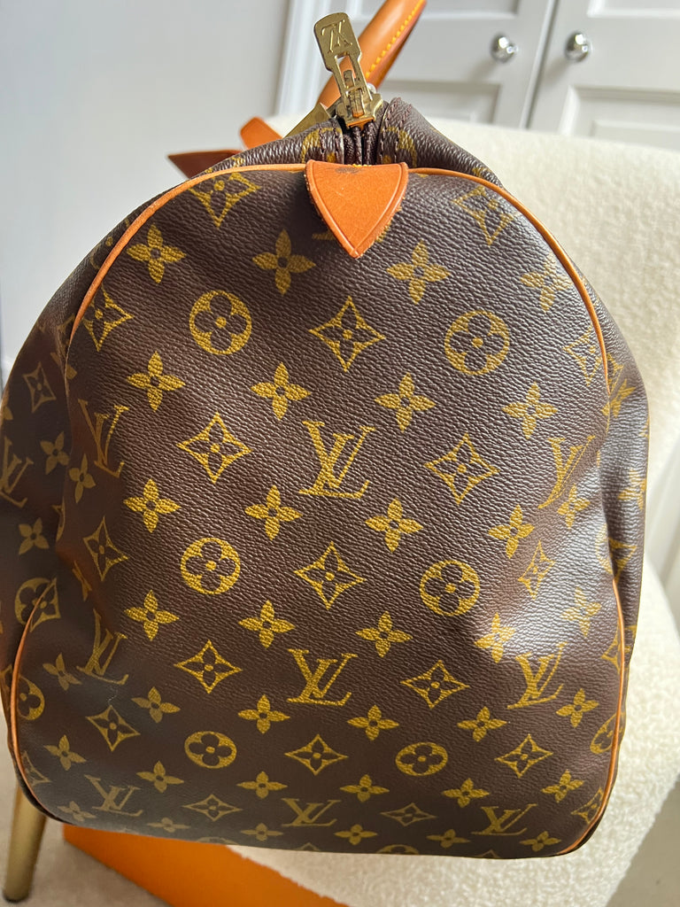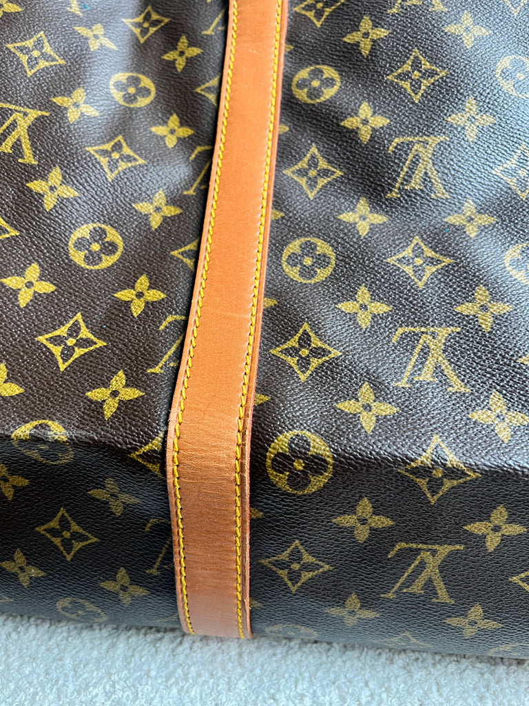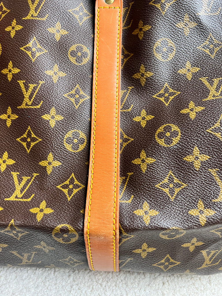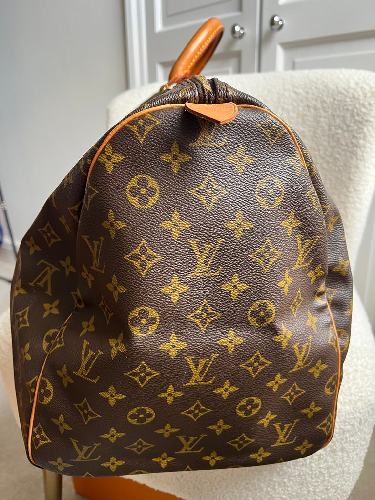 Louis Vuitton Vintage Keepall 55 in Monogram canvas with gold hardware. The classic keepall holdall style is one of Louis Vuitton's most popular styles and is often sold out online and in store. This style is timeless and elegant and is perfect gym use or weekend trips. Slightly slouchy in shape, the Keepall features rolled leather handles and can be carried by hand or in the crook of the arm. 1990s. Note this Keepall style does not come with a long strap and there is no D rings to attach a strap.