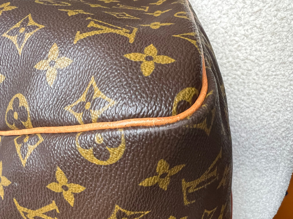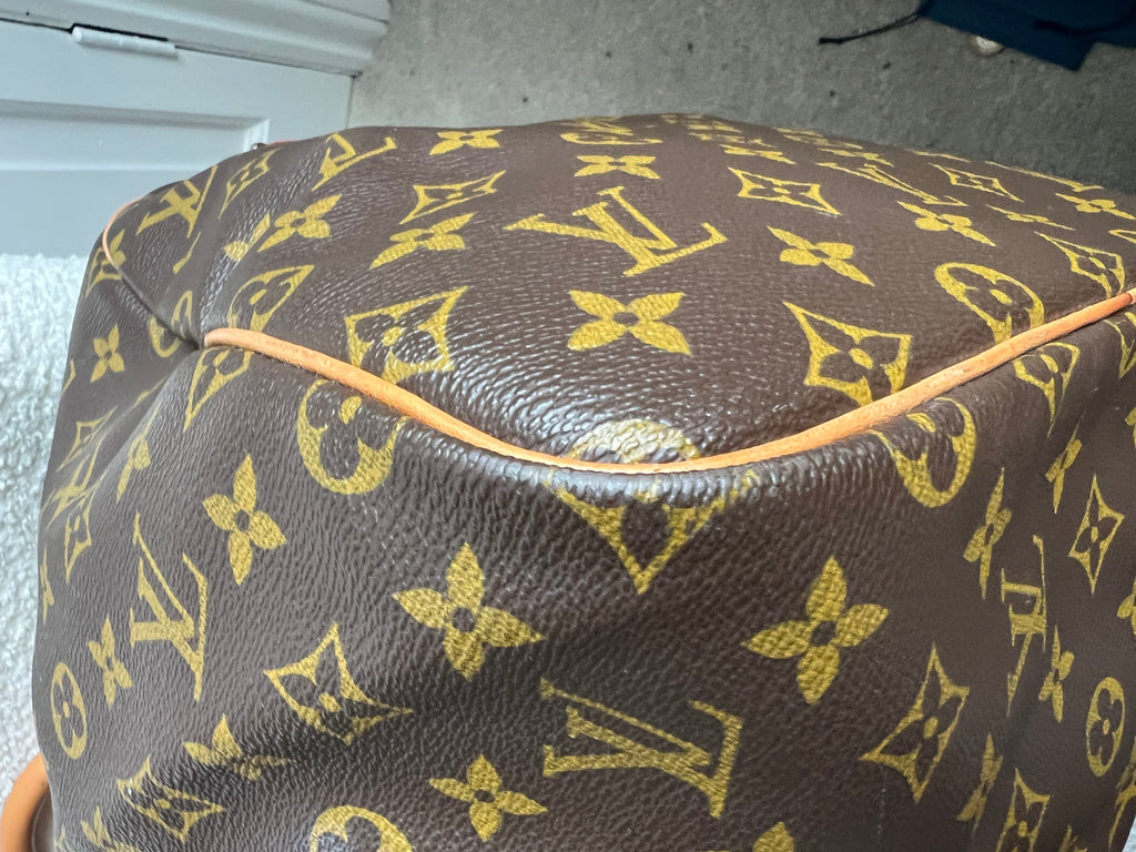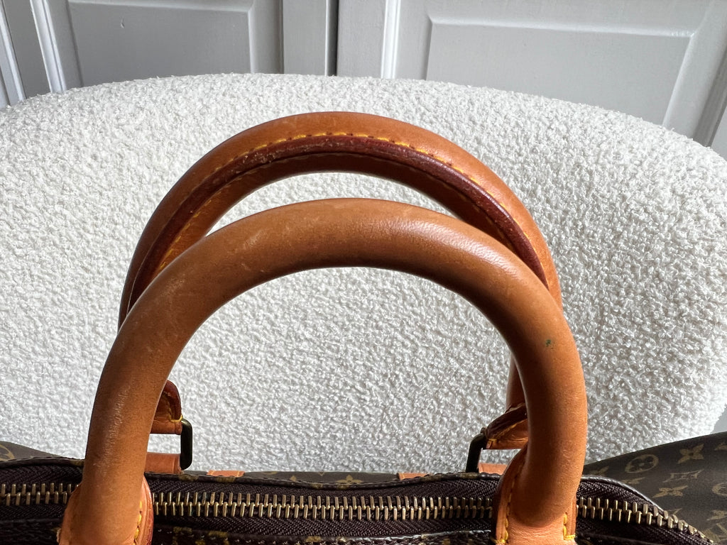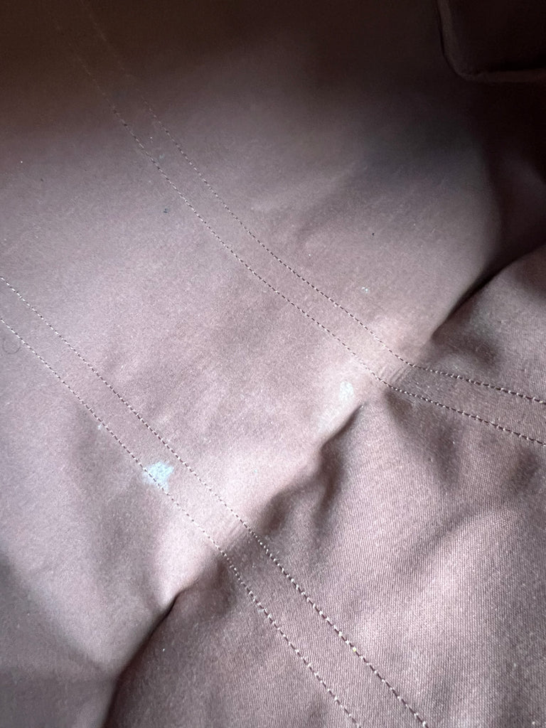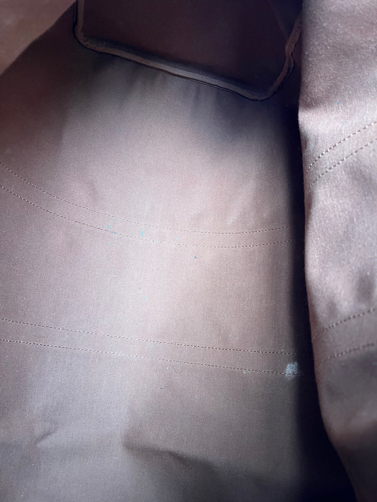 Exterior: Overall good condition with general wear. There are marks to the leather trim and some small marks to the canvas. Some rubbing to corners and handles have some marks. Leather trim has a medium patina. Canvas has creases from being stored flat.