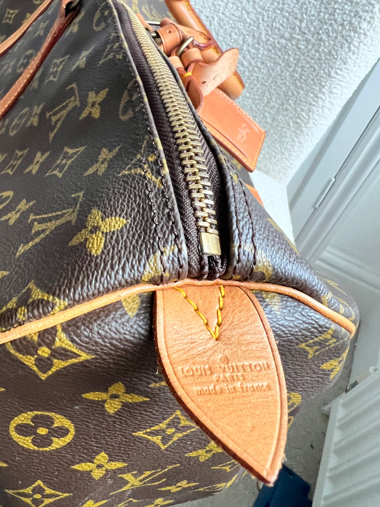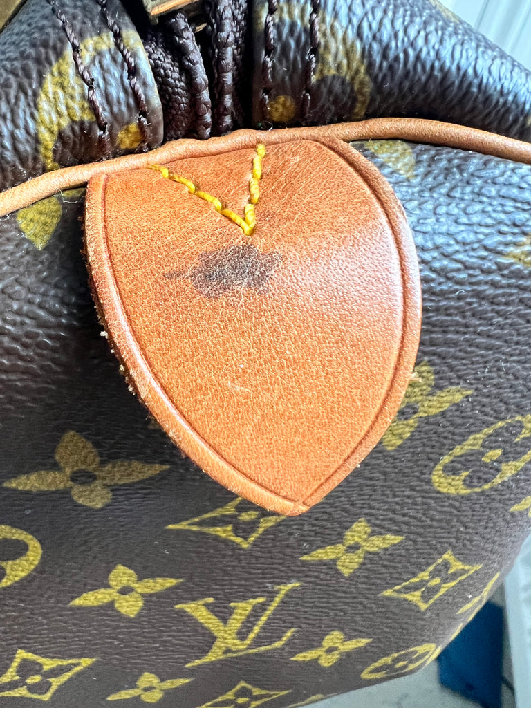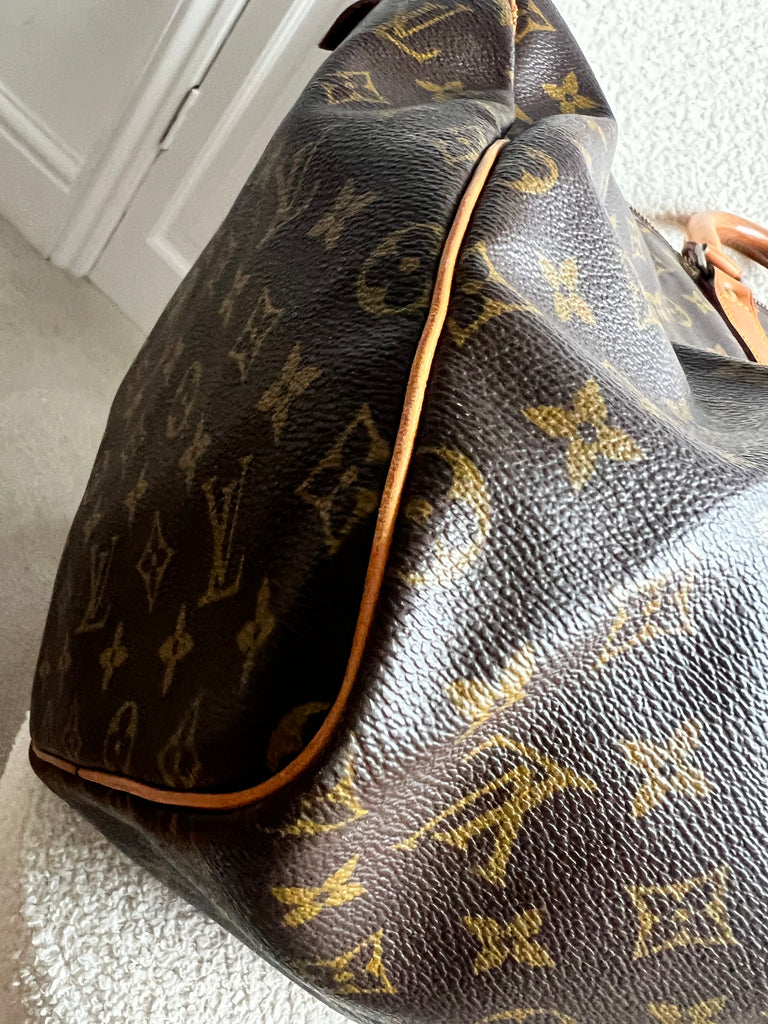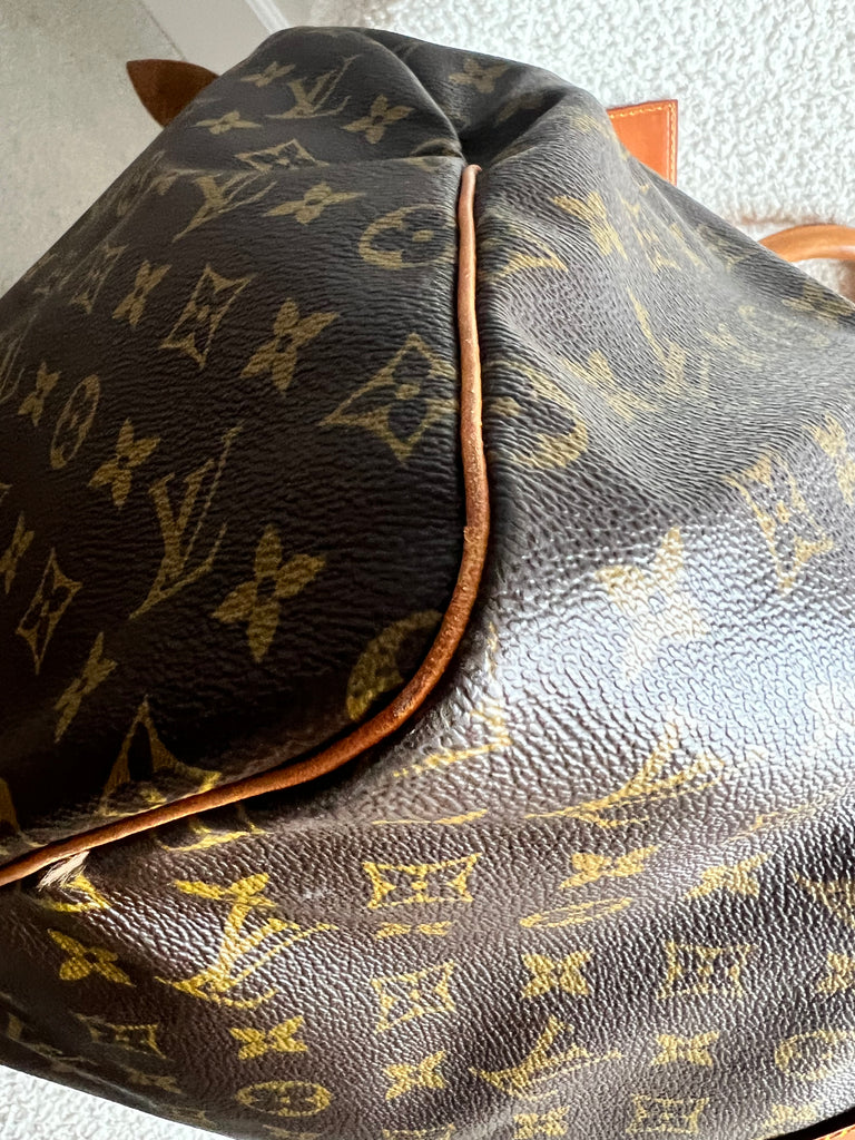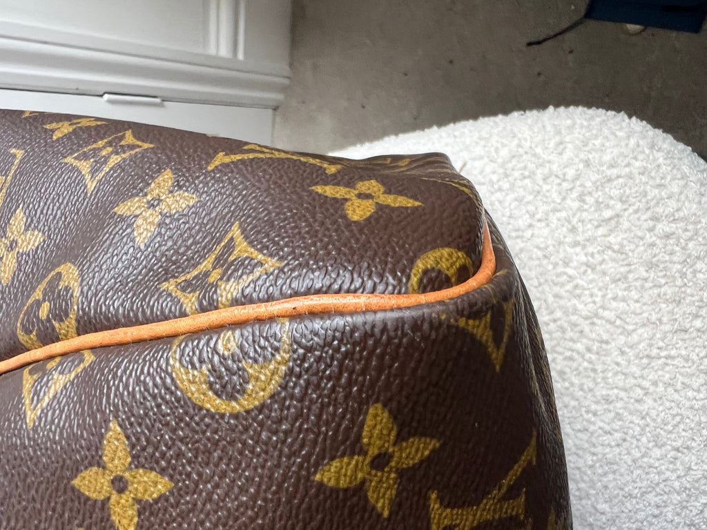 Exterior: Overall good condition with general wear. There are marks to the leather trim and some small marks to the canvas. Some rubbing to corners and handles have some marks. Leather trim has a medium patina. Canvas has creases from being stored flat.