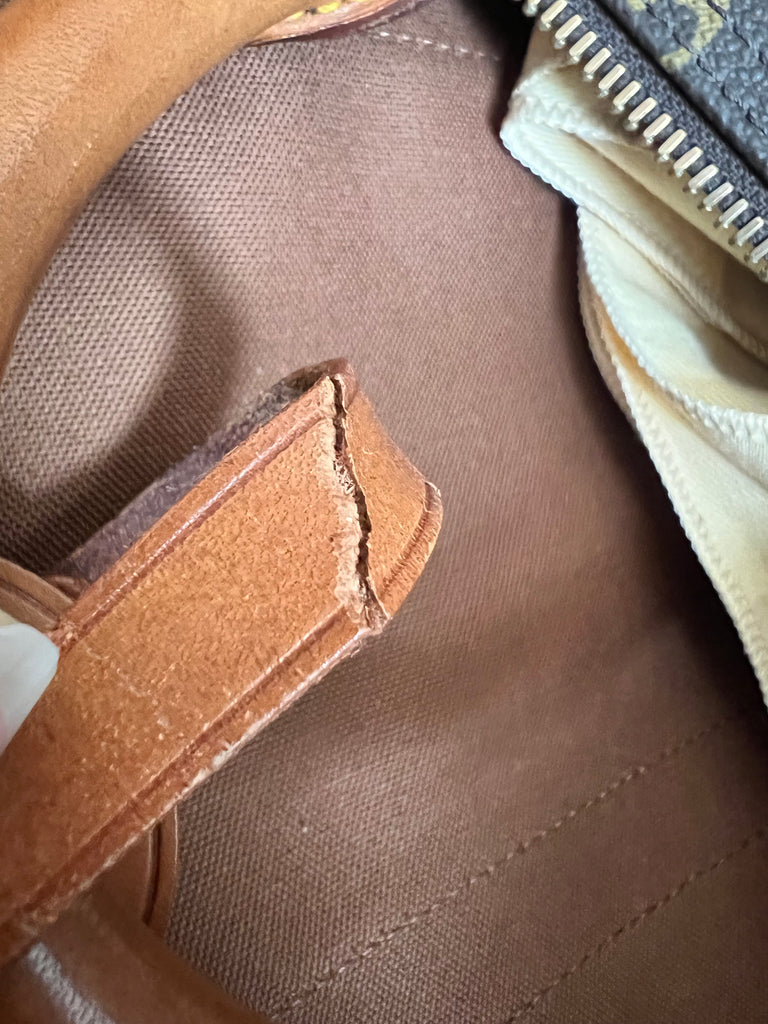 Exterior: Good condition given the age with small signs of use. Some general marks to the canvas and general wear and patina to leather sections. General wear to the handles. Cracking to the small strap of the luggage tag.