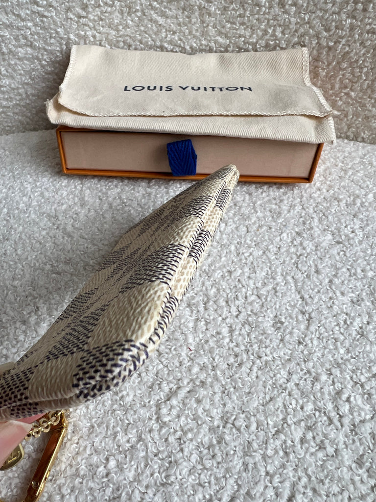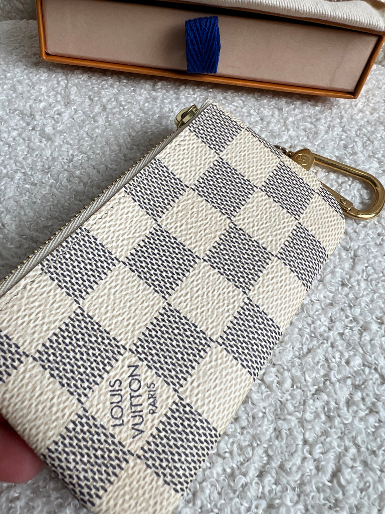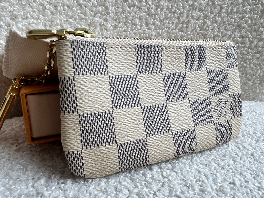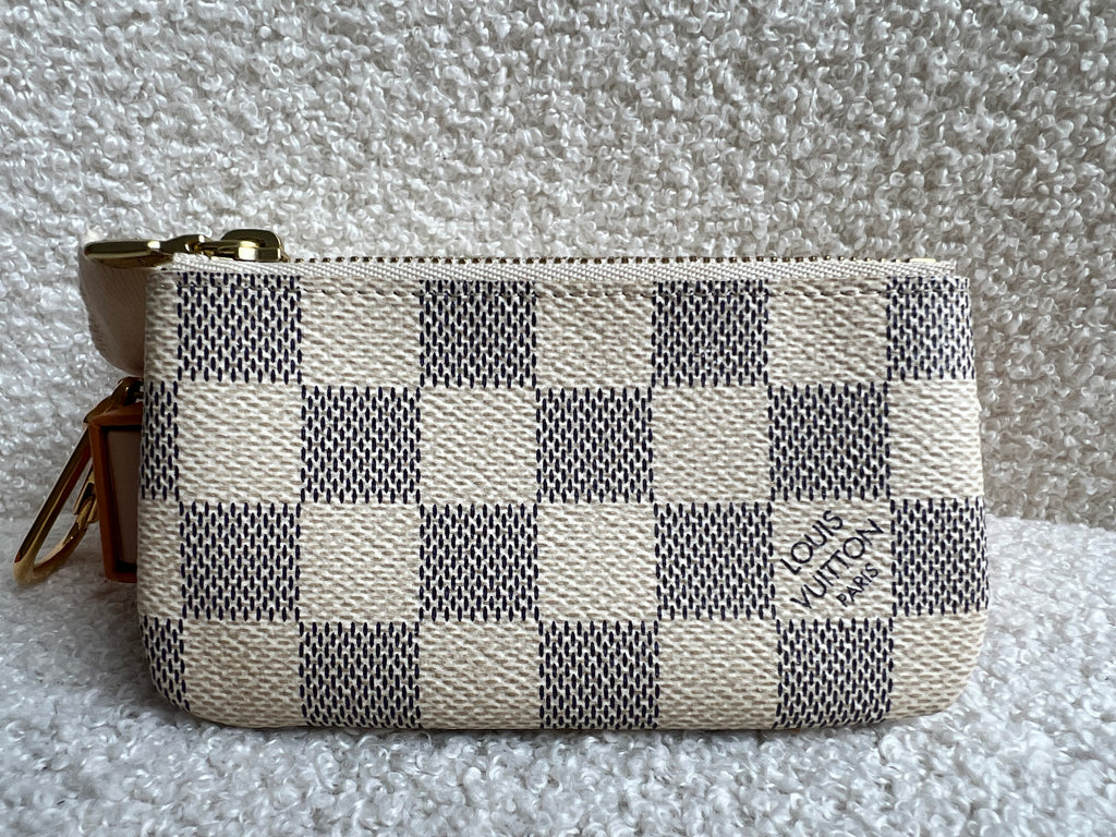 Louis Vuitton Key Pouch in Damier Azur. This practical accessory can carry coins, cards, folded notes and other small items in addition to keys. Secured with LV engraved zip, it can be hooked onto the inside of another LV bag, or simply carried in hand or used as a charm.