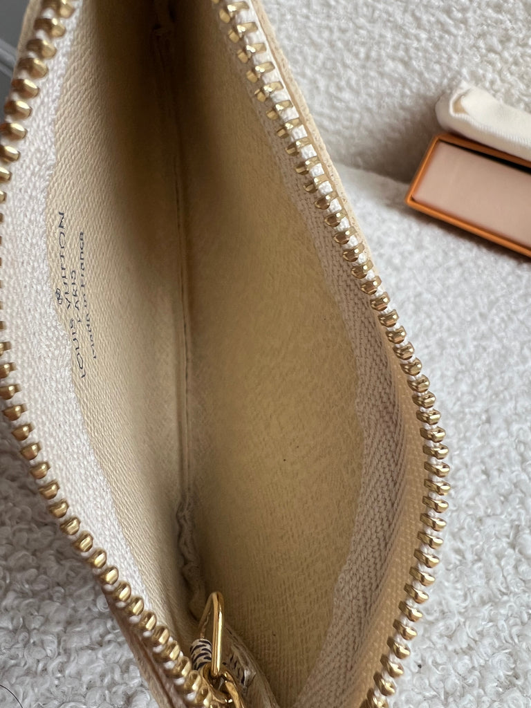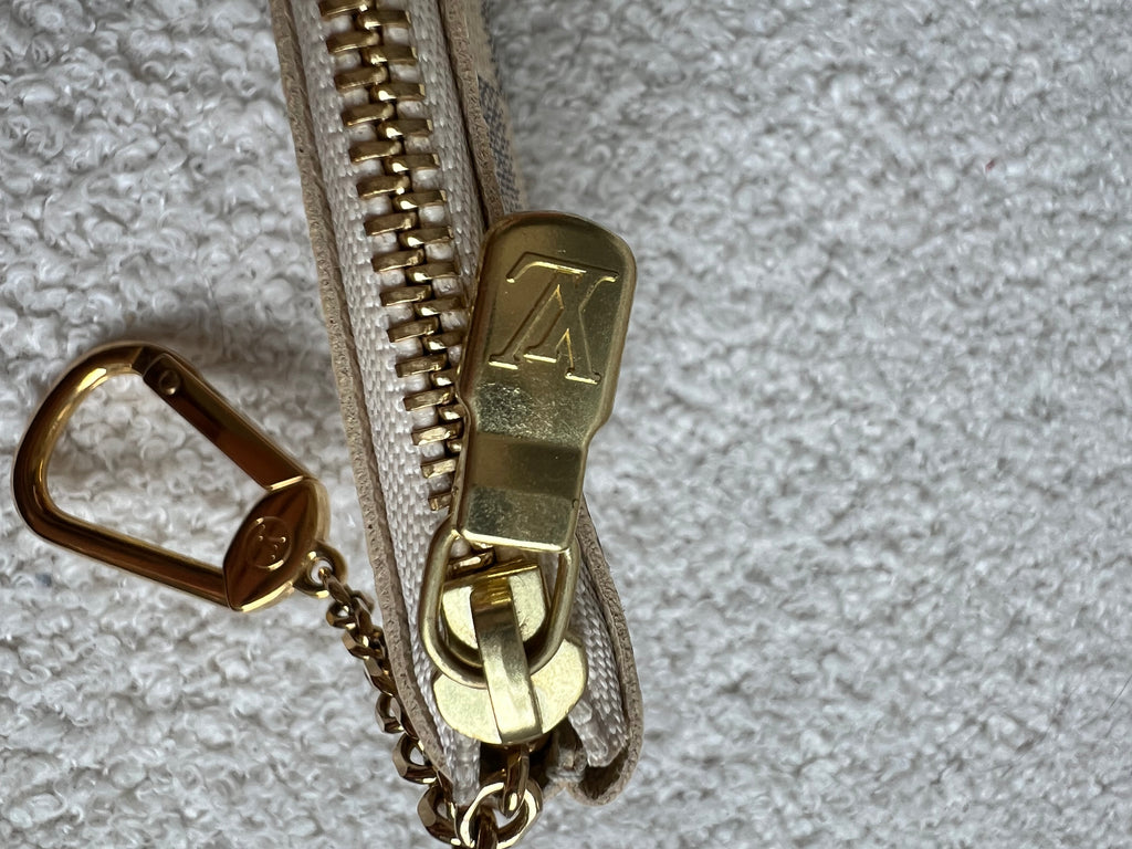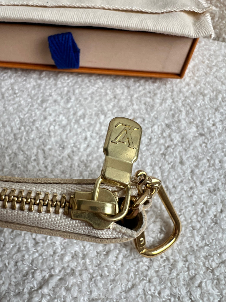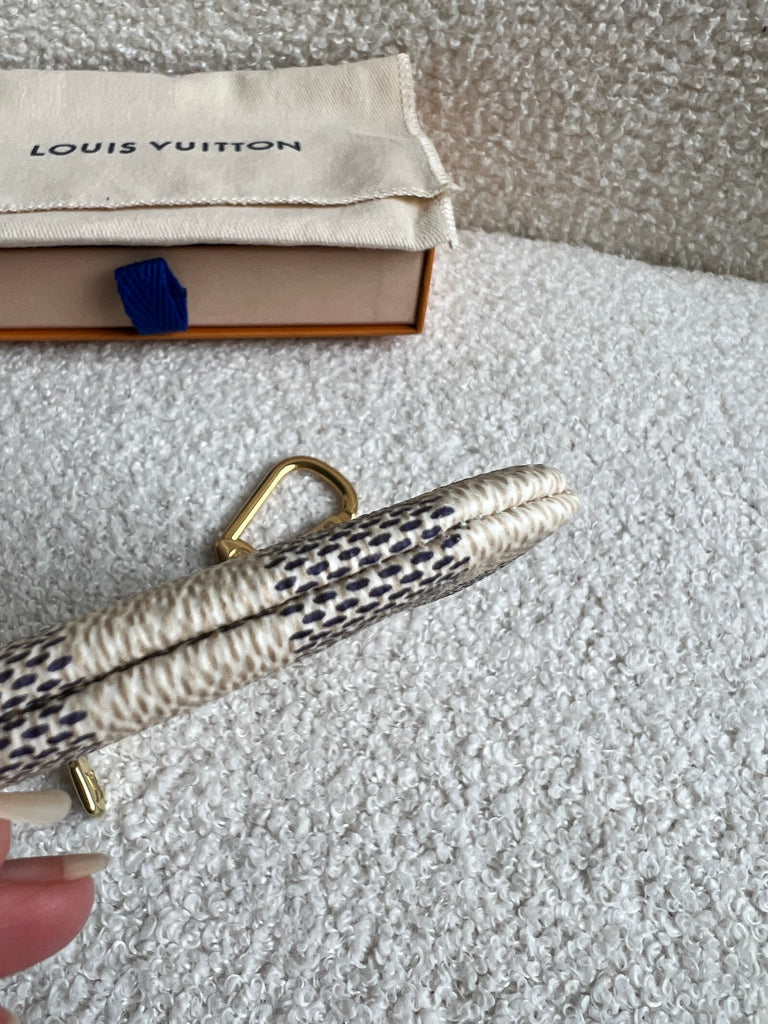 Louis Vuitton Key Pouch in Damier Azur. This practical accessory can carry coins, cards, folded notes and other small items in addition to keys. Secured with LV engraved zip, it can be hooked onto the inside of another LV bag, or simply carried in hand or used as a charm.