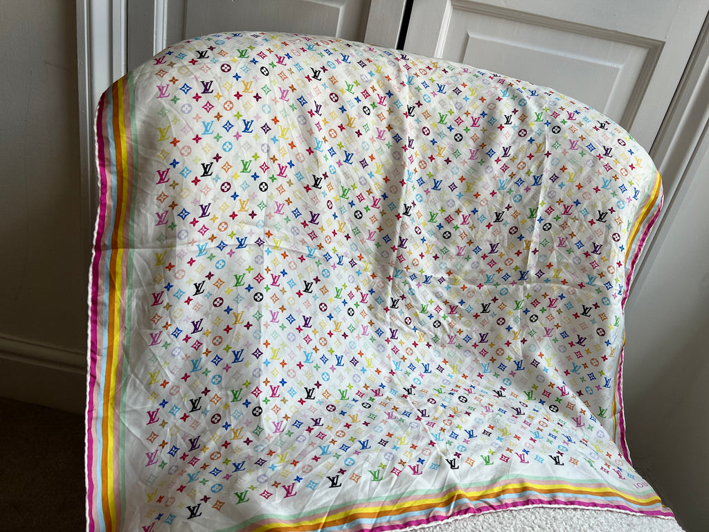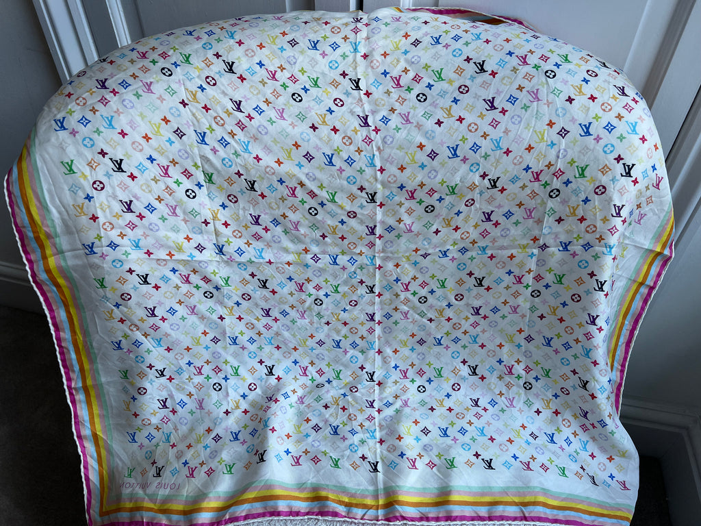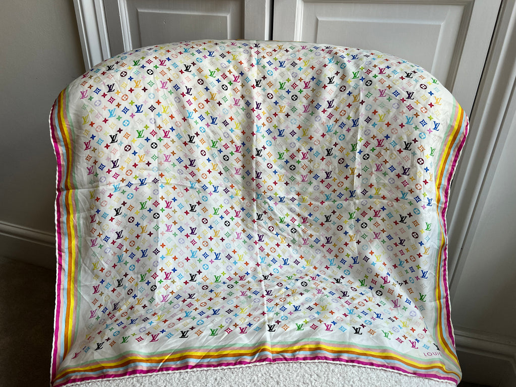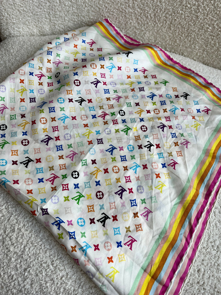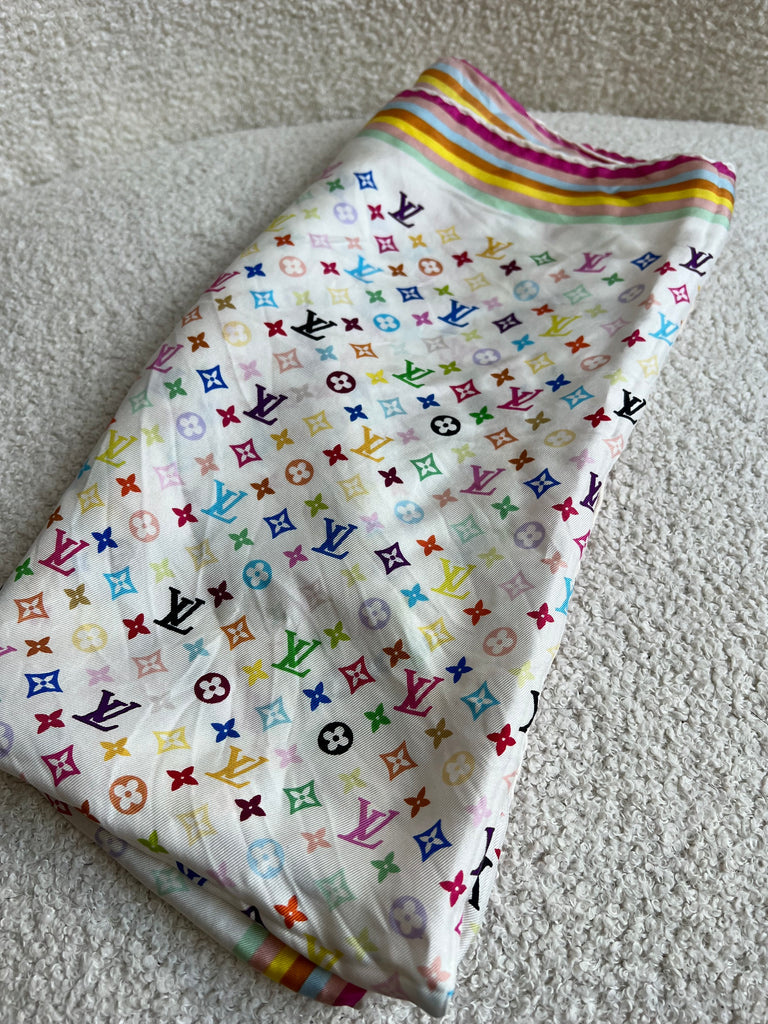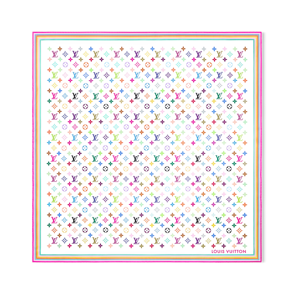 Louis Vuitton Takashi Murakami Silk square. This sumptuous accessory is spun from lustrous pure silk and is printed with Murakami’s reinterpretation of the signature LV pattern. Rendered in a vibrant palette of 33 high-definition hues, the motifs stand out brilliantly against a pristine white background.This stylish accessory can be worn around the neck, or hair.