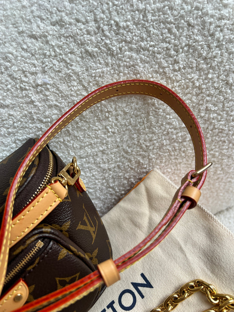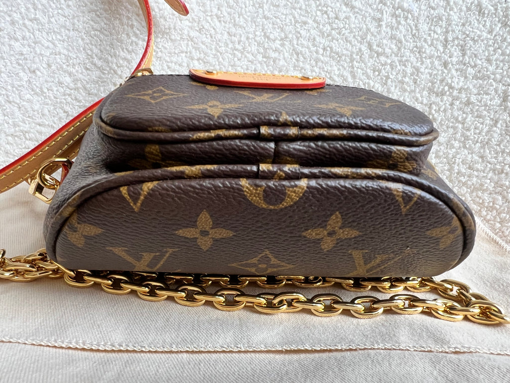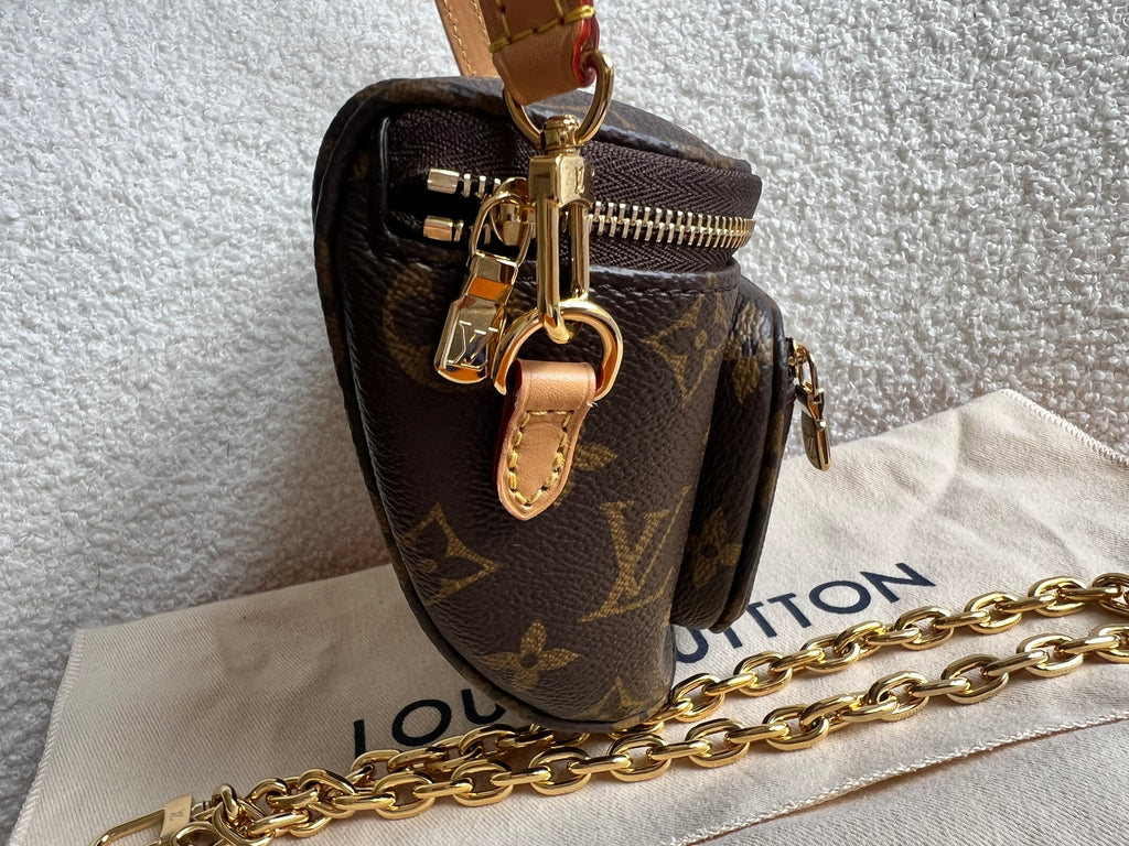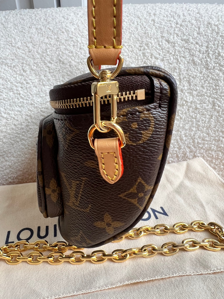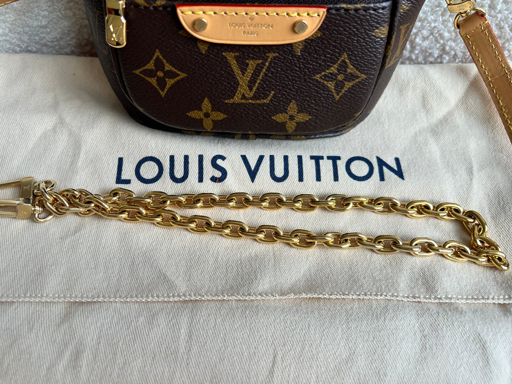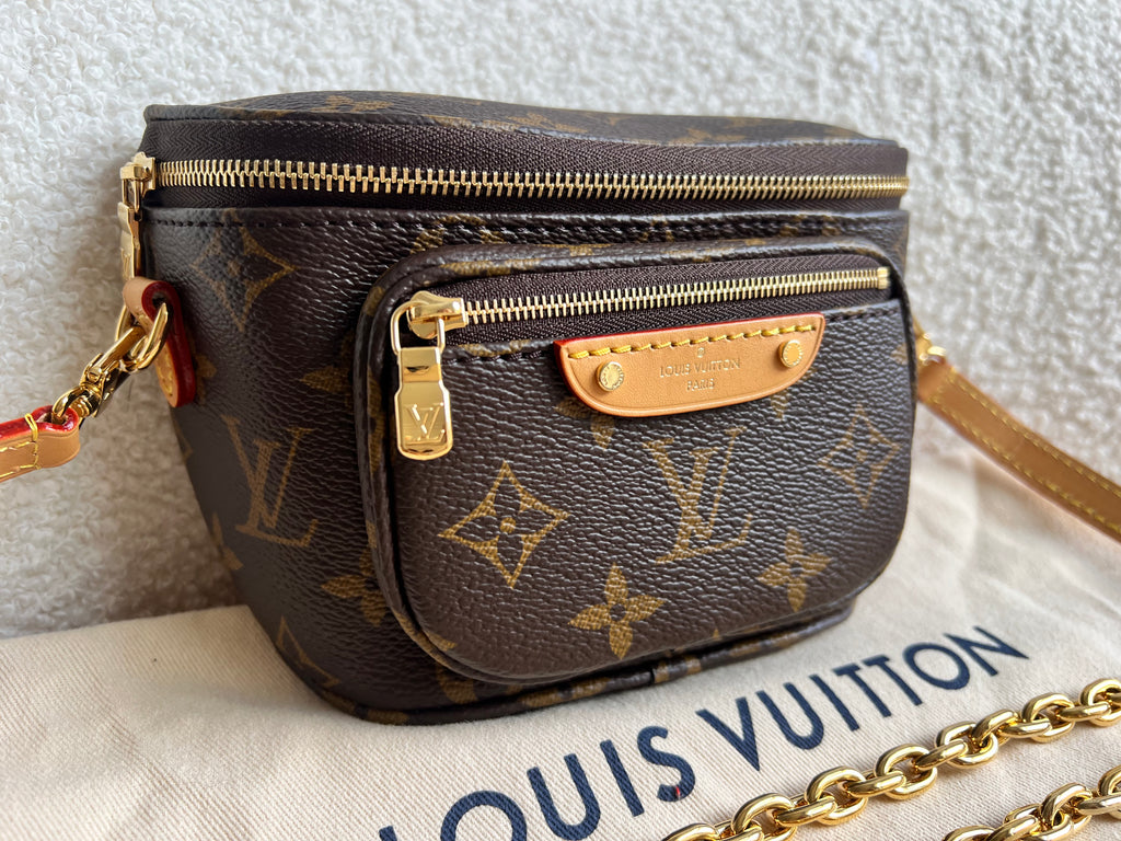 Louis Vuitton Mini Bum Bag in Canvas Monogram with gold hardware. The Mini Bumbag in Monogram canvas is a mini version of the on-trend bumbag format. Designed for versatility, it features a removable, adjustable strap in the emblematic natural leather, as well as a removable gold-colour chain, which can be functional or decorative. The bag has a zipped main compartment and a zipped front pocket with an embossed leather tag. Can be worn using leather strap or chain.