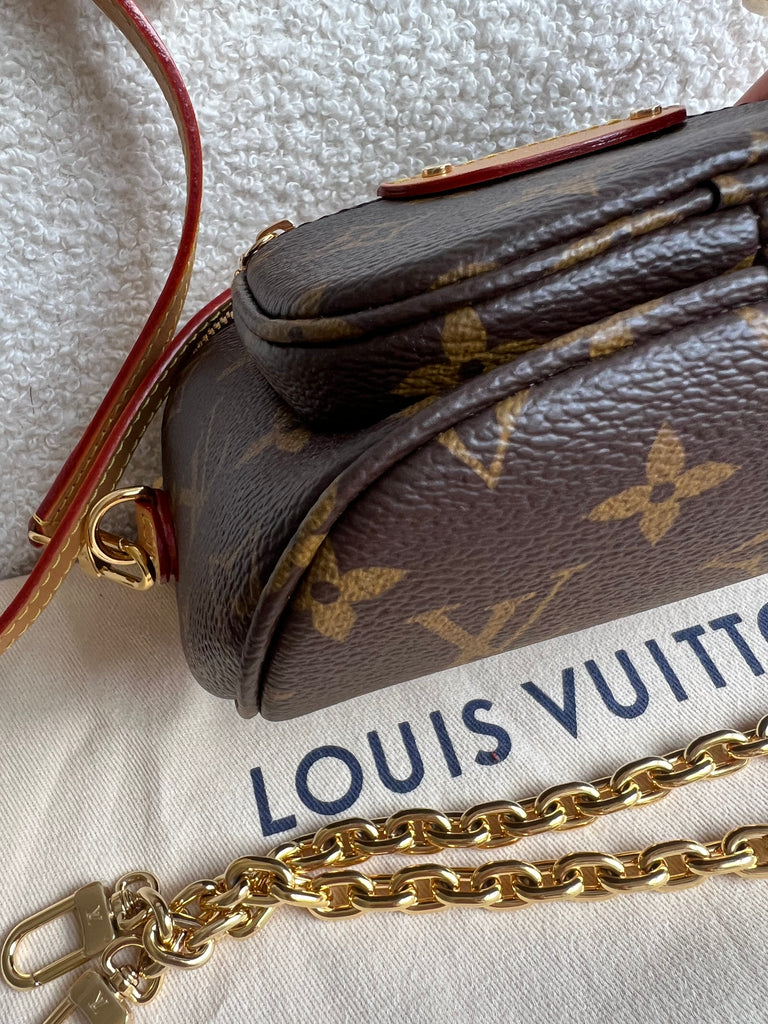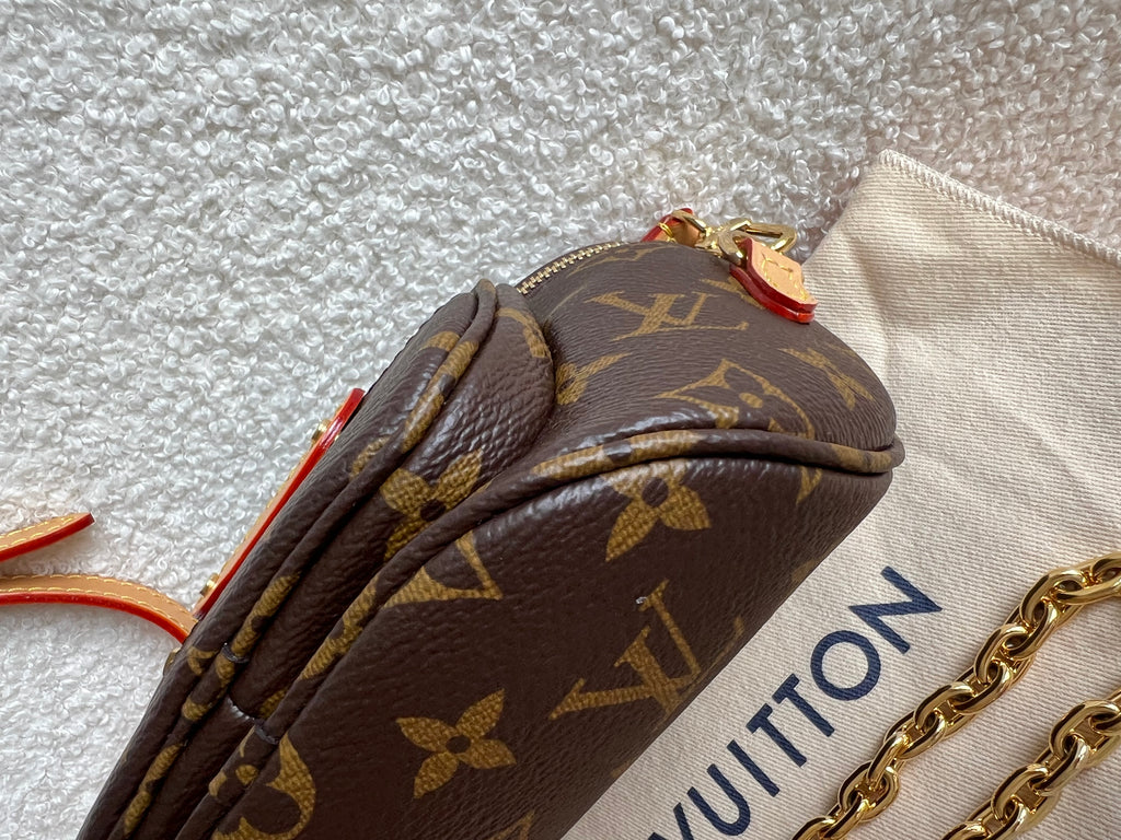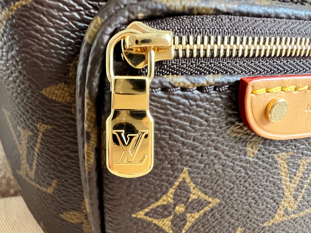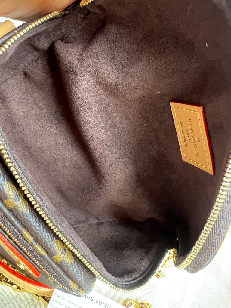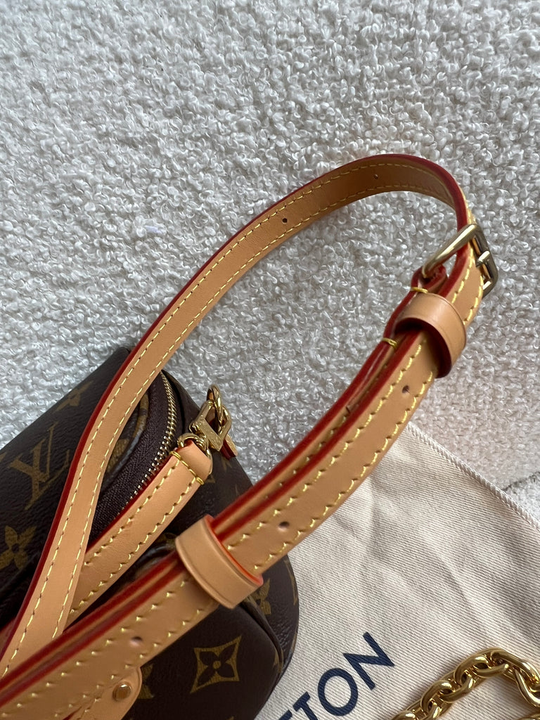 Louis Vuitton Mini Bum Bag in Canvas Monogram with gold hardware. The Mini Bumbag in Monogram canvas is a mini version of the on-trend bumbag format. Designed for versatility, it features a removable, adjustable strap in the emblematic natural leather, as well as a removable gold-colour chain, which can be functional or decorative. The bag has a zipped main compartment and a zipped front pocket with an embossed leather tag. Can be worn using leather strap or chain.