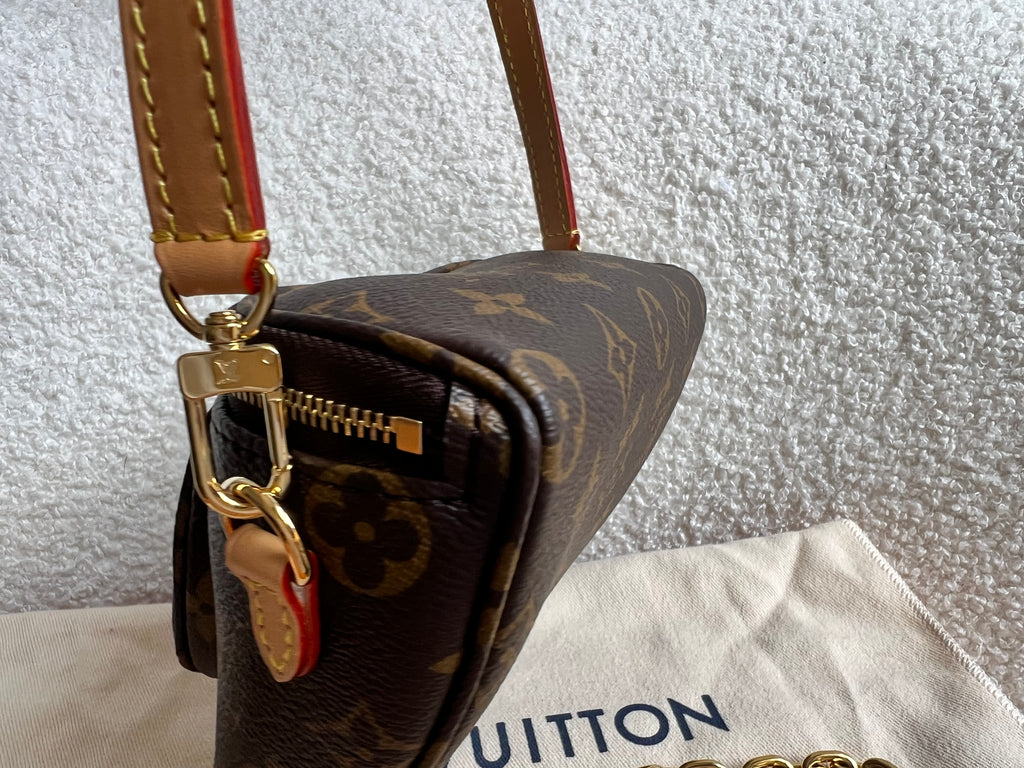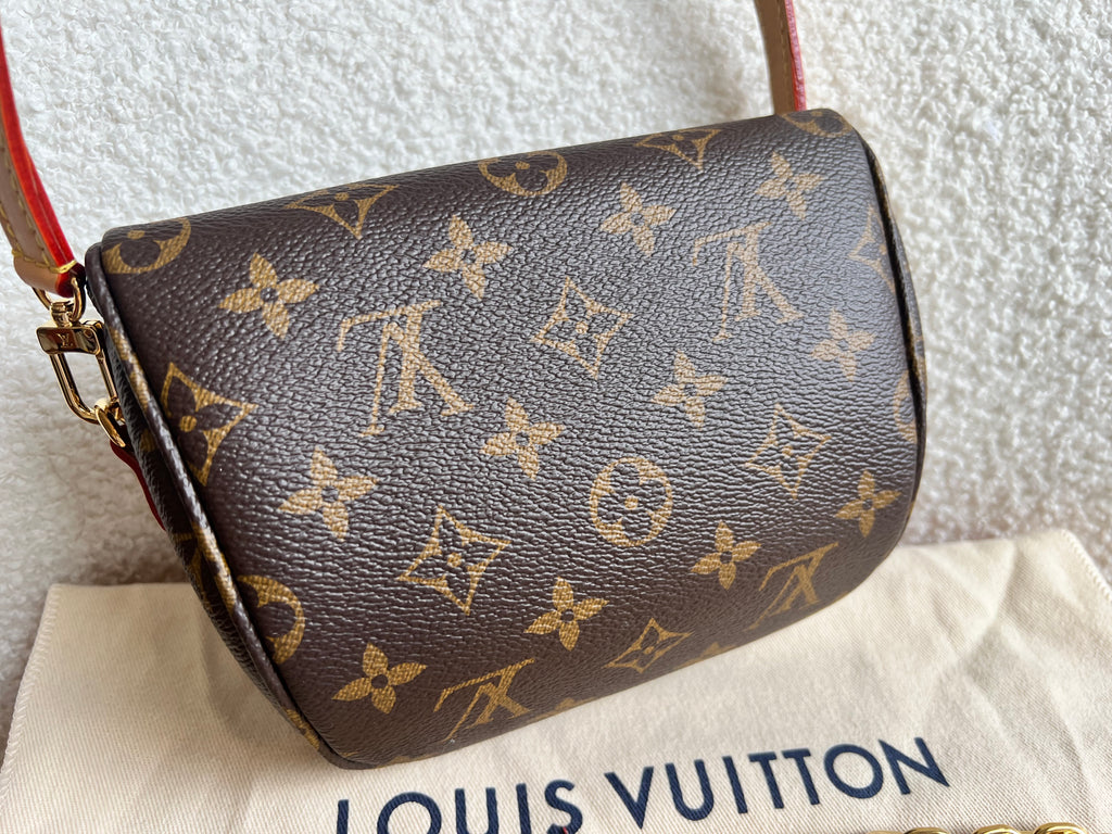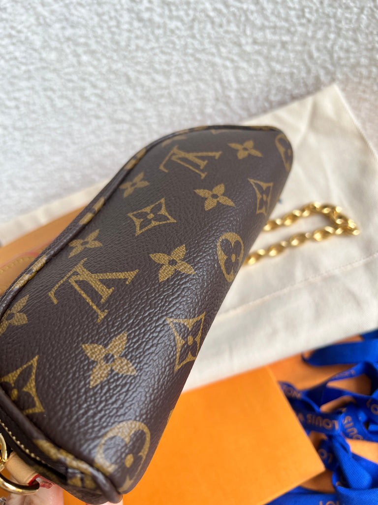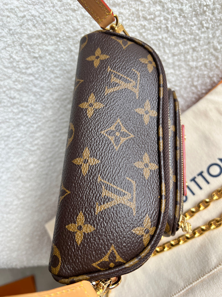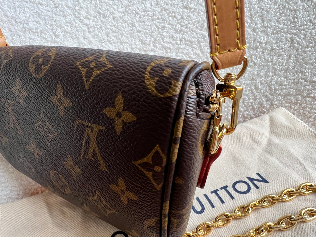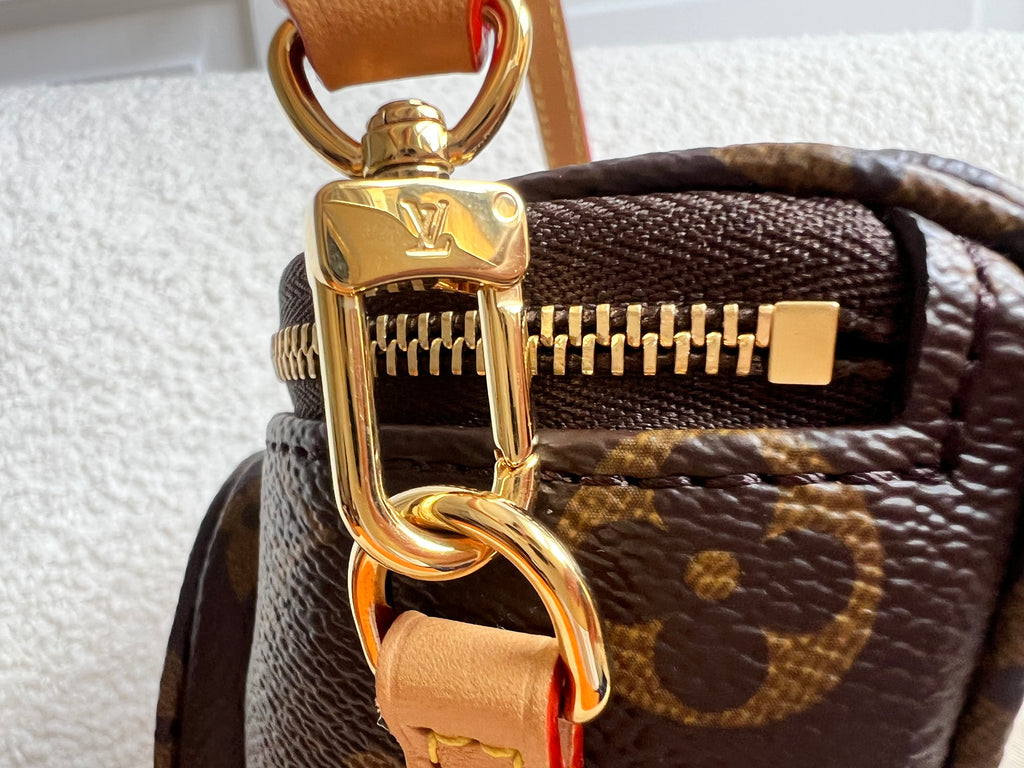 Louis Vuitton Mini Bum Bag in Canvas Monogram with gold hardware. The Mini Bumbag in Monogram canvas is a mini version of the on-trend bumbag format. Designed for versatility, it features a removable, adjustable strap in the emblematic natural leather, as well as a removable gold-colour chain, which can be functional or decorative. The bag has a zipped main compartment and a zipped front pocket with an embossed leather tag. Can be worn using leather strap or chain.