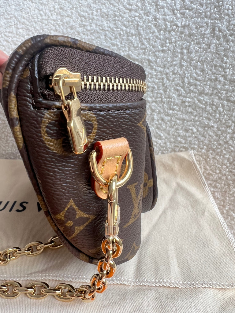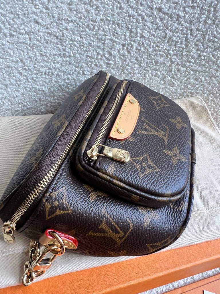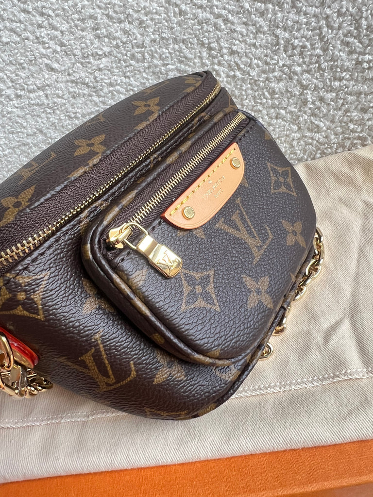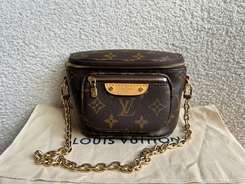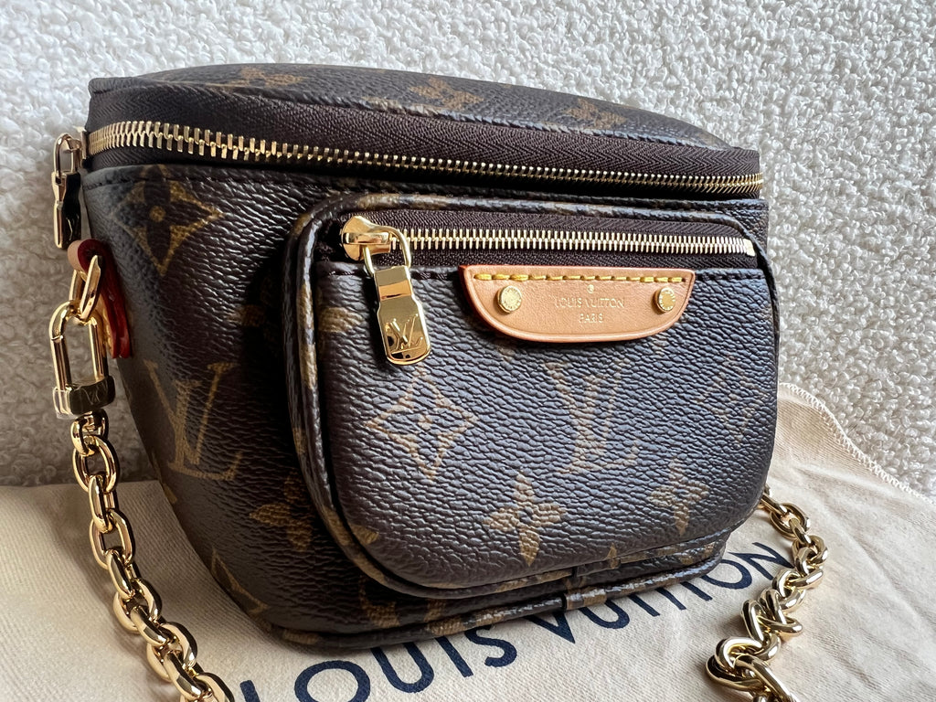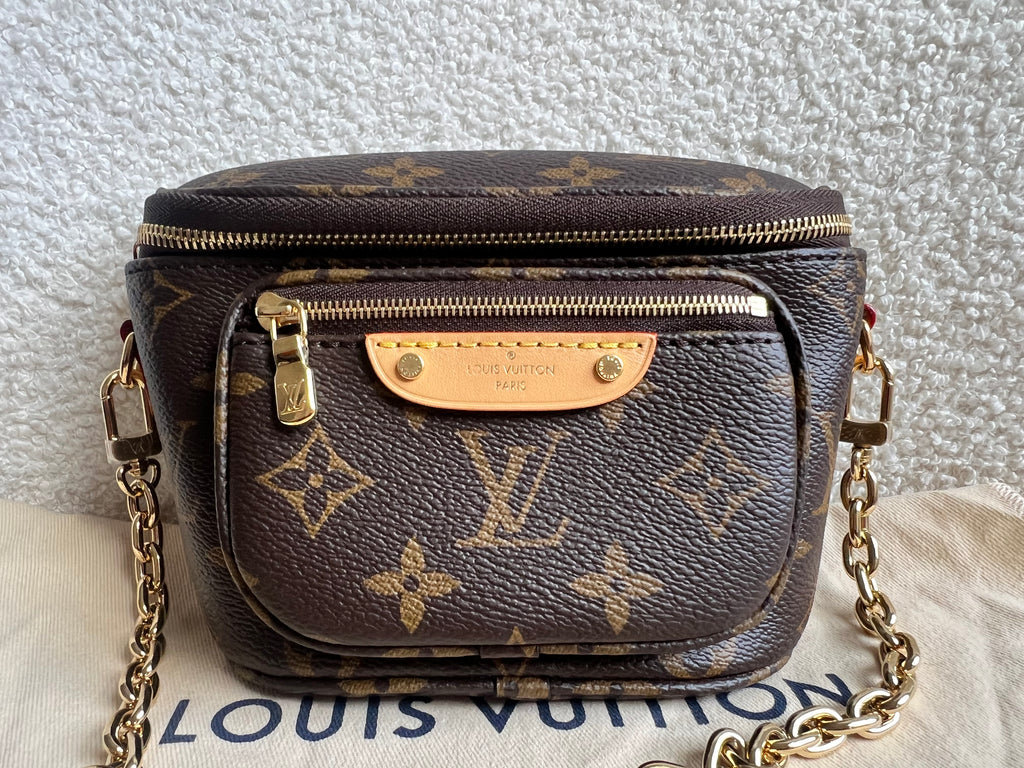 Louis Vuitton Mini Bum Bag in Canvas Monogram with gold hardware. The Mini Bumbag in Monogram canvas is a mini version of the on-trend bumbag format. Designed for versatility, it features a removable, adjustable strap in the emblematic natural leather, as well as a removable gold-colour chain, which can be functional or decorative. The bag has a zipped main compartment and a zipped front pocket with an embossed leather tag. Can be worn using leather strap or chain.