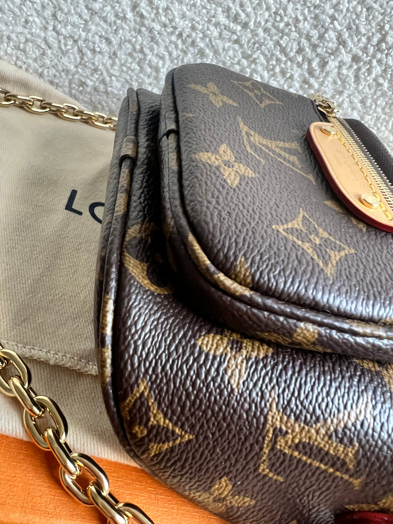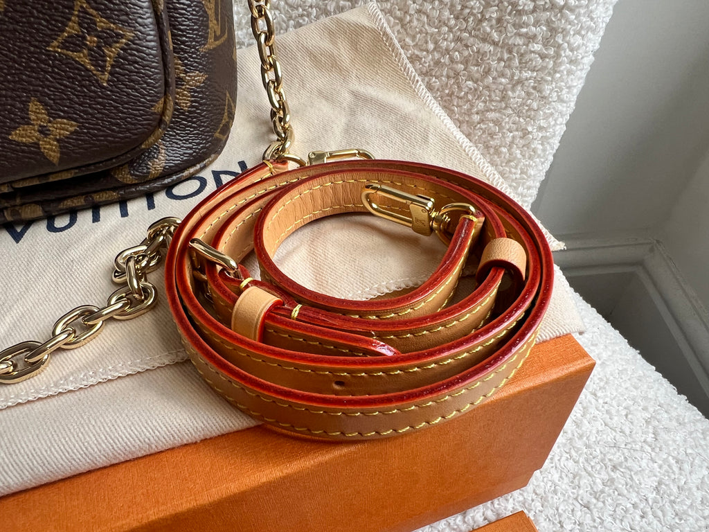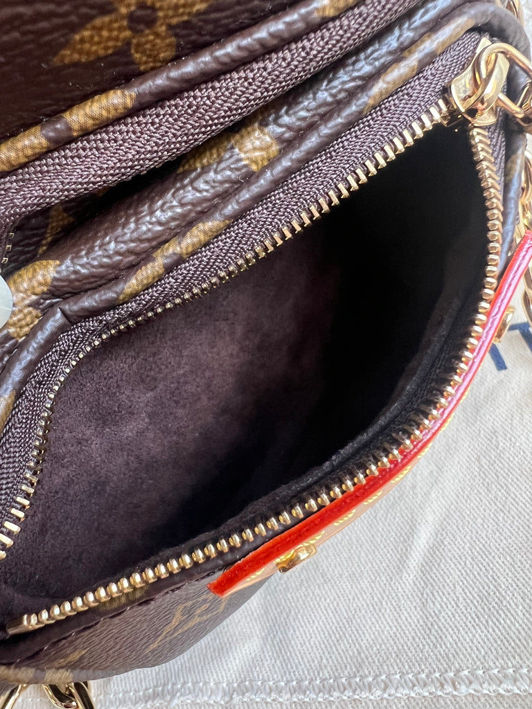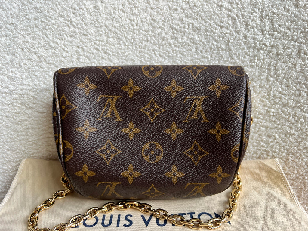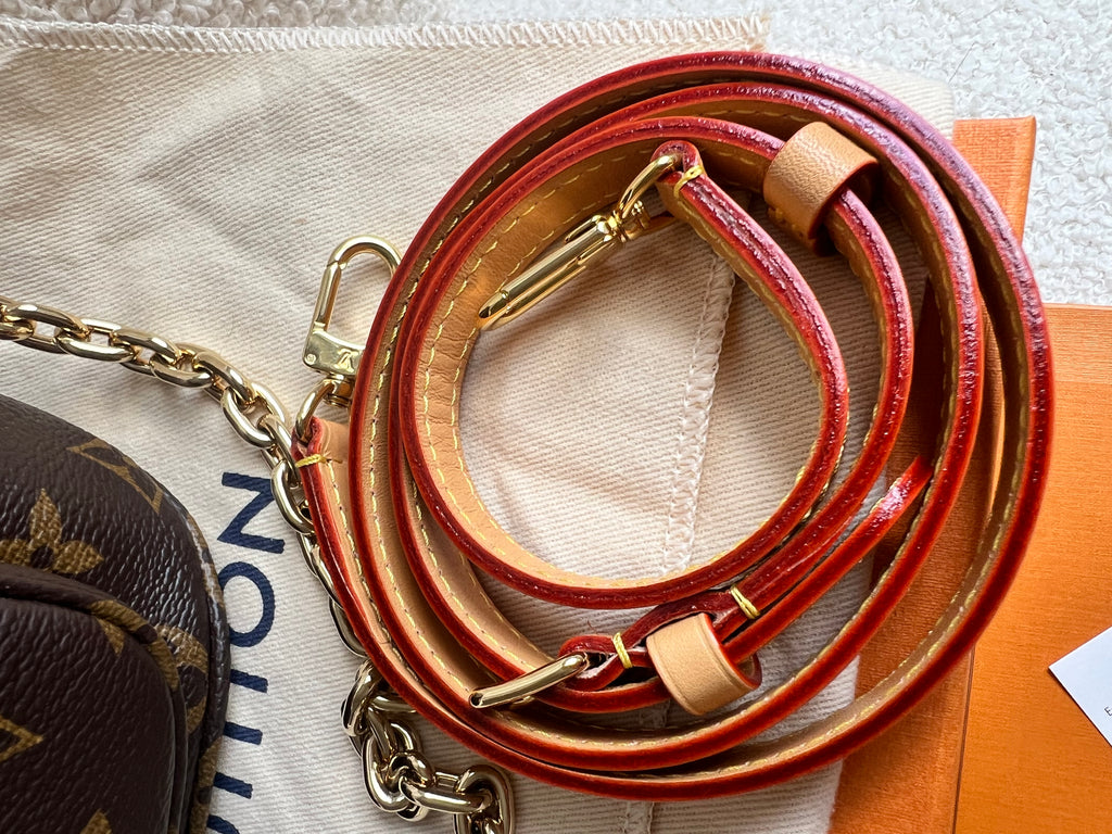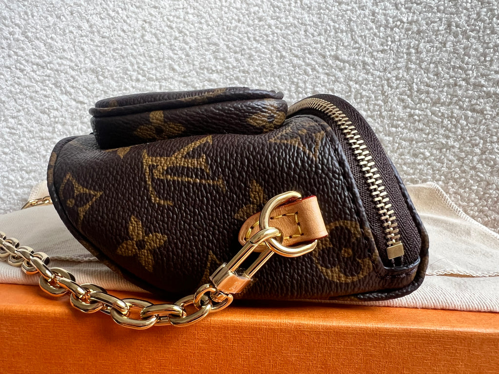 Louis Vuitton Mini Bum Bag in Canvas Monogram with gold hardware. The Mini Bumbag in Monogram canvas is a mini version of the on-trend bumbag format. Designed for versatility, it features a removable, adjustable strap in the emblematic natural leather, as well as a removable gold-colour chain, which can be functional or decorative. The bag has a zipped main compartment and a zipped front pocket with an embossed leather tag. Can be worn using leather strap or chain.