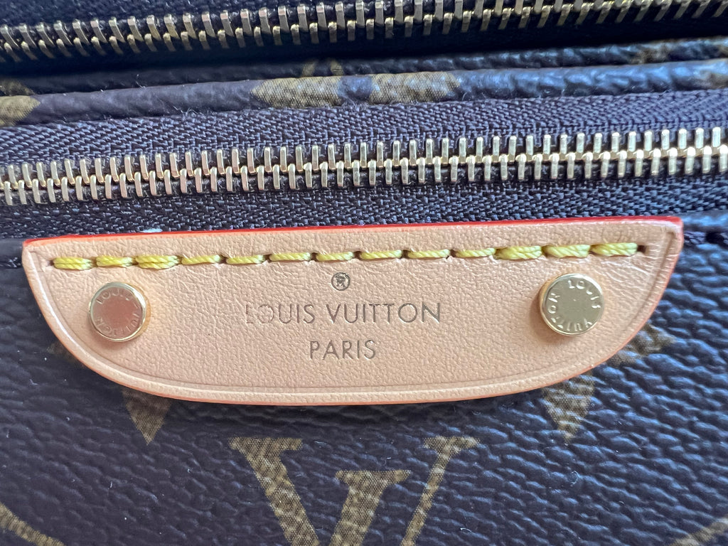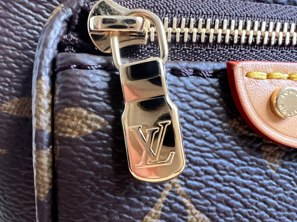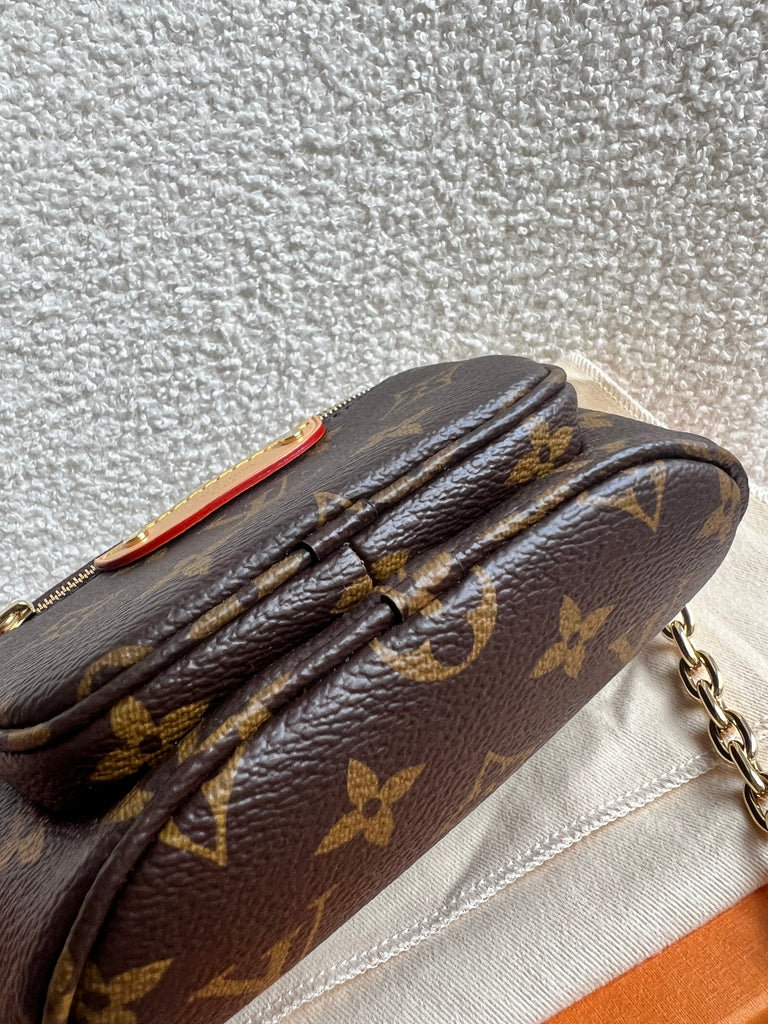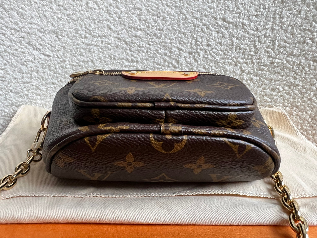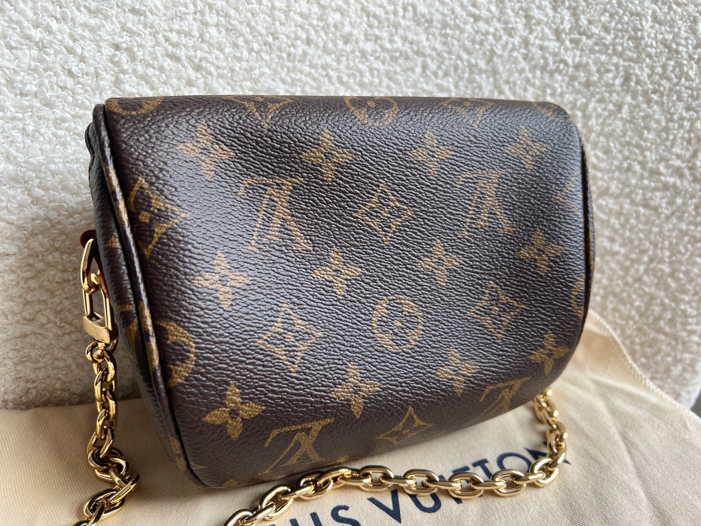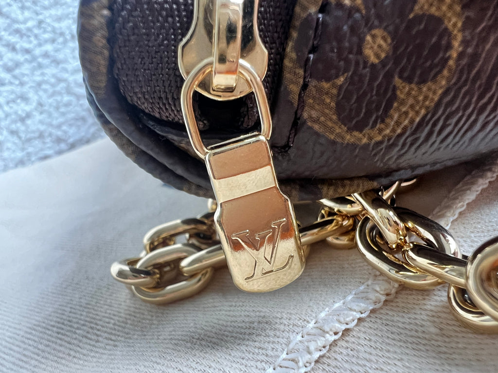 Louis Vuitton Mini Bum Bag in Canvas Monogram with gold hardware. The Mini Bumbag in Monogram canvas is a mini version of the on-trend bumbag format. Designed for versatility, it features a removable, adjustable strap in the emblematic natural leather, as well as a removable gold-colour chain, which can be functional or decorative. The bag has a zipped main compartment and a zipped front pocket with an embossed leather tag. Can be worn using leather strap or chain.