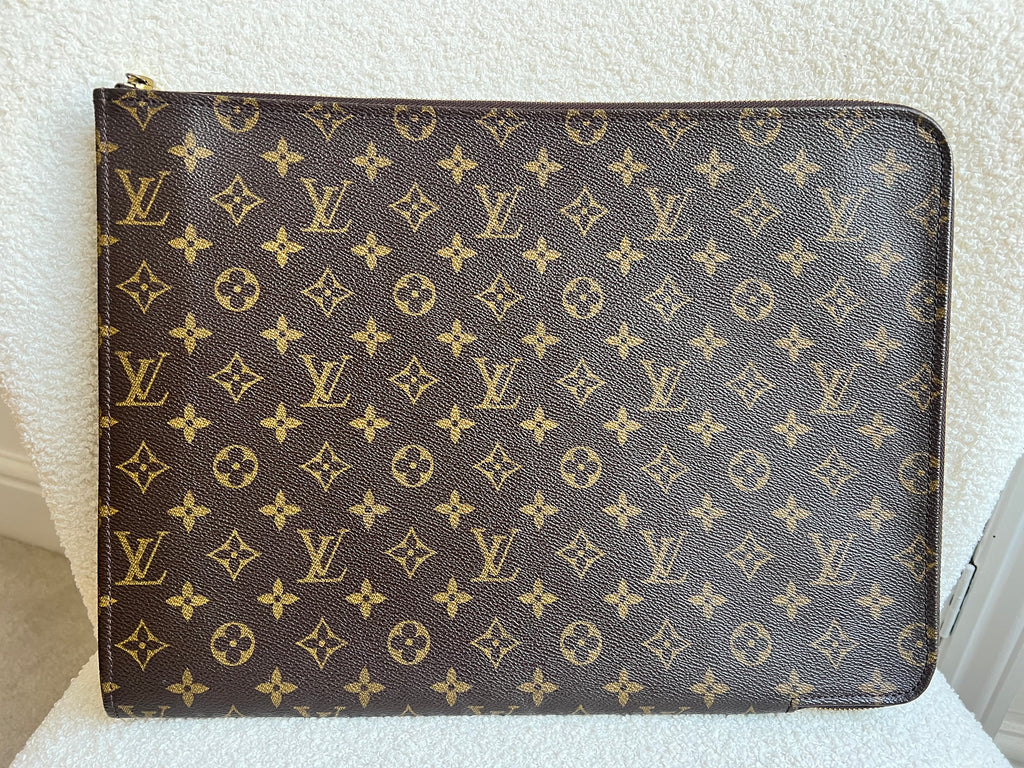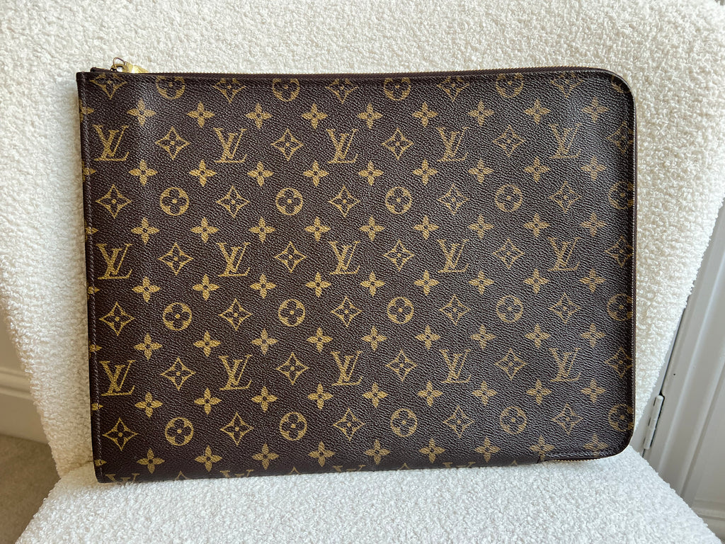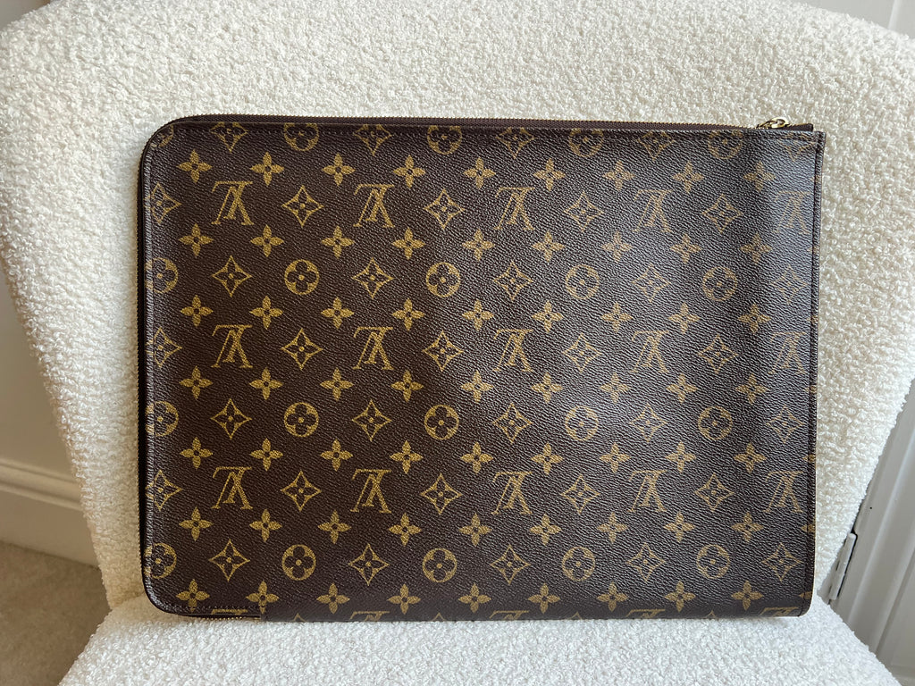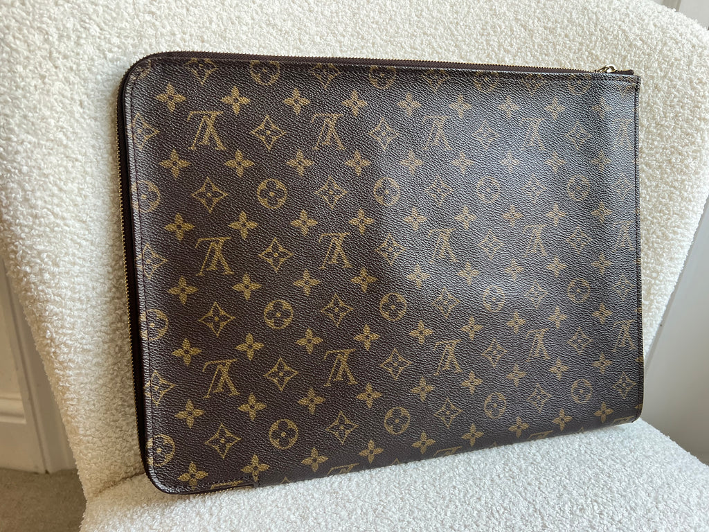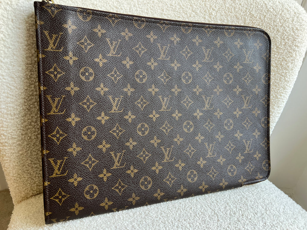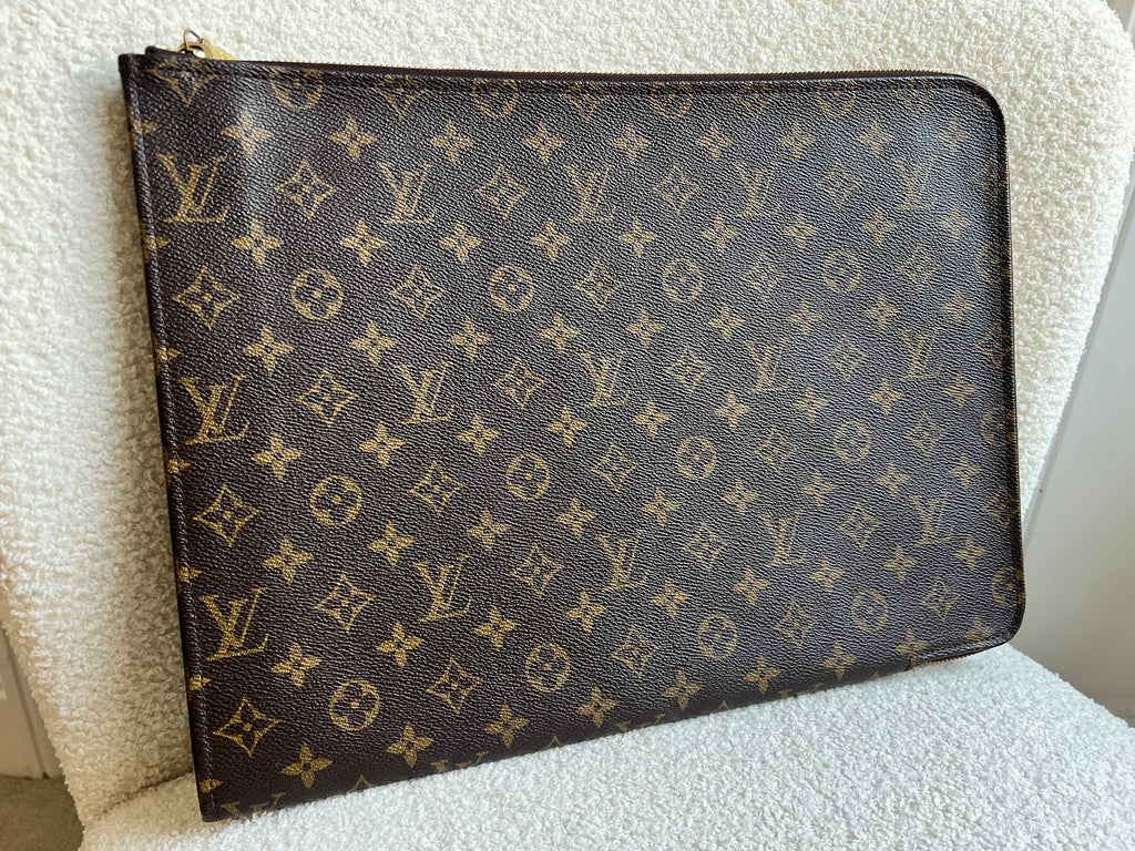 Louis Vuitton Vintage Document Holder in Monogram canvas with gold tone hardware. Ideal for storing documents, files or slim laptop. Can be carried by hand or carried inside a larger bag. Fits a MacBook 13 inch and possibly a larger sized laptop. 1999 year.