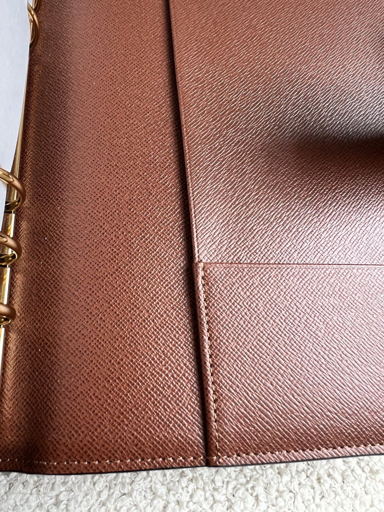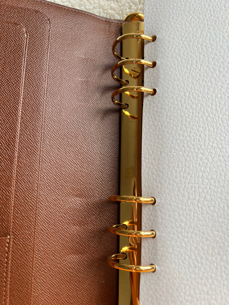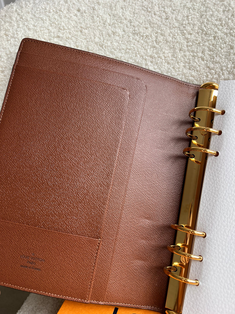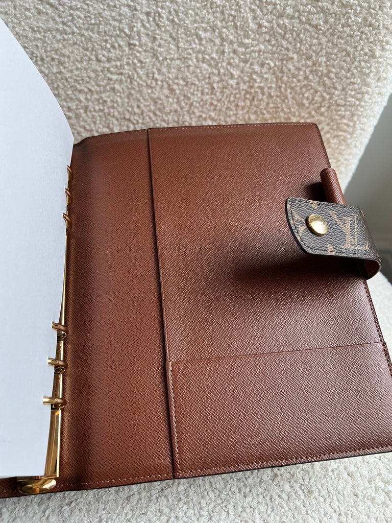 Louis Vuitton Large Ring Agenda in Monogram Canvas with gold hardware. This spacious agenda cover features several compartments, credit card slots and a press stud closure. Inserts are available at LV to buy (address book, agenda or notepad refills). Comes with unbranded inserts.