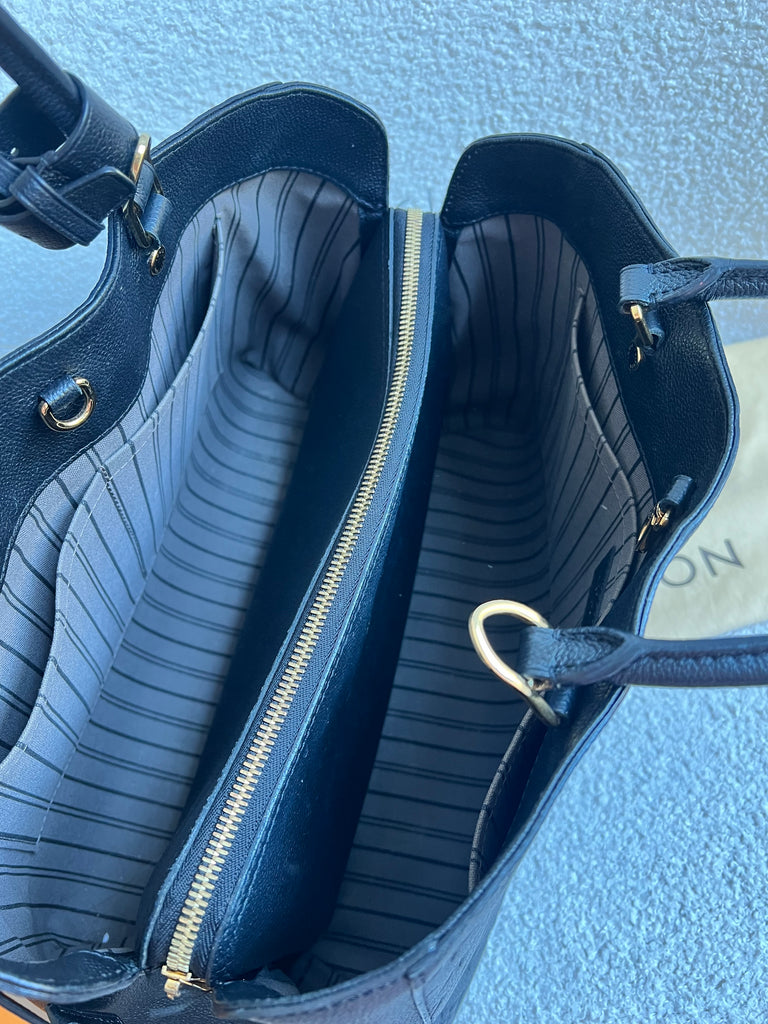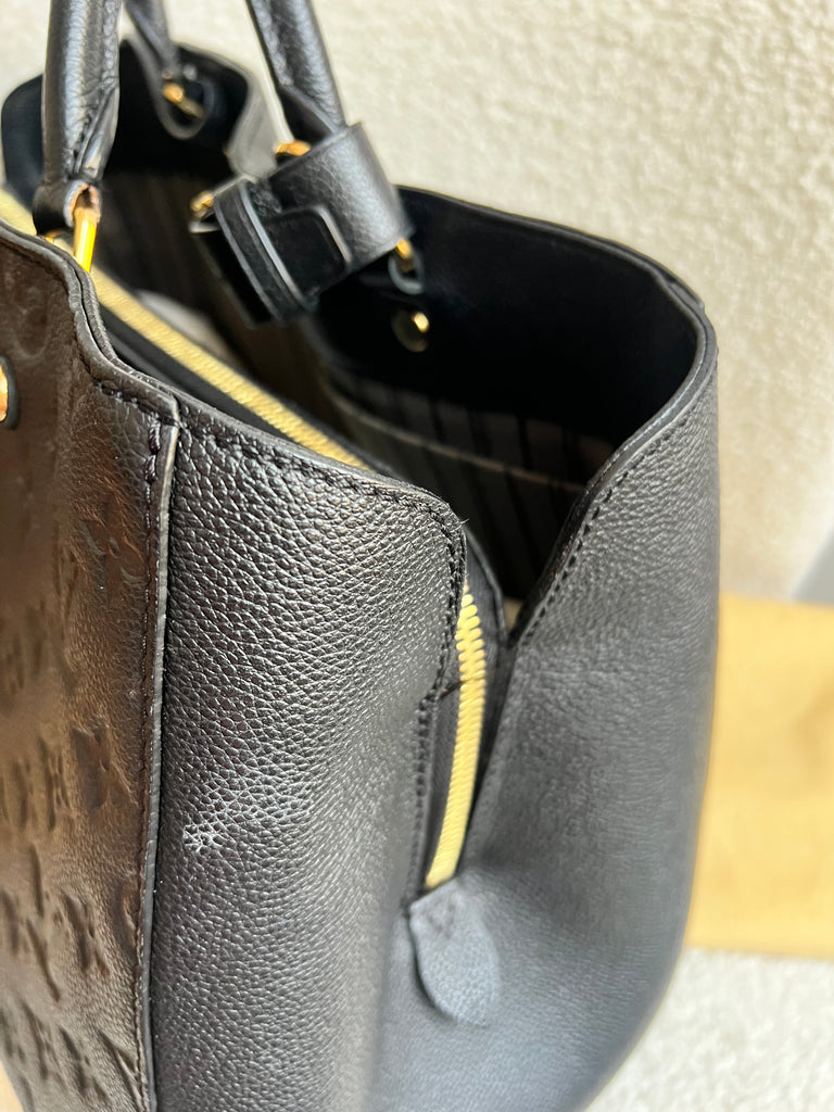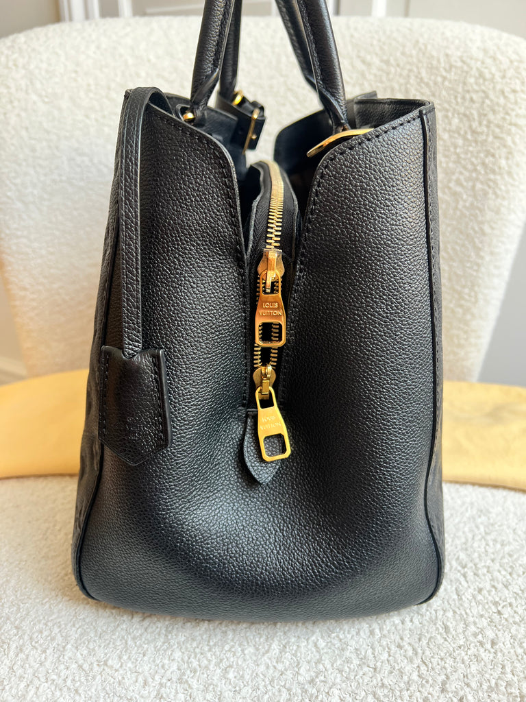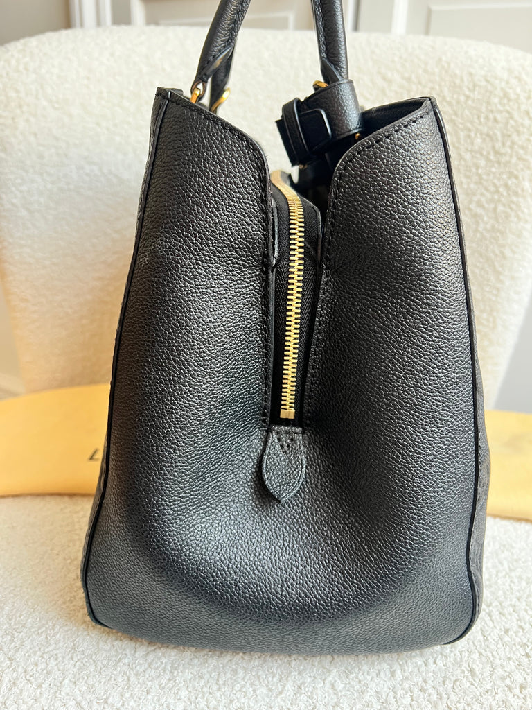 Louis Vuitton Montaigne GM in Black Monogram Empreinte Leather and gold hardware. Named after an elegant avenue in Paris, this style is both chic and practical. Crafted from the supple embossed Empreinte leather, this model is perfect for work or day to day wear - smartly designed fitted with multiple pockets and compartments in the interior. Can be carried in hand or crook of the arm using the two top handles or carried over the shoulder using the shoulder strap.