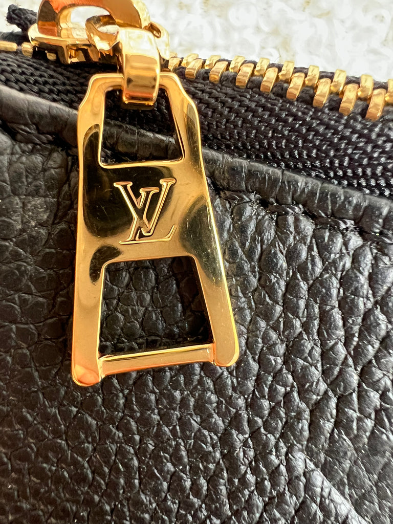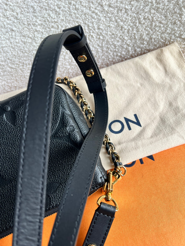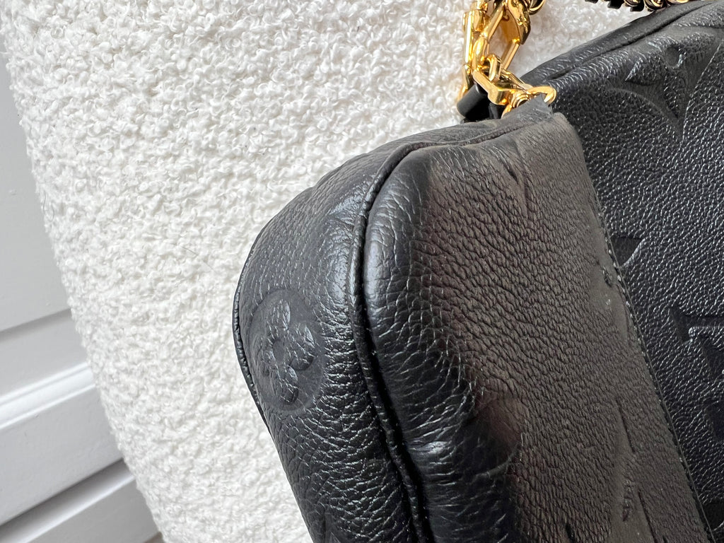 Louis Vuitton Multi Pochette Accessoires in Black Monogram Empreinte leather with gold hardware. The Multi PA in monogram empreinte leather is both stunning and practical. Every part of this two-in-one bag is removable: the two pouches, the gold chain and the leather strap. The oversized Monogram embossed on the front contrasts perfectly with the classic Monogram pattern on the side gussets. This highly sought after style doesn't come up preloved too often.