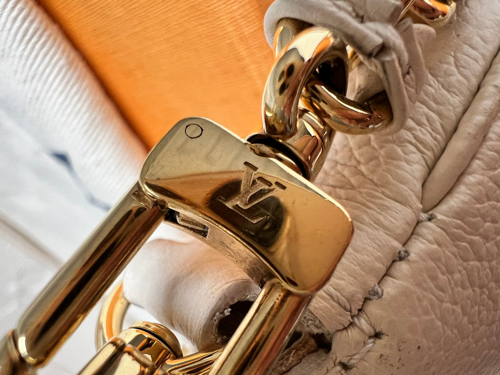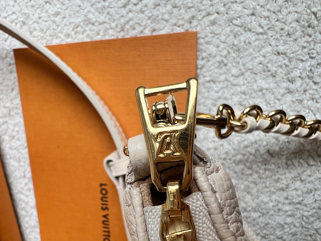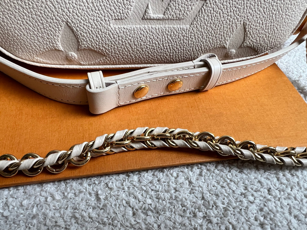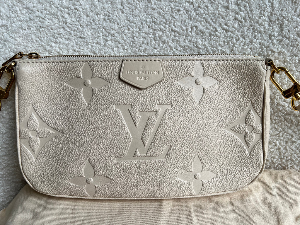 Louis Vuitton Multi Pochette Accessoires in Creme Monogram Empreinte leather with gold hardware. The Multi PA in monogram empreinte leather is both stunning and practical. Every part of this two-in-one bag is removable: the two pouches, the gold chain and the leather strap. The oversized Monogram embossed on the front contrasts perfectly with the classic Monogram pattern on the side gussets. This highly sought after style doesn't come up preloved too often. 2021 year.