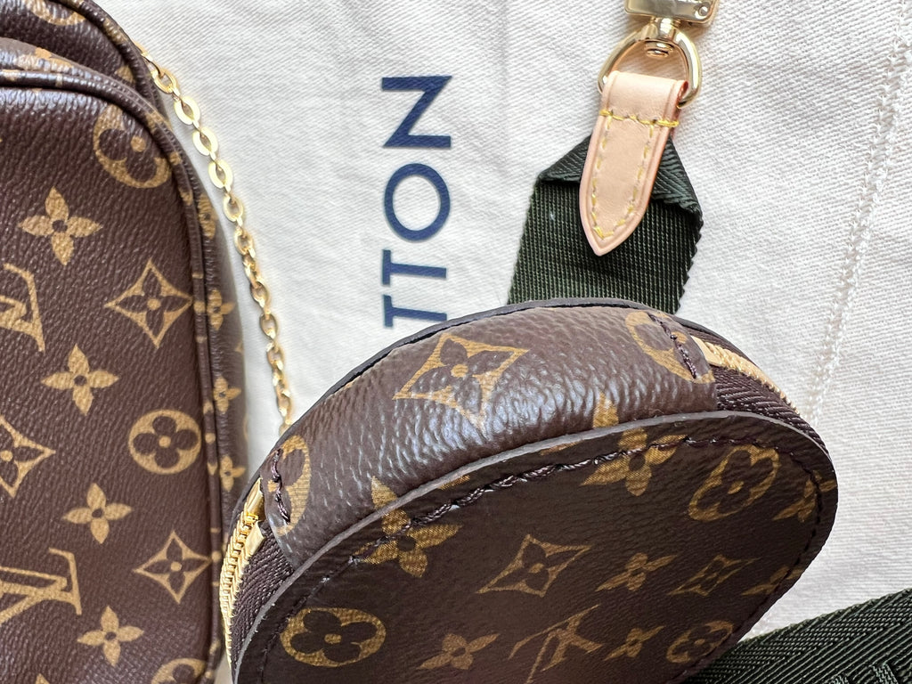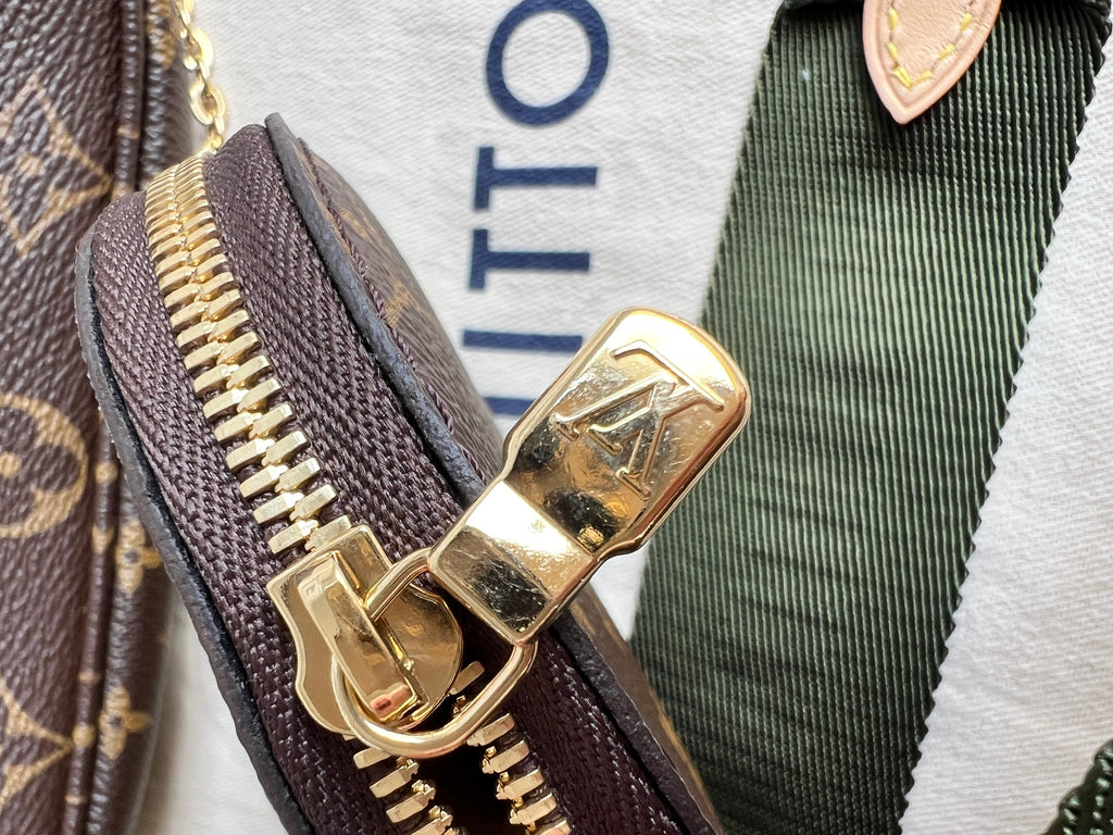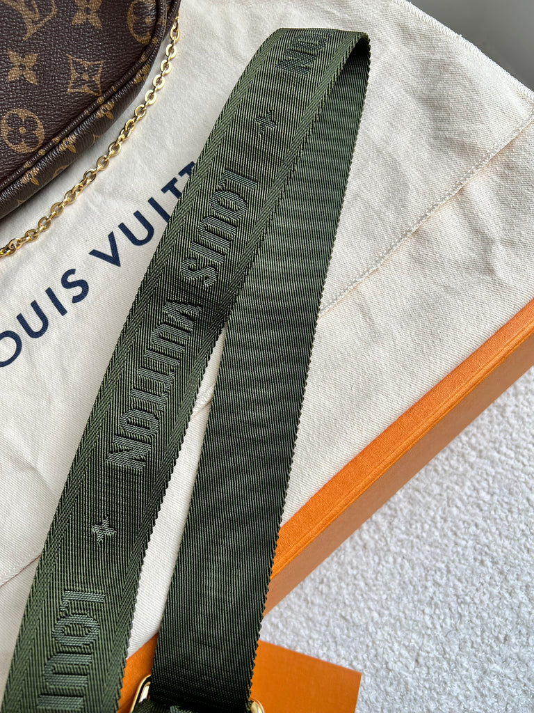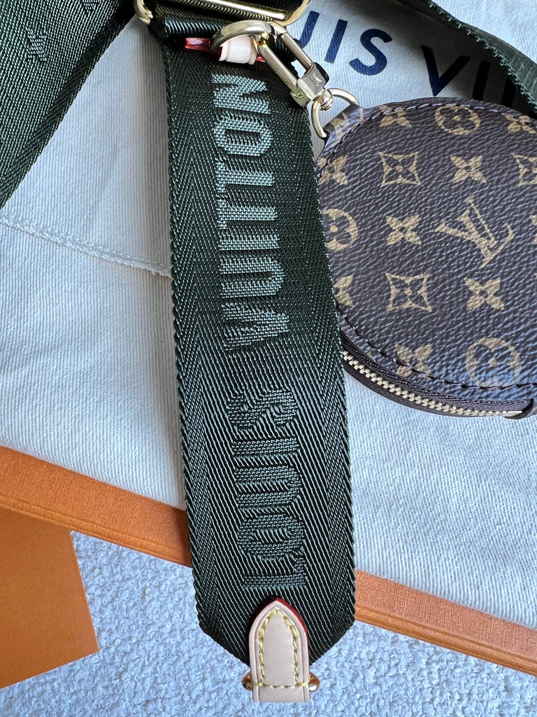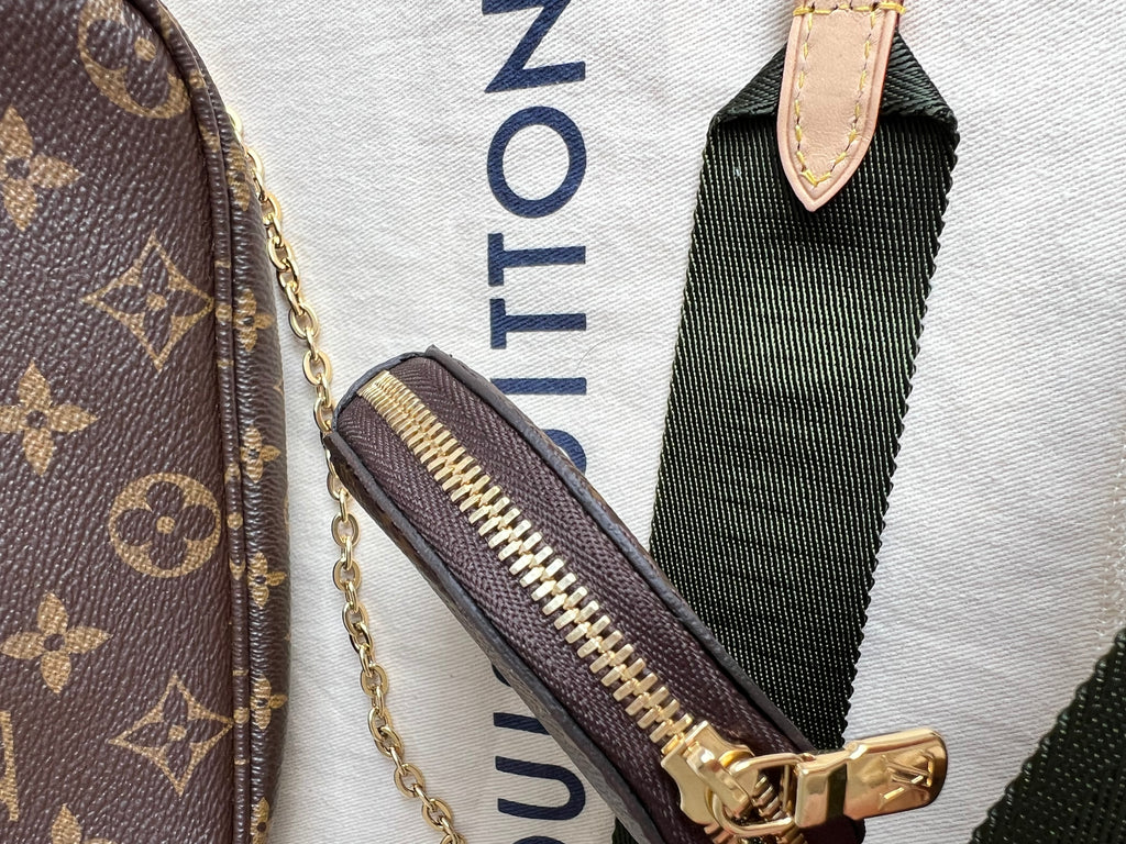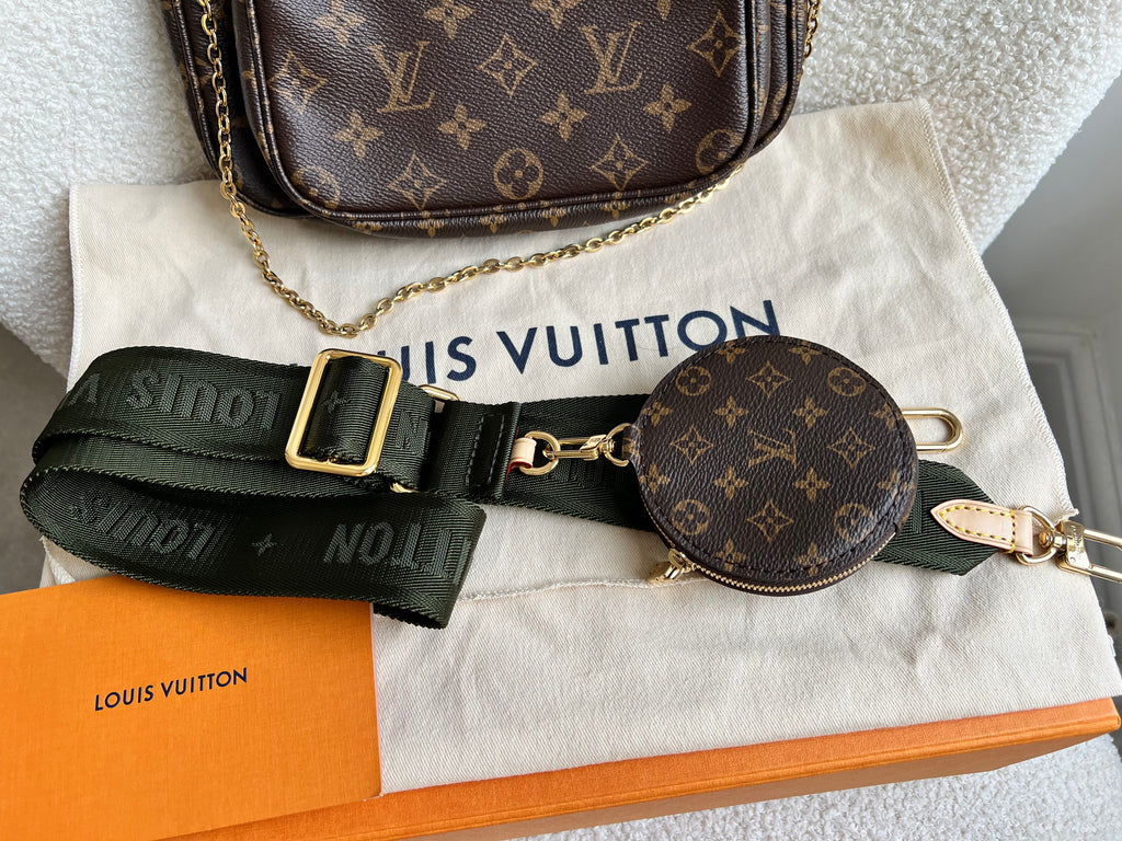 Louis Vuitton Multi Pochette Accessoires in monogram canvas and khaki strap. The Multi PA is a hybrid cross body bags bringing together a pochette accessories, Mini Pochette accessories and a round coin purse. Crafted from monogram canvas, it comes with a removable short gold-tone chain and an adjustable jacquard strap of multiple carrying options. Each component can be used separately or carried together as a cross body bag. This is a highly sought after style.
