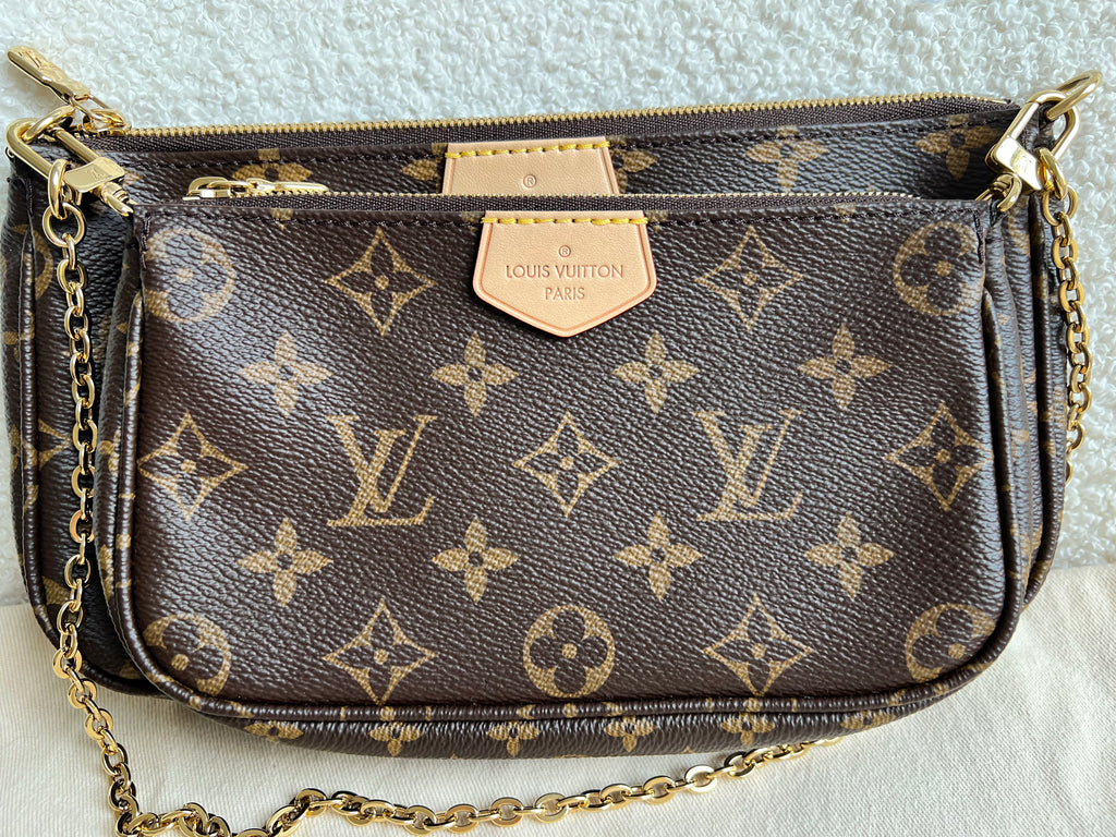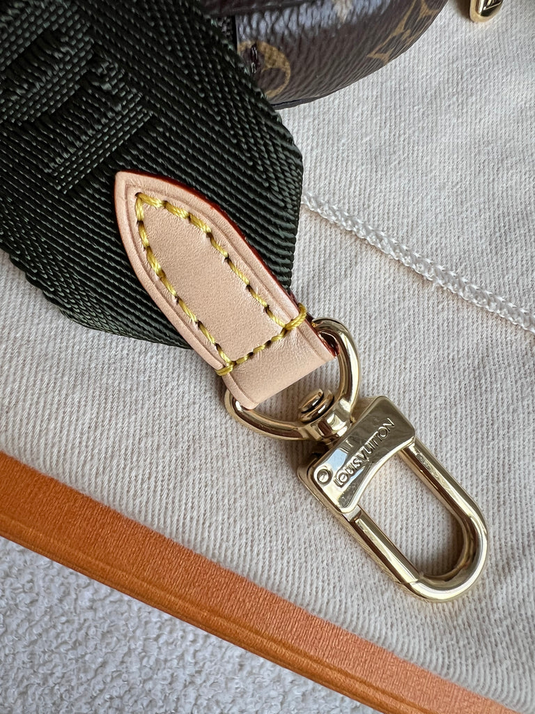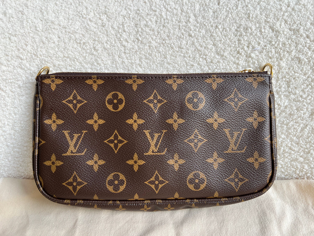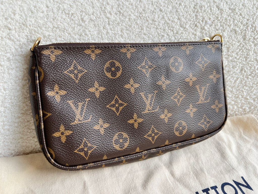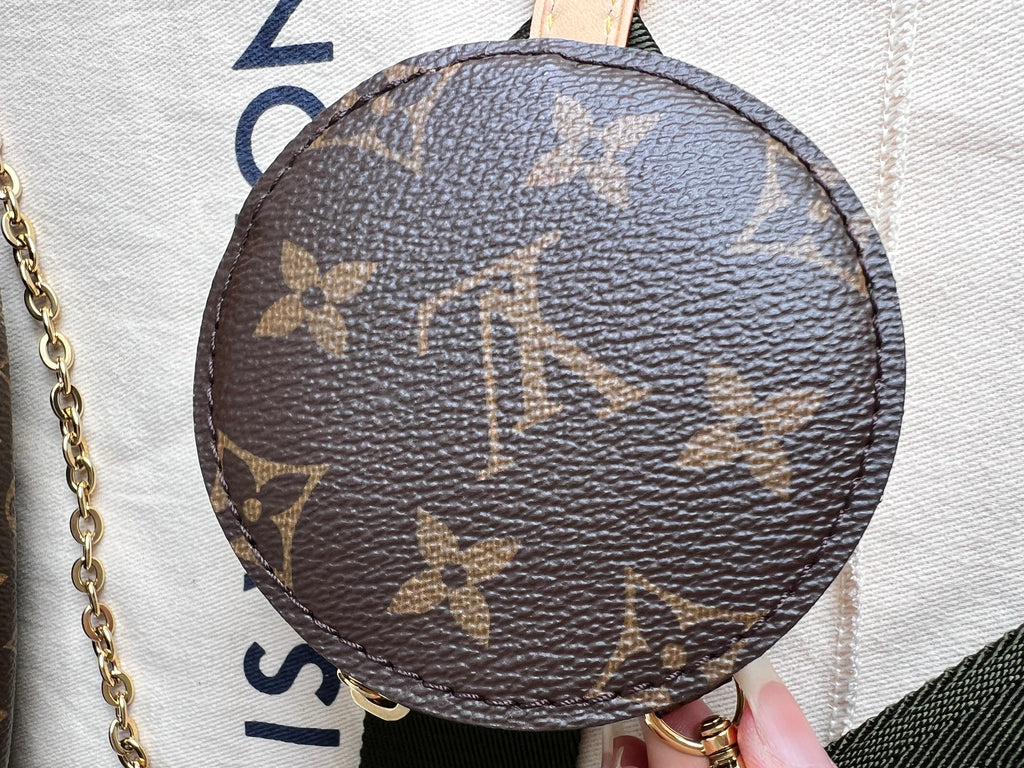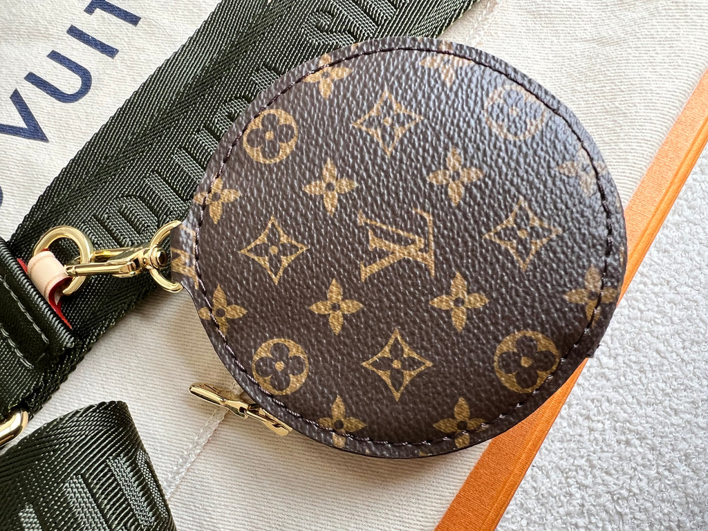 Louis Vuitton Multi Pochette Accessoires in monogram canvas and khaki strap. The Multi PA is a hybrid cross body bags bringing together a pochette accessories, Mini Pochette accessories and a round coin purse. Crafted from monogram canvas, it comes with a removable short gold-tone chain and an adjustable jacquard strap of multiple carrying options. Each component can be used separately or carried together as a cross body bag. This is a highly sought after style.