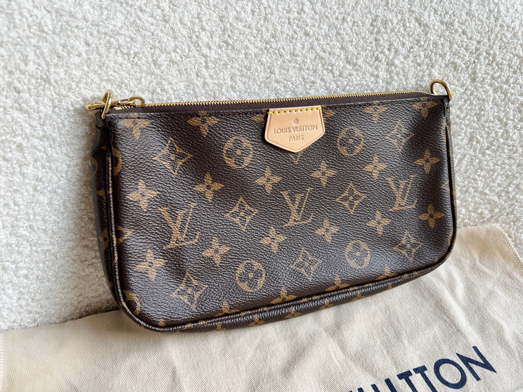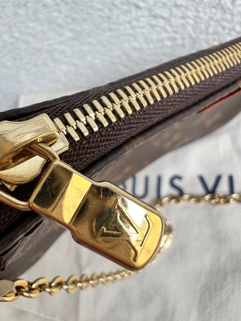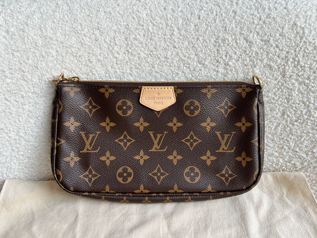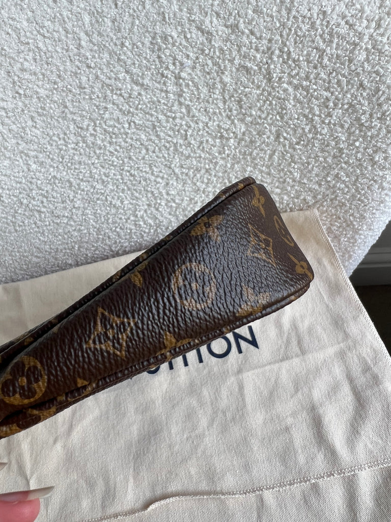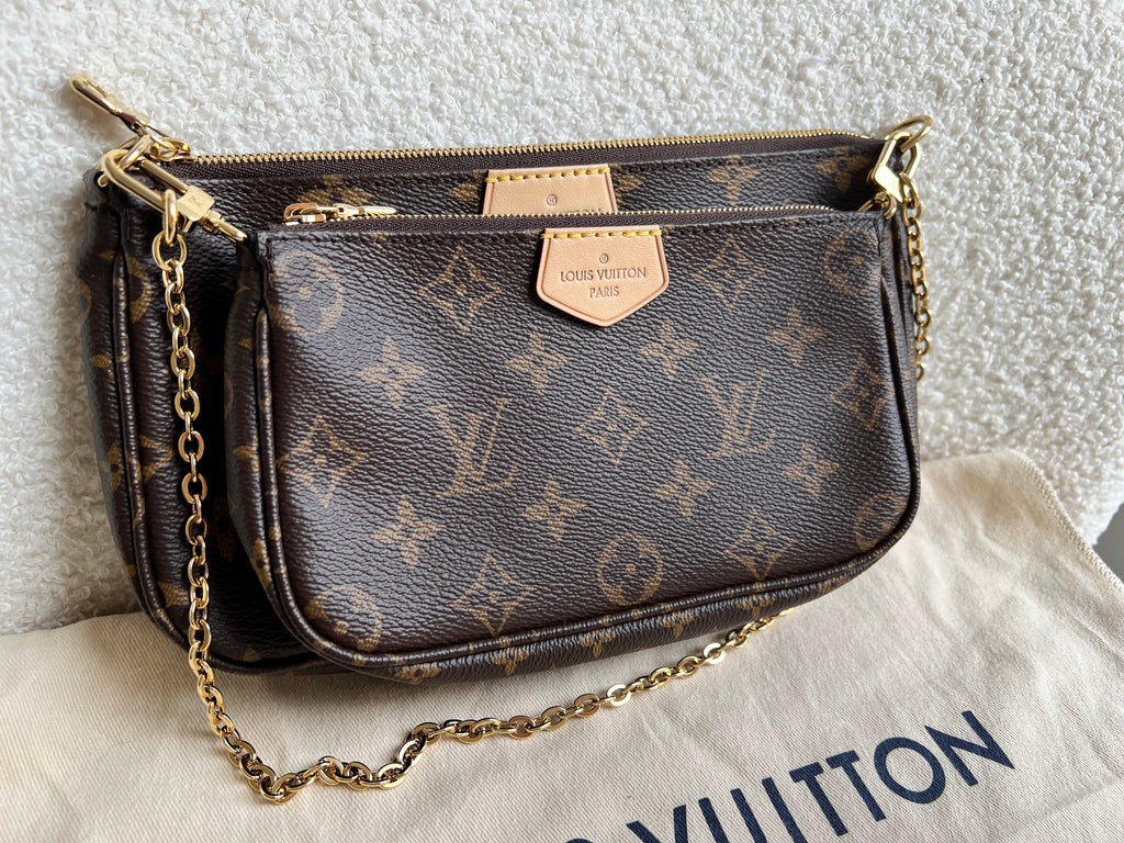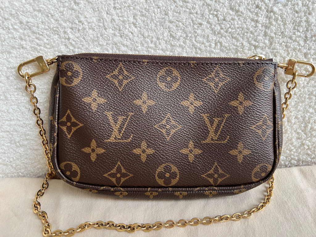 Louis Vuitton Multi Pochette Accessoires in monogram canvas and khaki strap. The Multi PA is a hybrid cross body bags bringing together a pochette accessories, Mini Pochette accessories and a round coin purse. Crafted from monogram canvas, it comes with a removable short gold-tone chain and an adjustable jacquard strap of multiple carrying options. Each component can be used separately or carried together as a cross body bag. This is a highly sought after style.