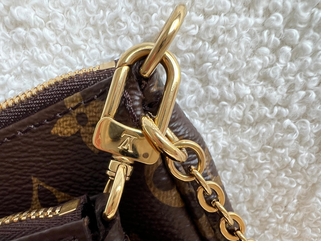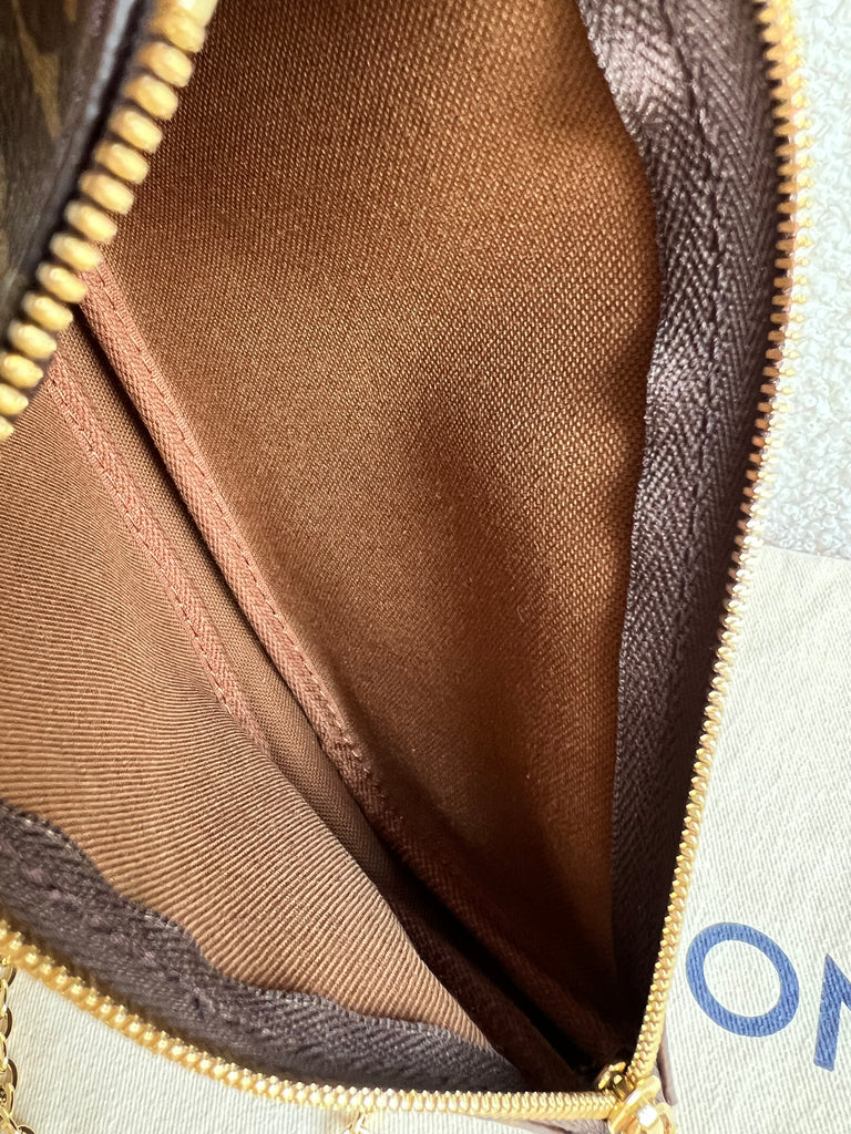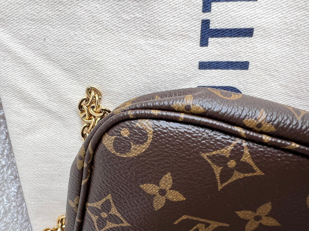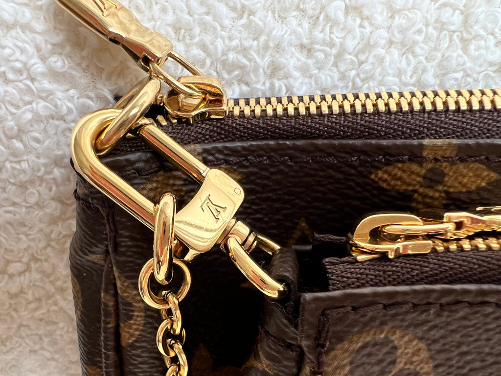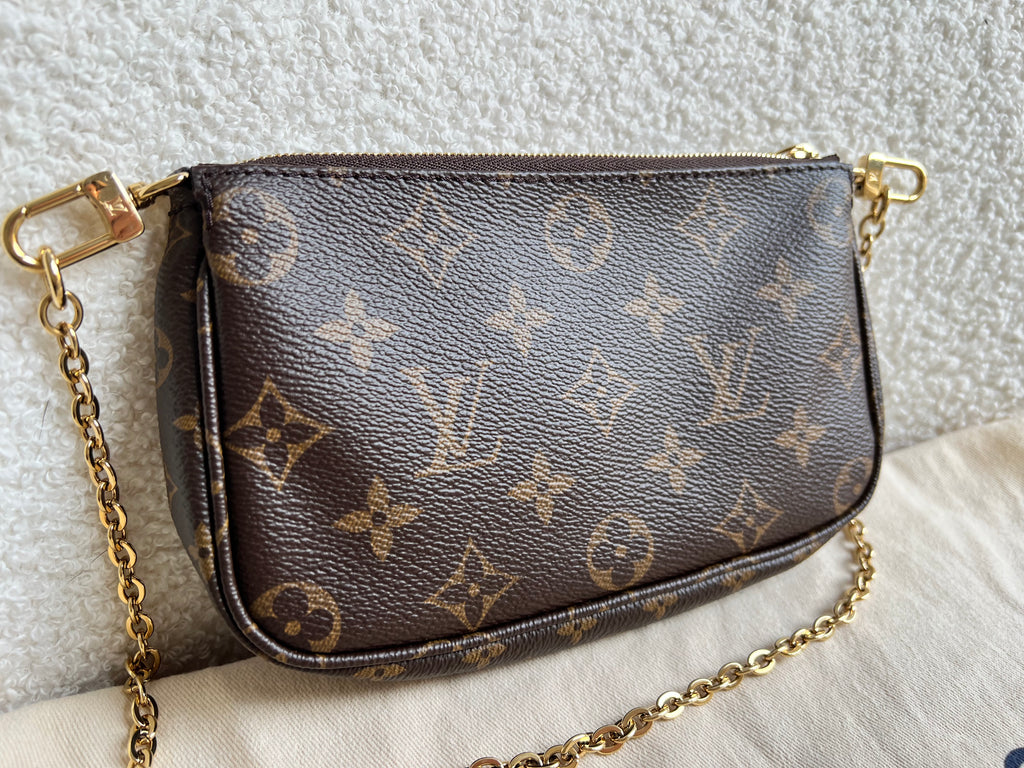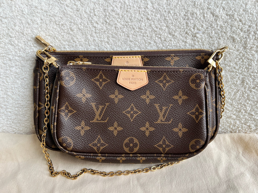 Louis Vuitton Multi Pochette Accessoires in monogram canvas and khaki strap. The Multi PA is a hybrid cross body bags bringing together a pochette accessories, Mini Pochette accessories and a round coin purse. Crafted from monogram canvas, it comes with a removable short gold-tone chain and an adjustable jacquard strap of multiple carrying options. Each component can be used separately or carried together as a cross body bag. This is a highly sought after style.