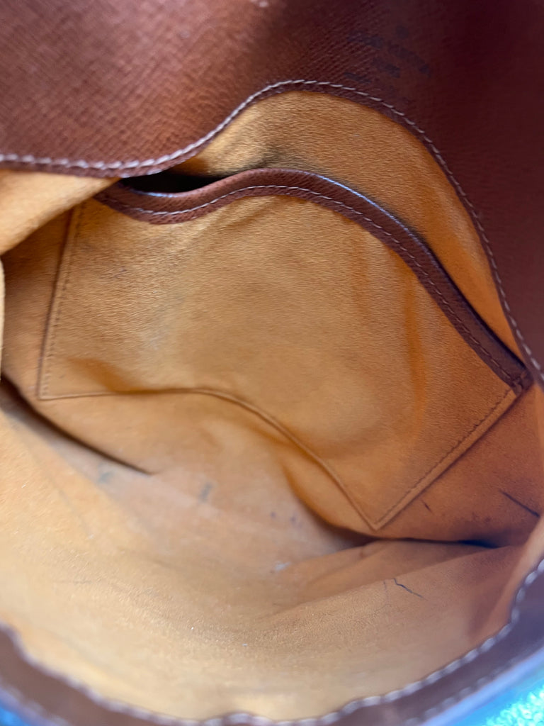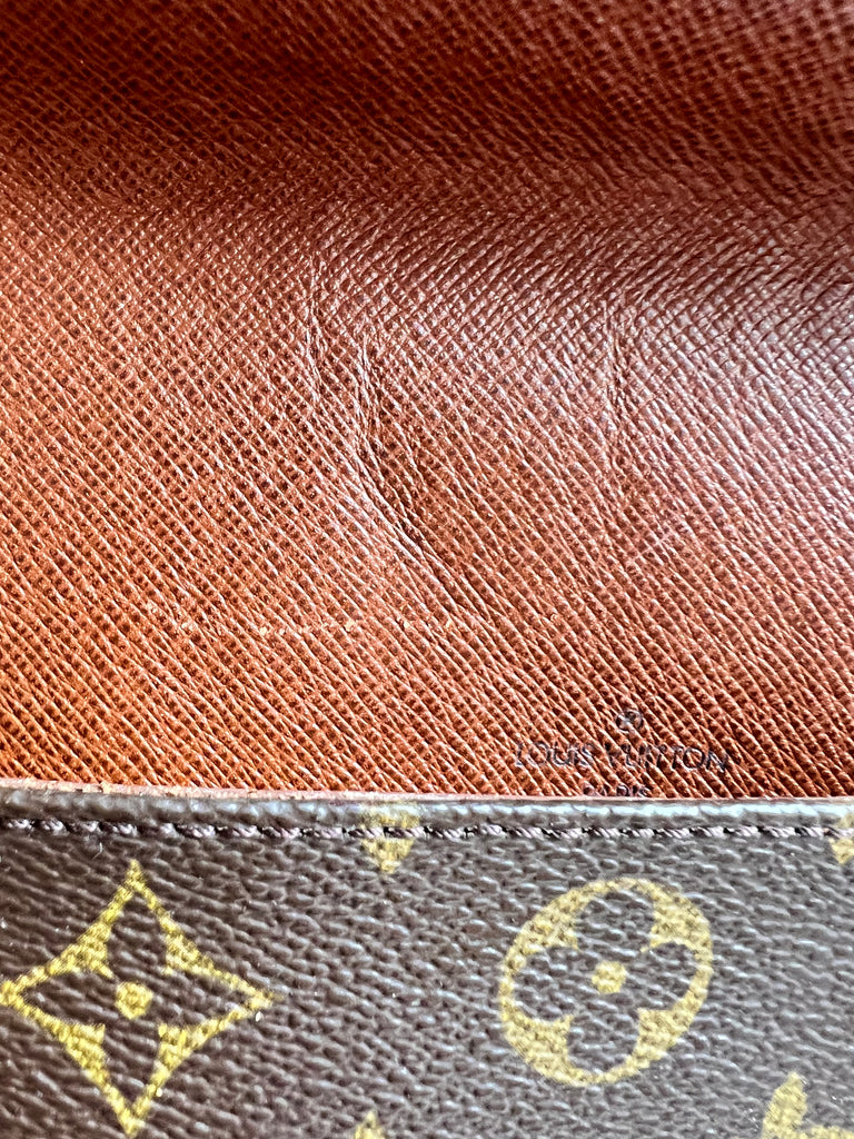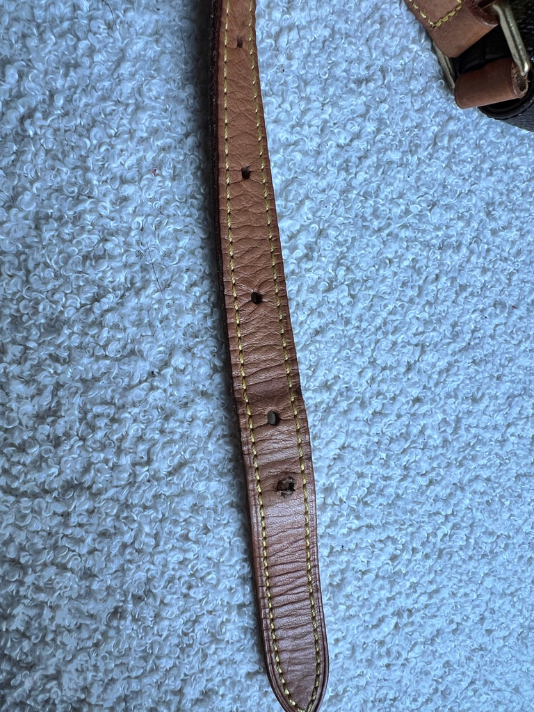 Exterior: Overall good condition with some general signs of wear. There are small signs of wear including some general wear to the strap and some darkening / rubbing to the corners. Small marks to the canvas. Extra hole has been punched in the strap.