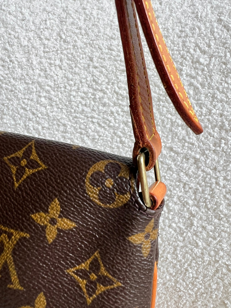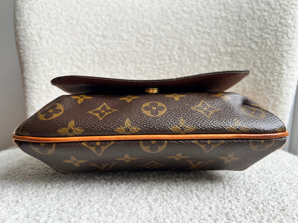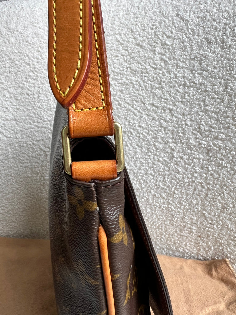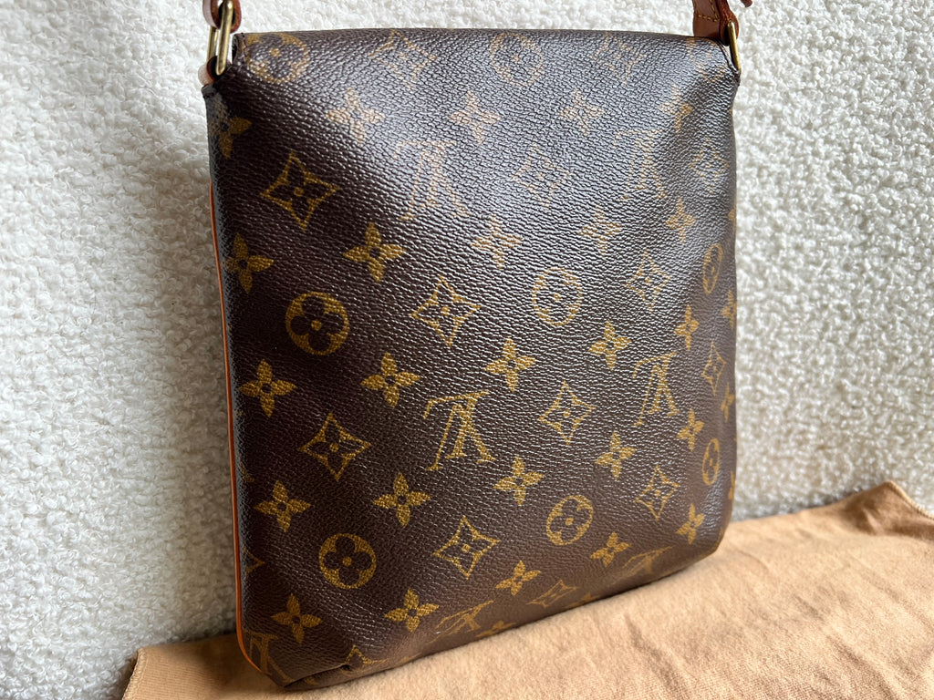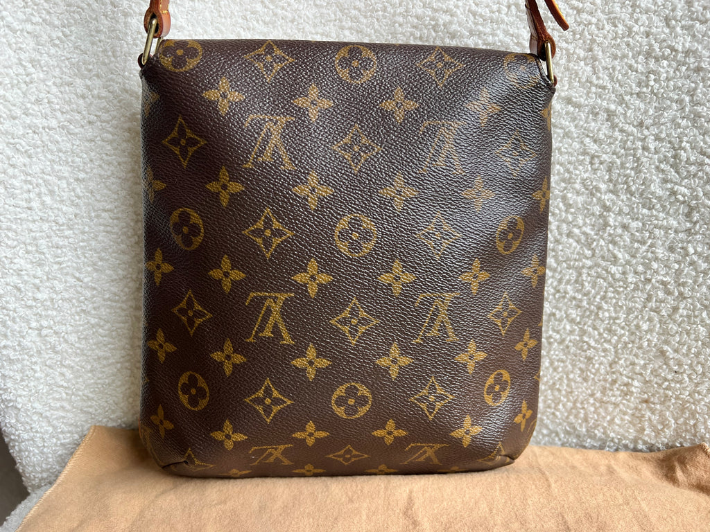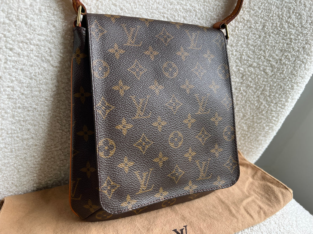 Louis Vuitton Musette Salsa PM in monogram canvas. This is the version with the shorter strap (ie it does not go cross body). In the iconic monogram canvas, this slimline shoulder bag is ideal for those who prefer smaller, lightweight bags. Now discontinued, a great example of vintage quality LV. Fold over flap closure. Perfect "starter" designer bag with a lower price tag than some of Louis Vuitton's other models.