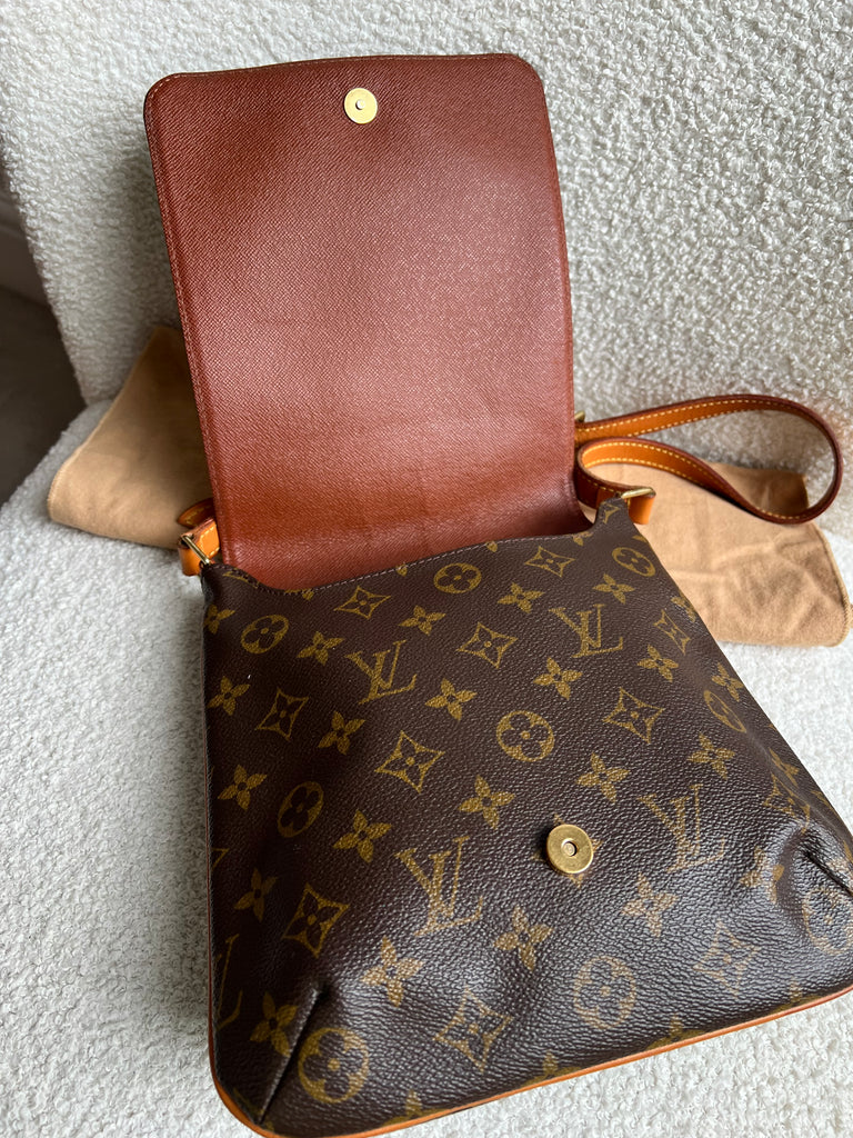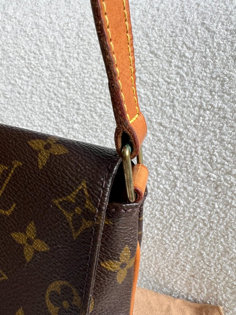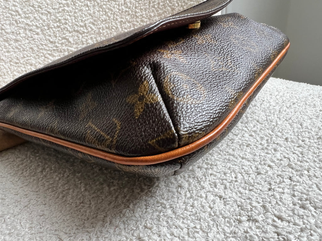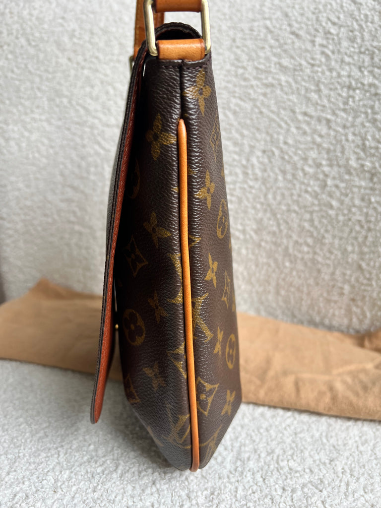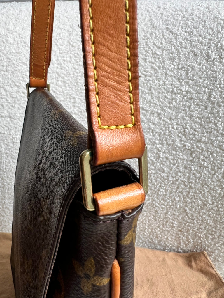 Louis Vuitton Musette Salsa PM in monogram canvas. This is the version with the shorter strap (ie it does not go cross body). In the iconic monogram canvas, this slimline shoulder bag is ideal for those who prefer smaller, lightweight bags. Now discontinued, a great example of vintage quality LV. Fold over flap closure. Perfect "starter" designer bag with a lower price tag than some of Louis Vuitton's other models.