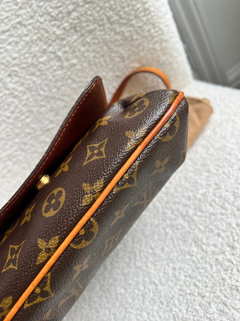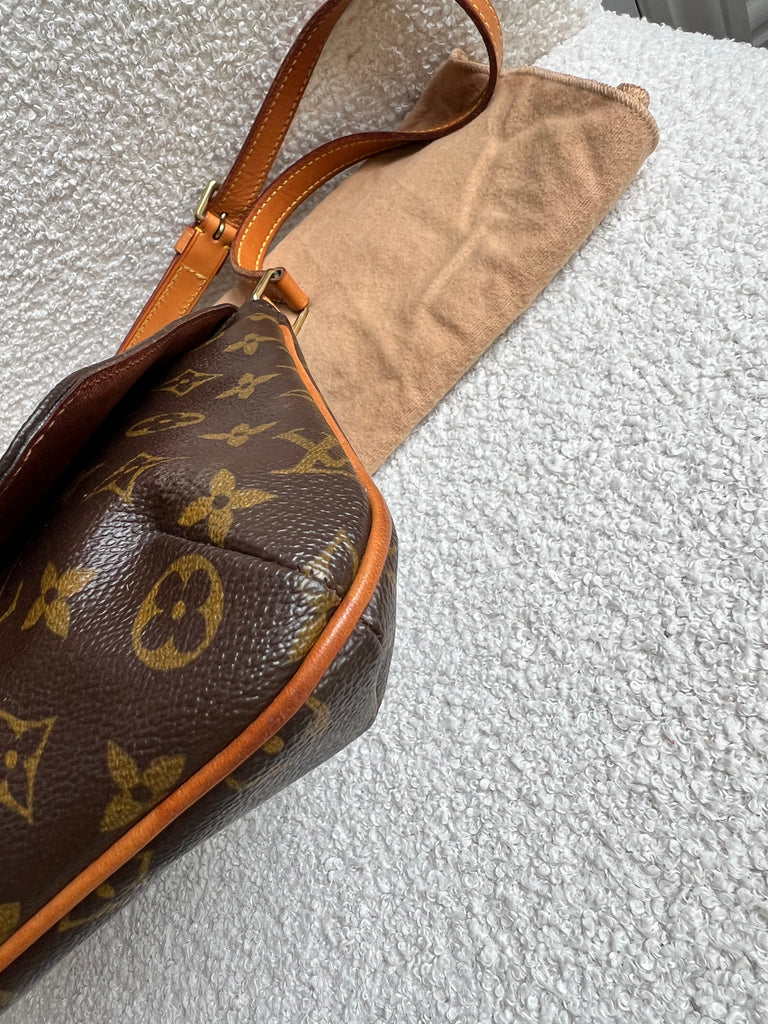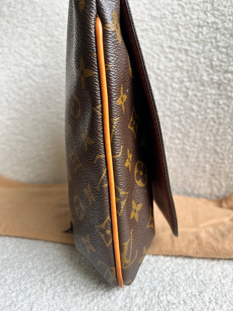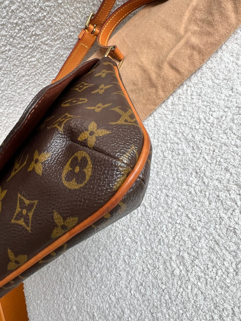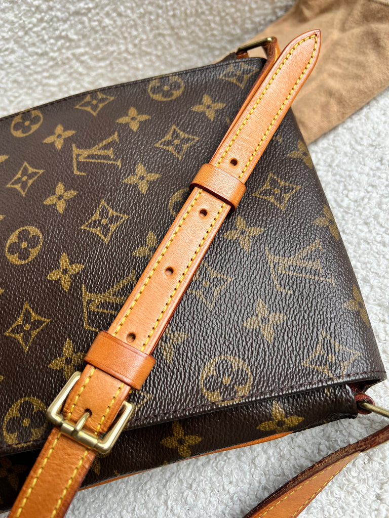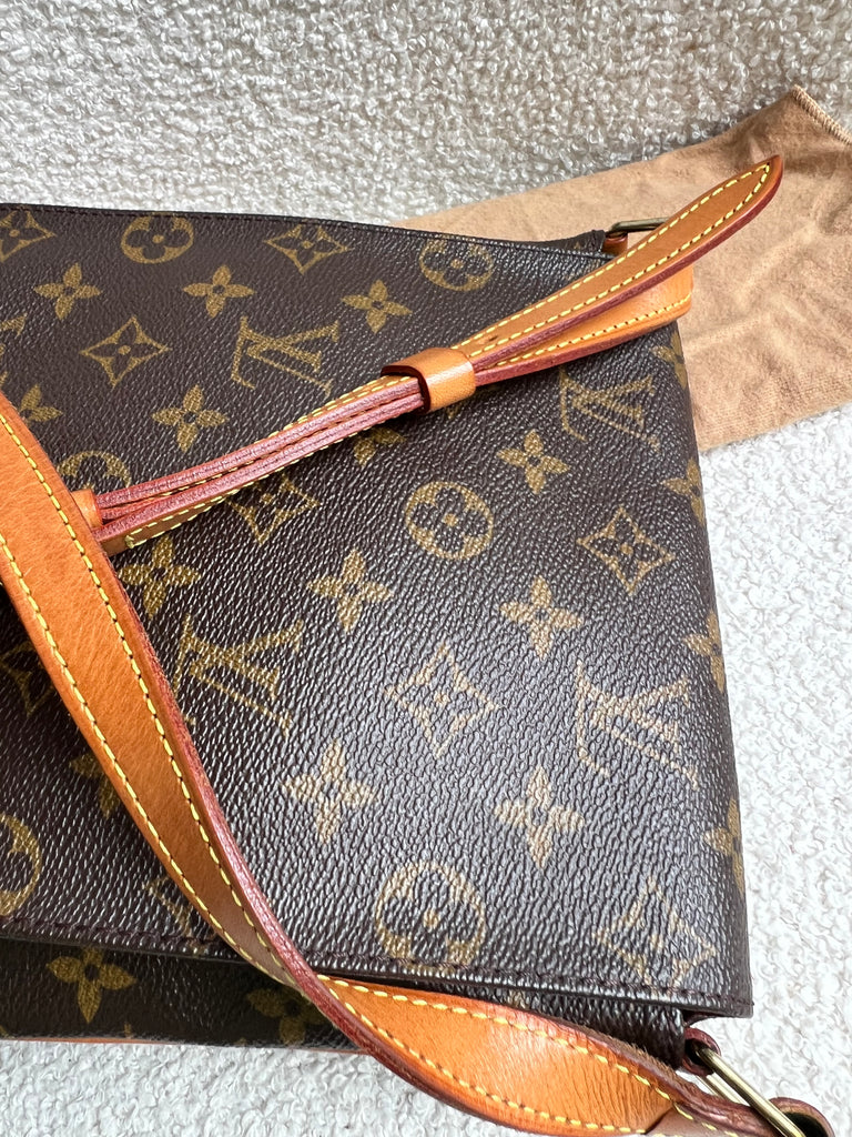 Louis Vuitton Musette Salsa PM in monogram canvas. This is the version with the shorter strap (ie it does not go cross body). In the iconic monogram canvas, this slimline shoulder bag is ideal for those who prefer smaller, lightweight bags. Now discontinued, a great example of vintage quality LV. Fold over flap closure. Perfect "starter" designer bag with a lower price tag than some of Louis Vuitton's other models.