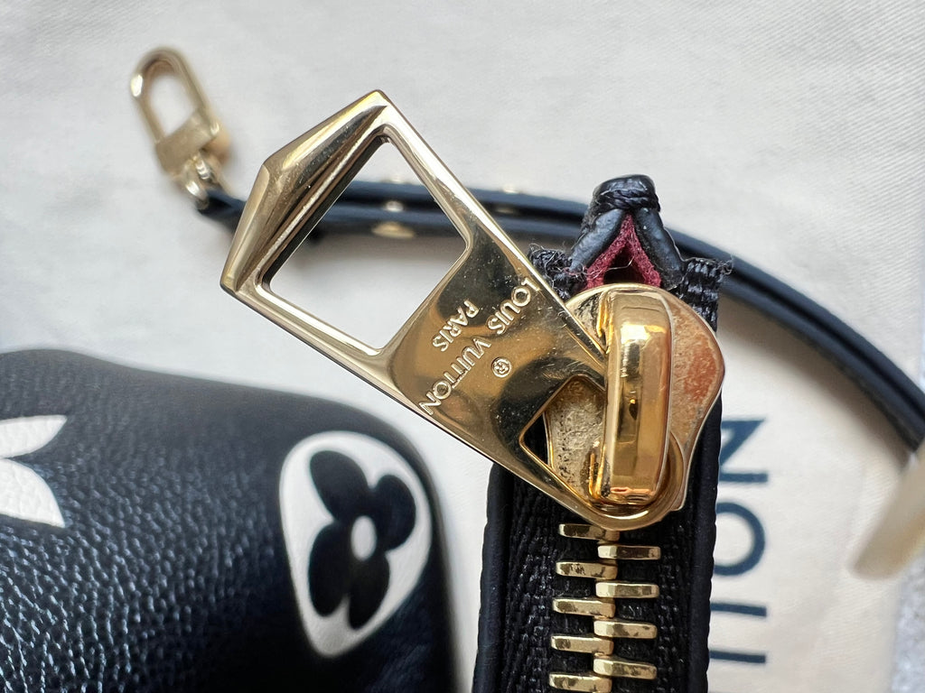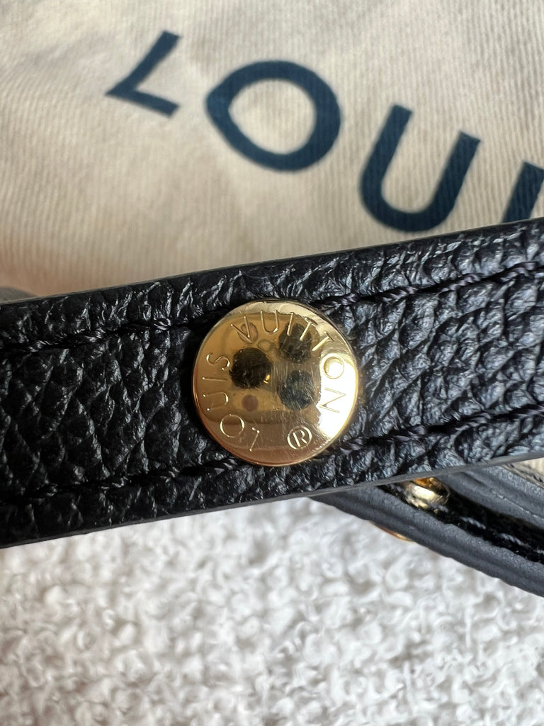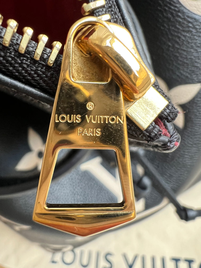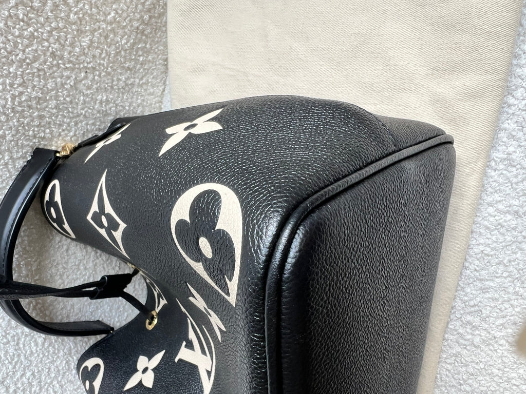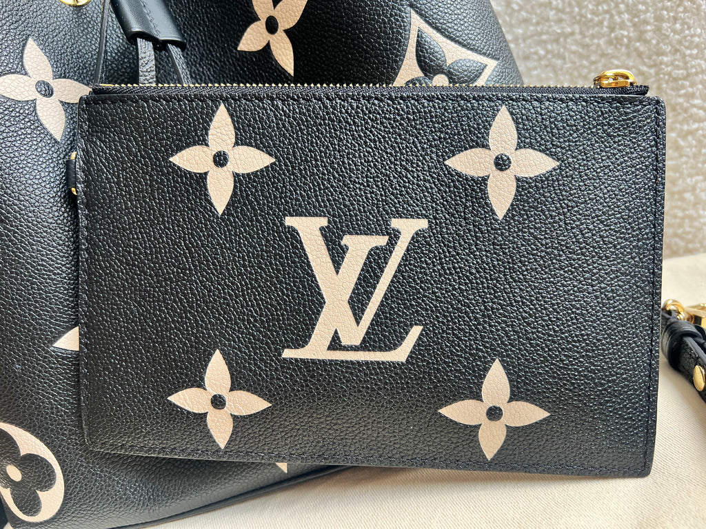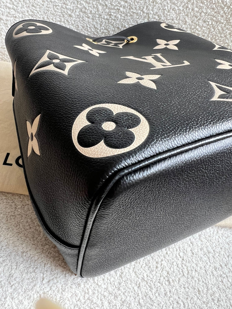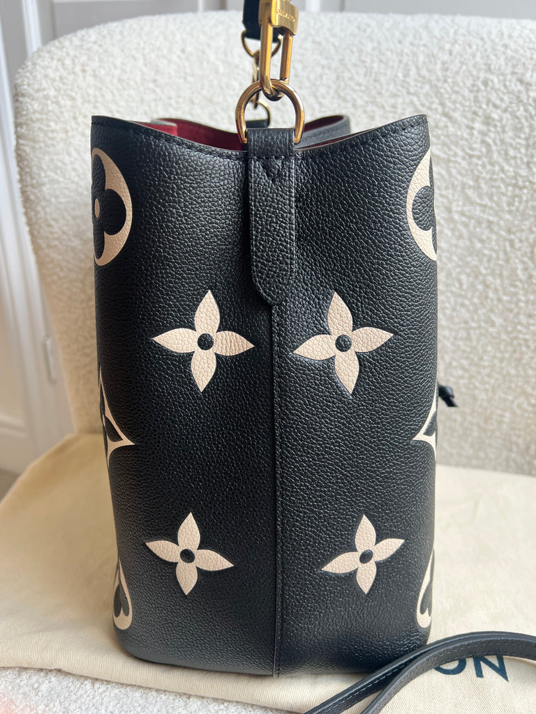 Louis Vuitton Neonoe Bucket Bag in Black and Beige Bicolour Empreinte Leather and gold hardware. The bold LV Initials and Monogram Flowers bring a fashionable feel to this NéoNoé MM bucket bag. The motif is first printed on the leather, then embossed to enhance the hypnotic effect. This versatile bag can be worn cross-body or over the shoulder thanks to its adjustable strap. Inside, a zipped removable pouch keeps valuables secure. Can be carried in hand or over shoulder using the detachable, adjustable strap. Can also be worn cross body. Microchip item.
