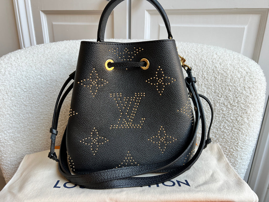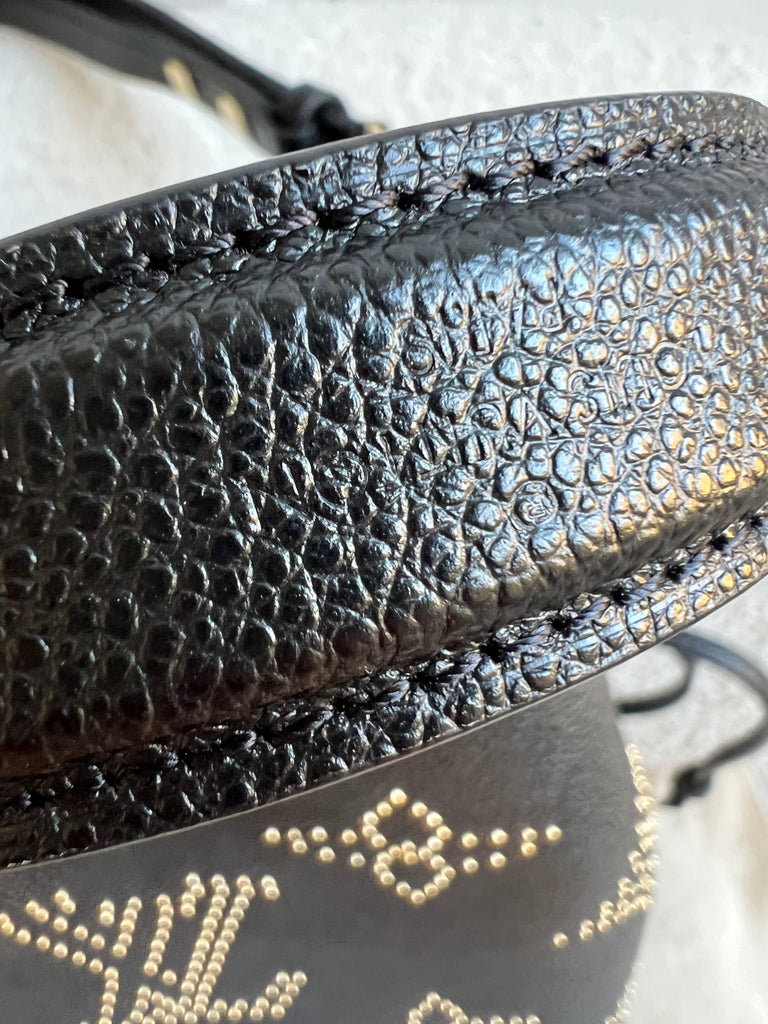 Louis Vuitton Neonoe BB in Black Empreinte Leather stud detailing and gold hardware. The grainy embossed Empreinte calfskin leather is complemented by the LV logo composed of gold coated studs in this NéoNoé BB bag. Based on the iconic Louis Vuitton Noé bag, this limited edition version comes in a BB size. Thanks to the adjustable shoulder strap and removable top handle, this style can be carried in hand or over the shoulder / cross body.
