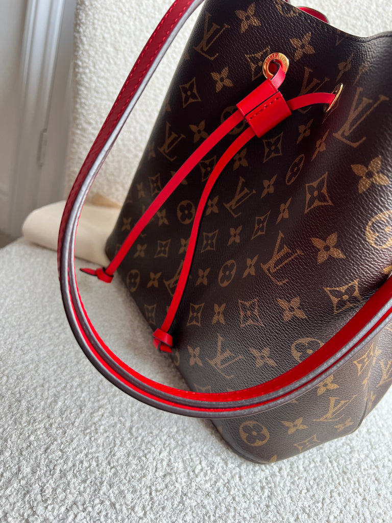 Louis Vuitton Neo Noe Bucket Bag in Monogram canvas with red trim and gold hardware. This modern bucket bag style with colourful leather trim features a sleek shape and an adjustable leather strap. Highly sought after, this style is almost always sold out at Louis Vuitton. Perfect size for day to day use, the Neo Noe is practical with its drawstring closure and allows for easy access to belongings inside. Featuring to main compartments separated by a zipped section. The strap can be worn doubled up or lengthened - over the shoulder or cross body.