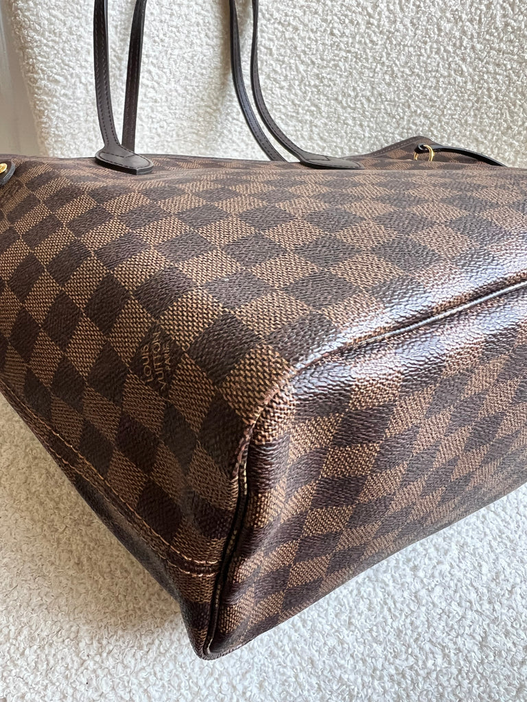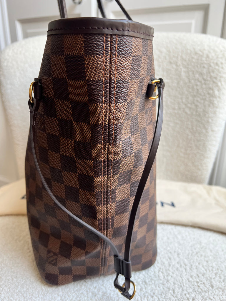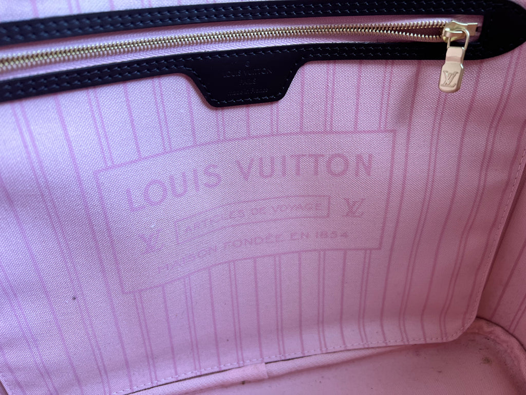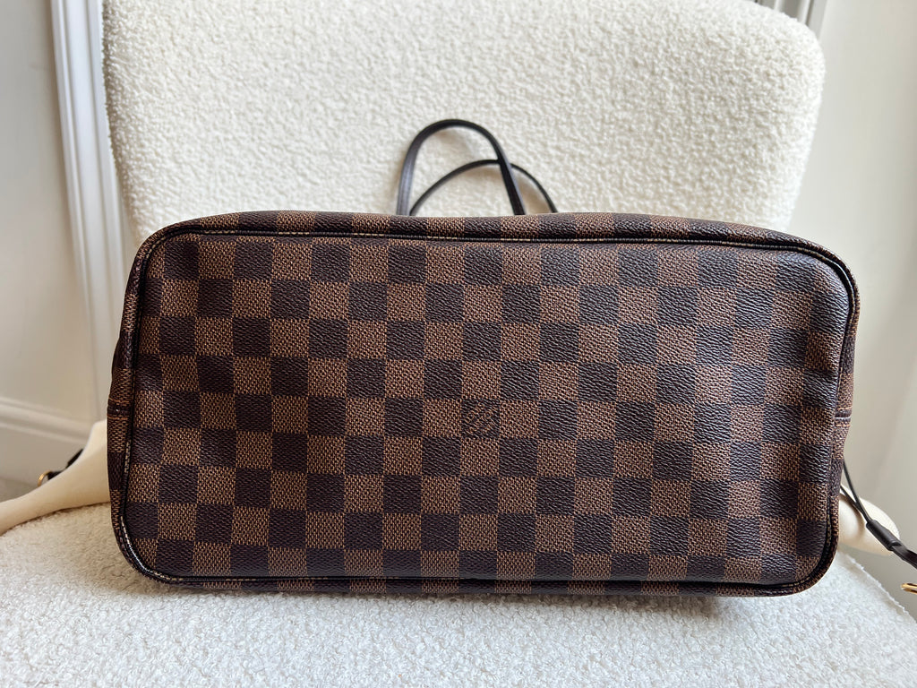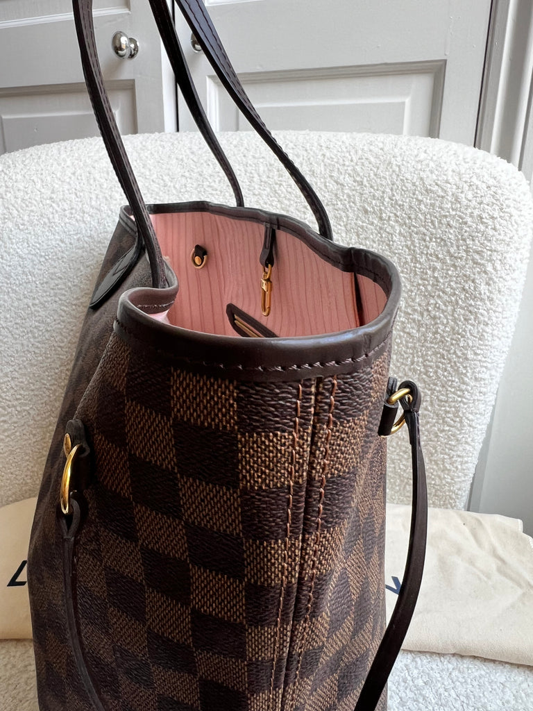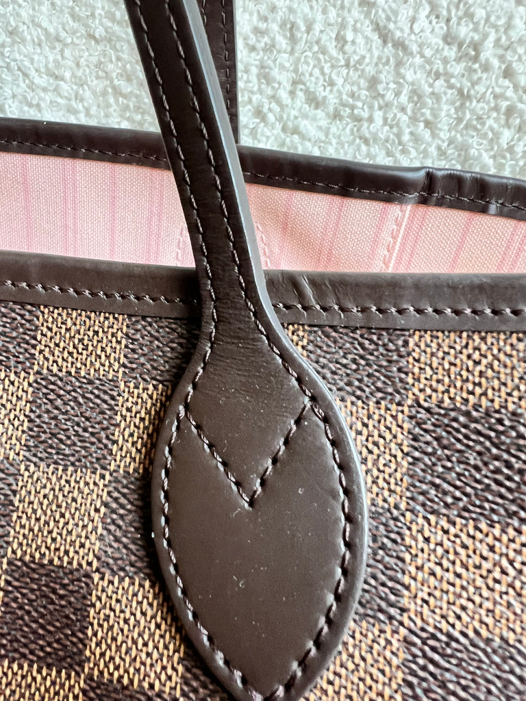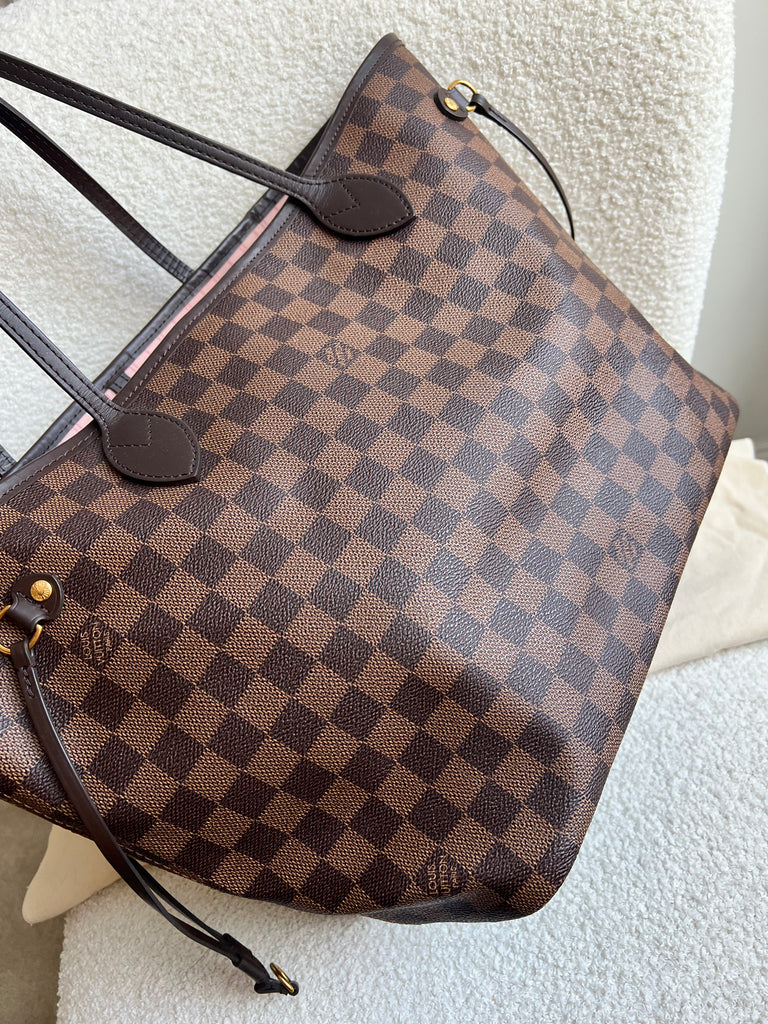 Louis Vuitton Neverfull MM in Damier Ebene with Rose Ballerine Lining. The "middle" size of the Neverfull, this one of Louis Vuitton's most popular style, if not the most popular. Both trendy and chic, ideal for day to day or work use especially as the coated canvas is durable and resilient. Slightly slouchy in shape, this bag can be carried in the crook of the arm or comfortably over shoulder. Note that this item does not come with the removable clutch pouch.