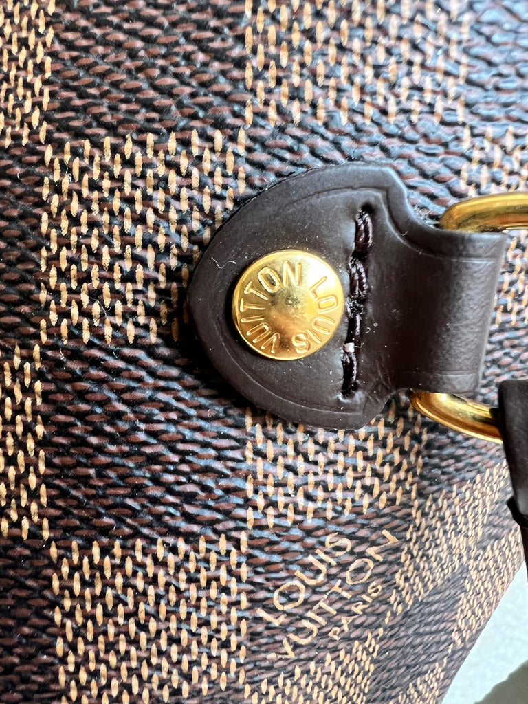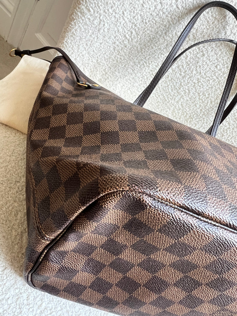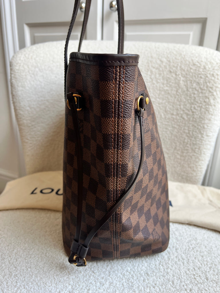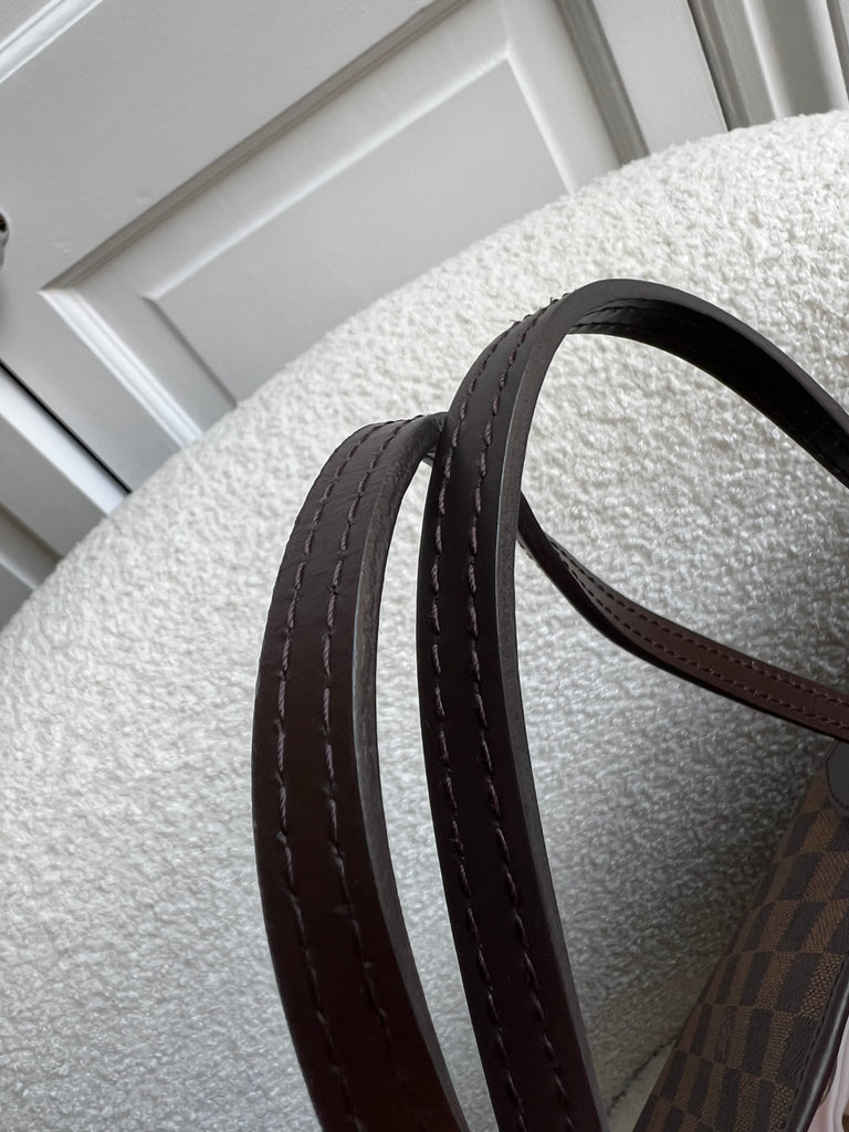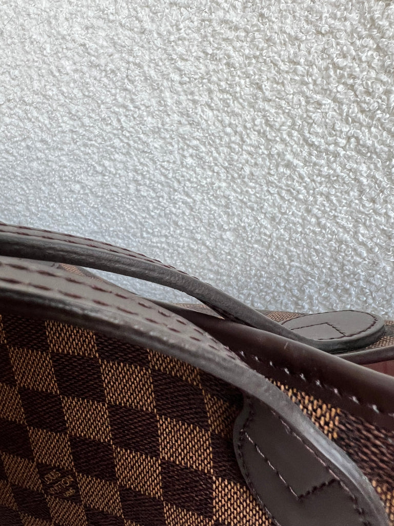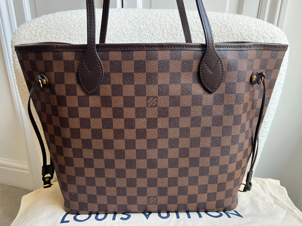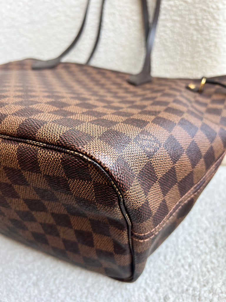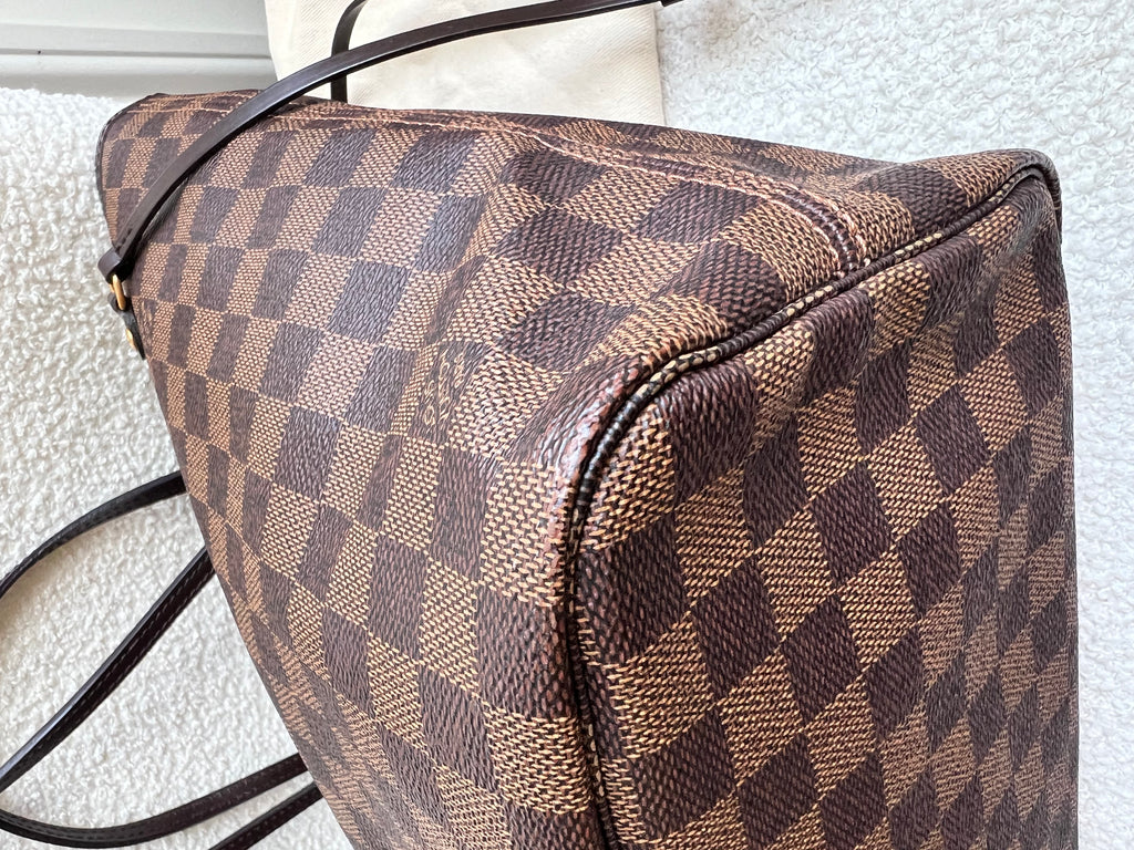 Louis Vuitton Neverfull MM in Damier Ebene with Rose Ballerine Lining. The "middle" size of the Neverfull, this one of Louis Vuitton's most popular style, if not the most popular. Both trendy and chic, ideal for day to day or work use especially as the coated canvas is durable and resilient. Slightly slouchy in shape, this bag can be carried in the crook of the arm or comfortably over shoulder. Note that this item does not come with the removable clutch pouch.